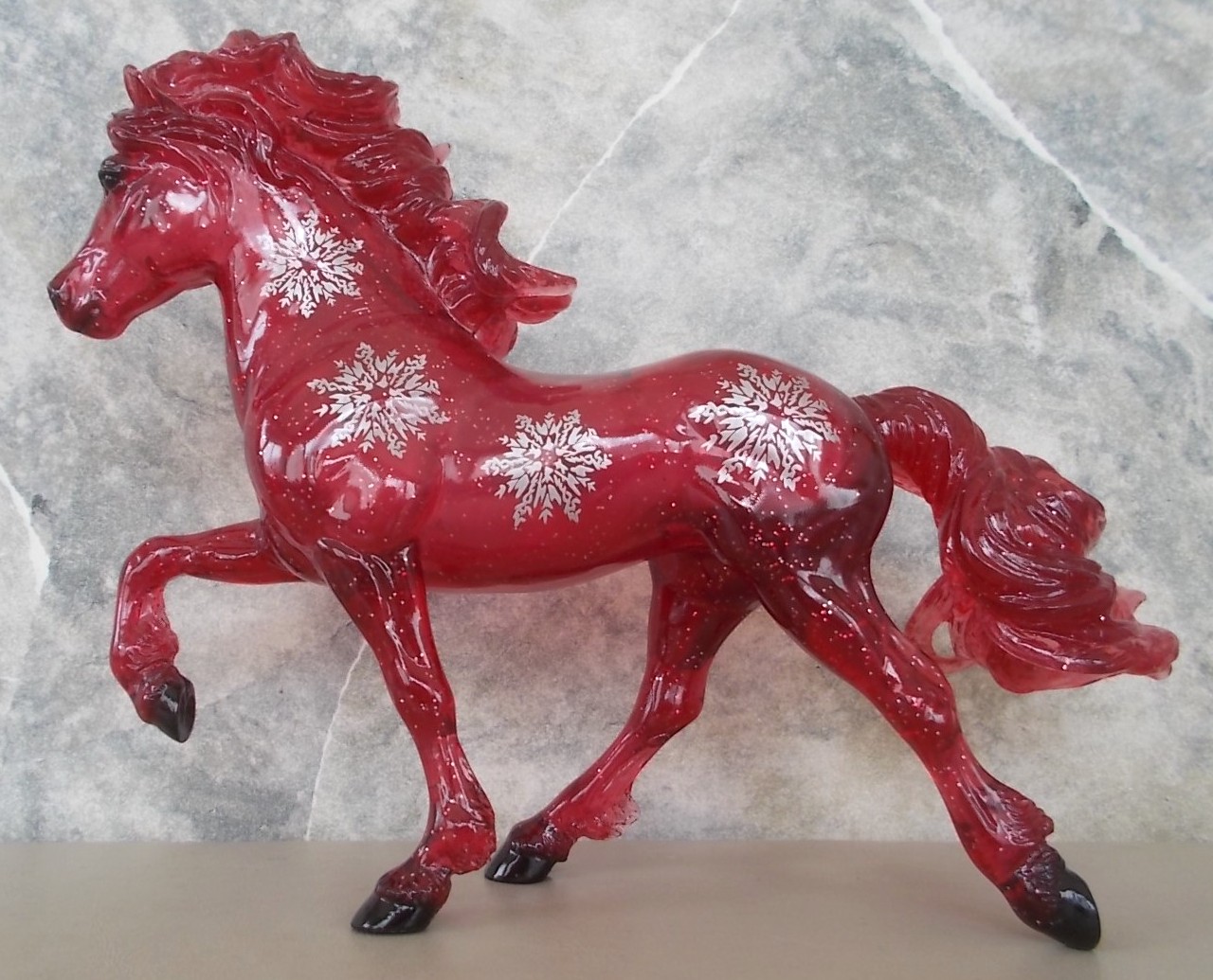 "With a name that means "Christmas" in Icelandic, feisty Icelandic horse Jól is a beautiful homage to the colors of the holiday season and the joys of winter. Captured in an energetic tölt, this Collector Club exclusive features delicate snowflakes on his sides, as well as glitter detailing and a glossy finish. Jól comes in three festive colors. Which color you’ll receive will be a surprise, but each will have you shouting “Gleðileg jól” (Merry Christmas)! Warning: Members on the naughty list may receive one of 12 pieces of “Coal,” a high-gloss, solid black model." www.breyerhorses.com. Jól 2020 Stamp on belly.