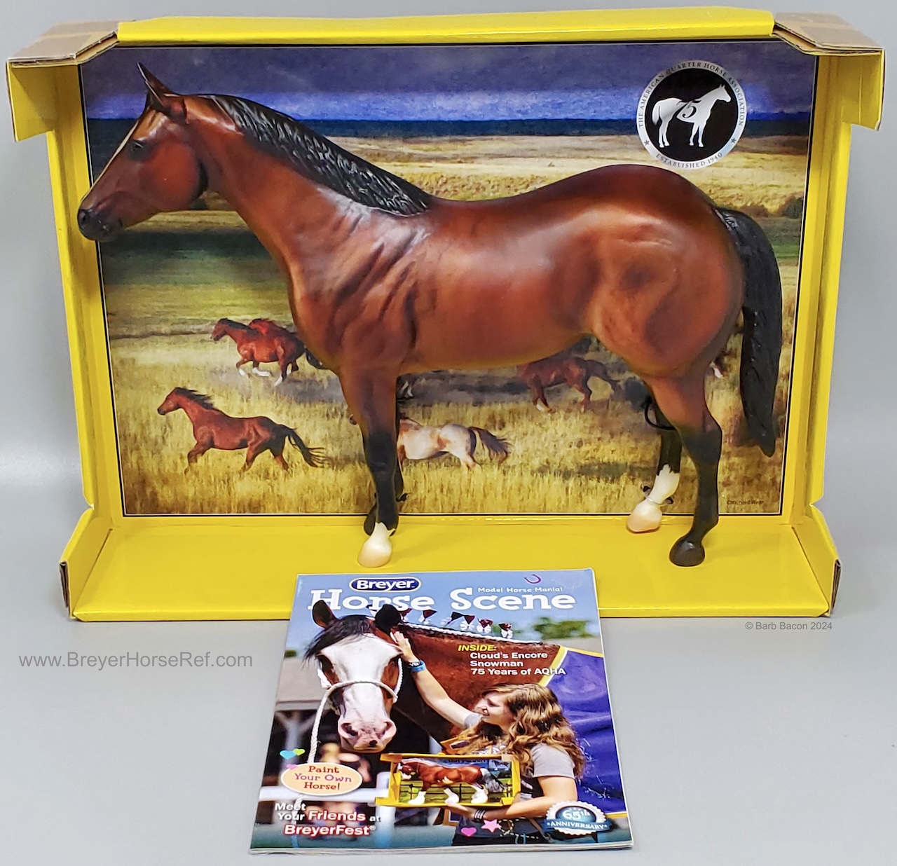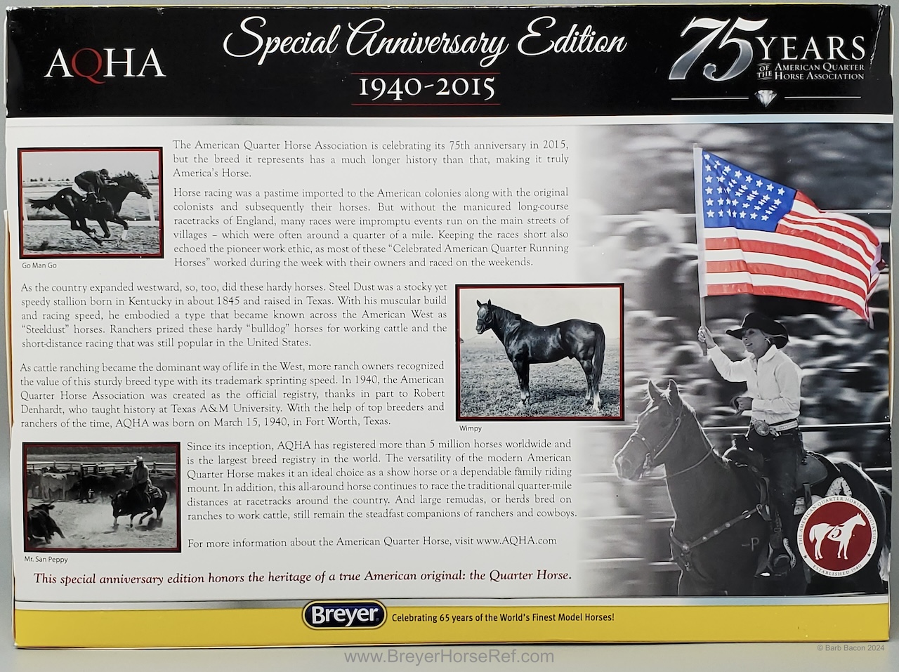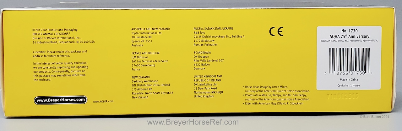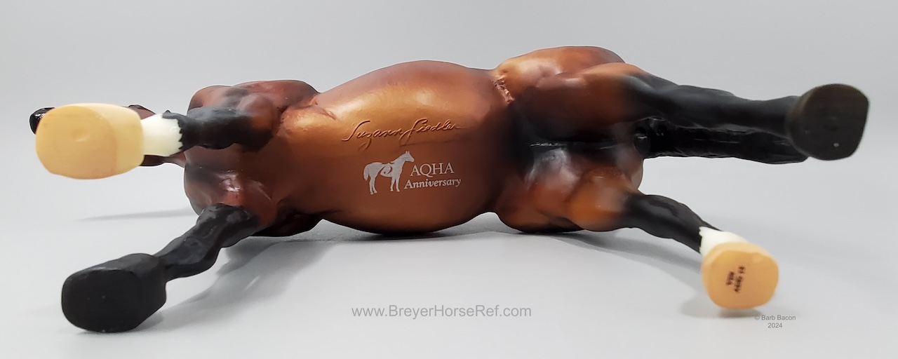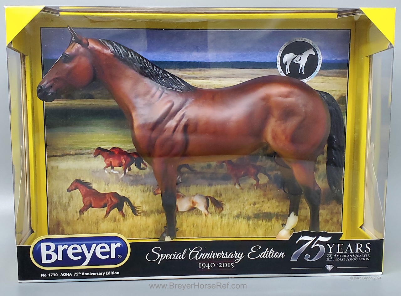 75 AQHA Anniversary Stamp on belly. Advertised in the dealer catalog, but not the box catalog. On the 2015 Retired List.