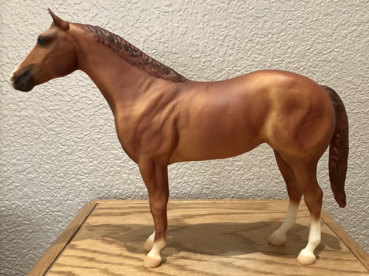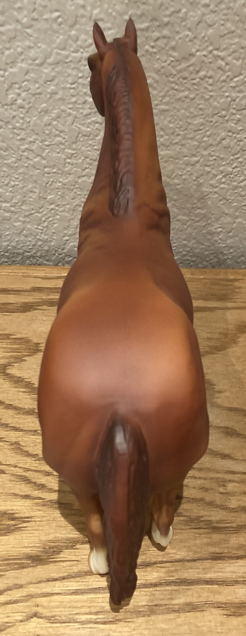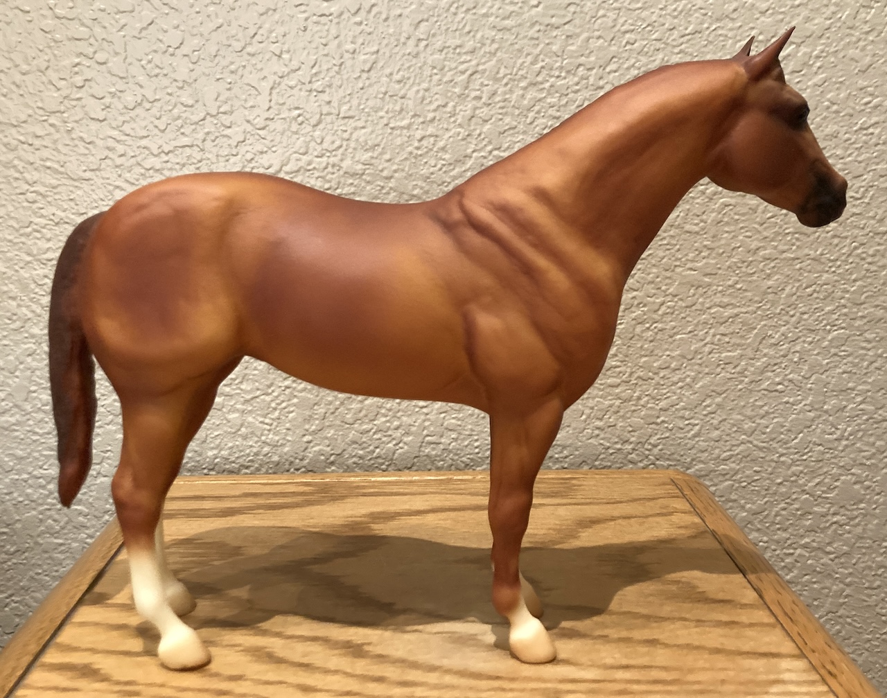'2002' stamped in gold on belly, and 'AQHA 02' mold stamp on back left leg. Released through QVC - unknown model number and quantity. This may be a reissue of #498 with pink hooves, no dorsal stripe, and slightly different blaze.