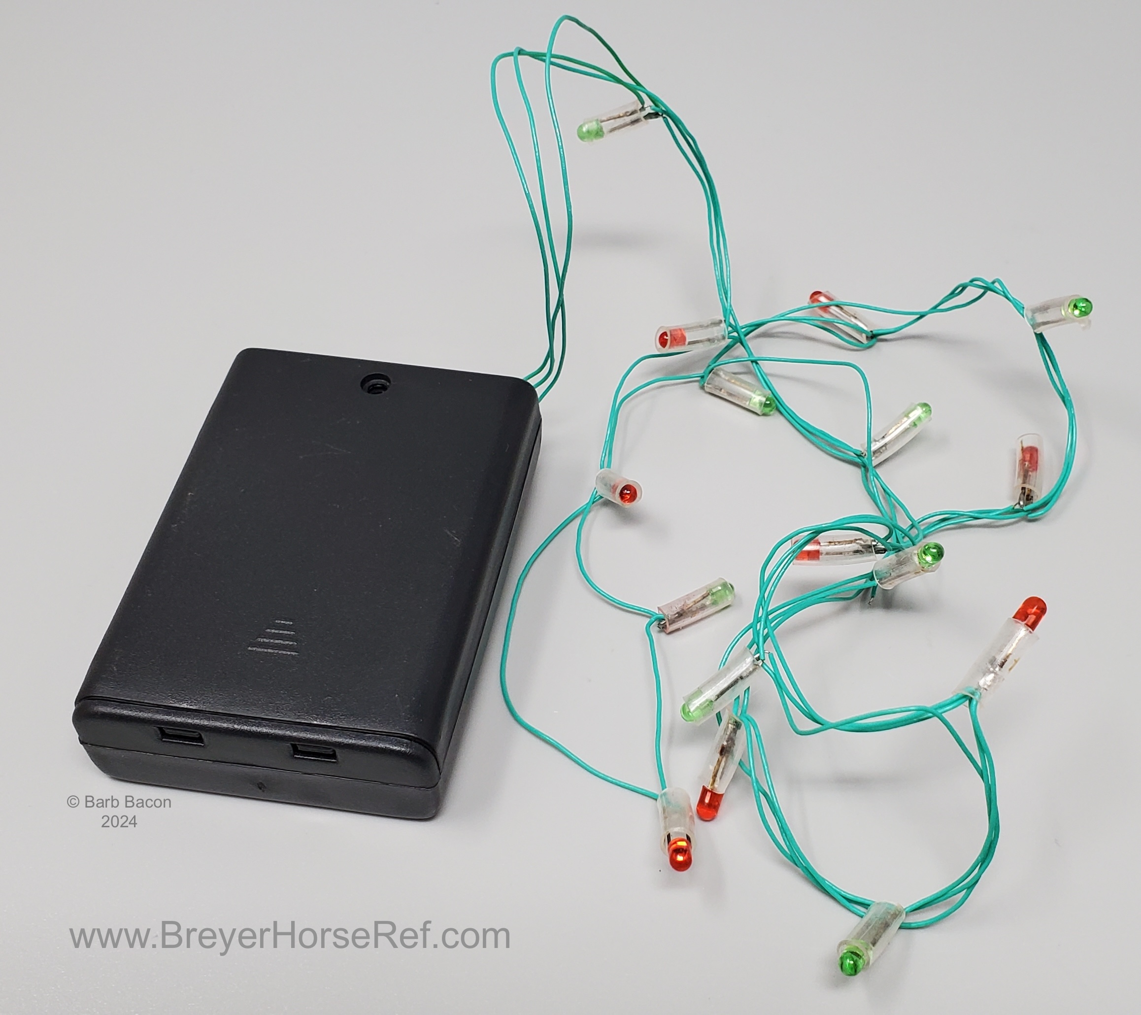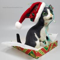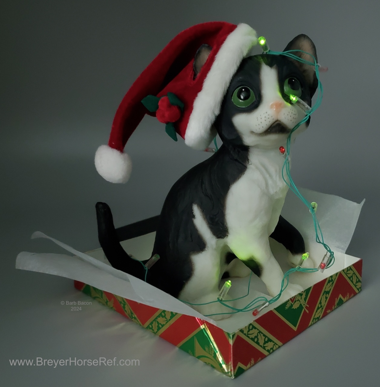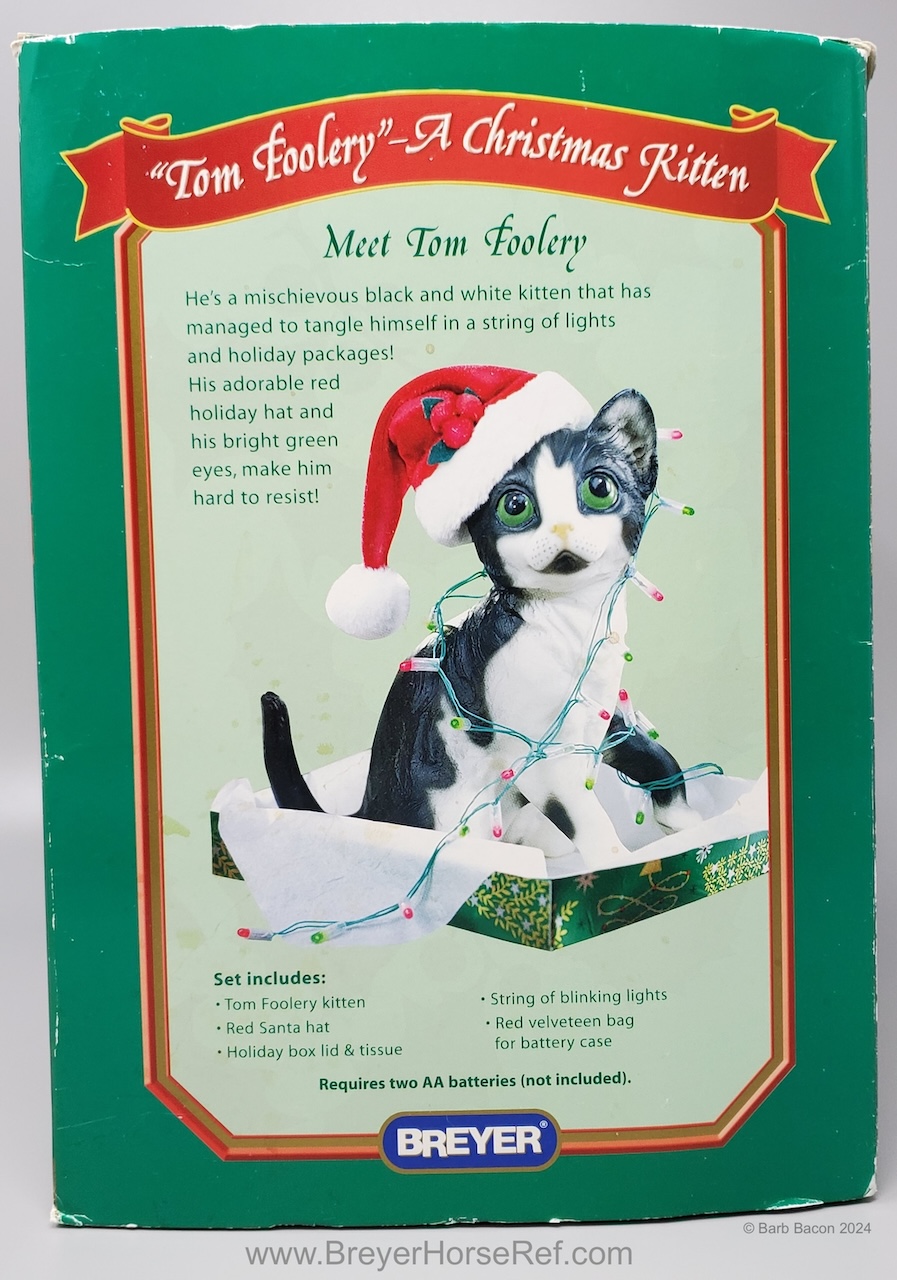 Included Santa hat, working Christmas lights and a decorative box top to look like a present. On the 2003 Retired List.