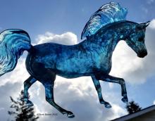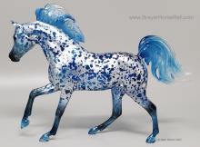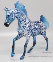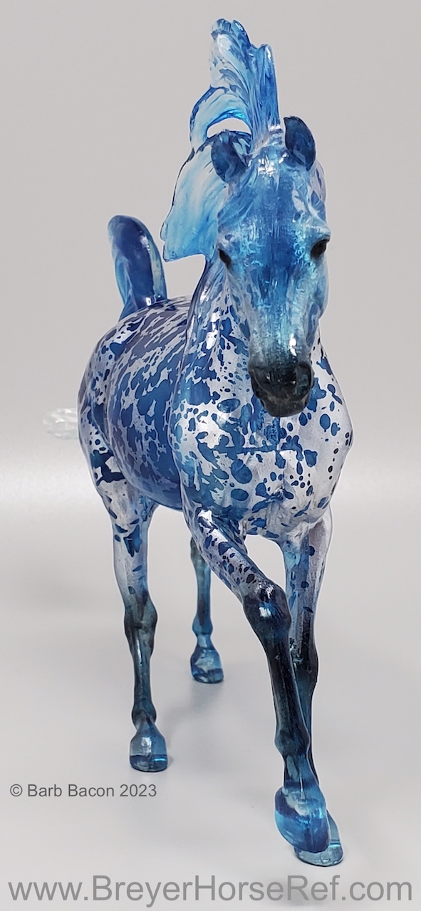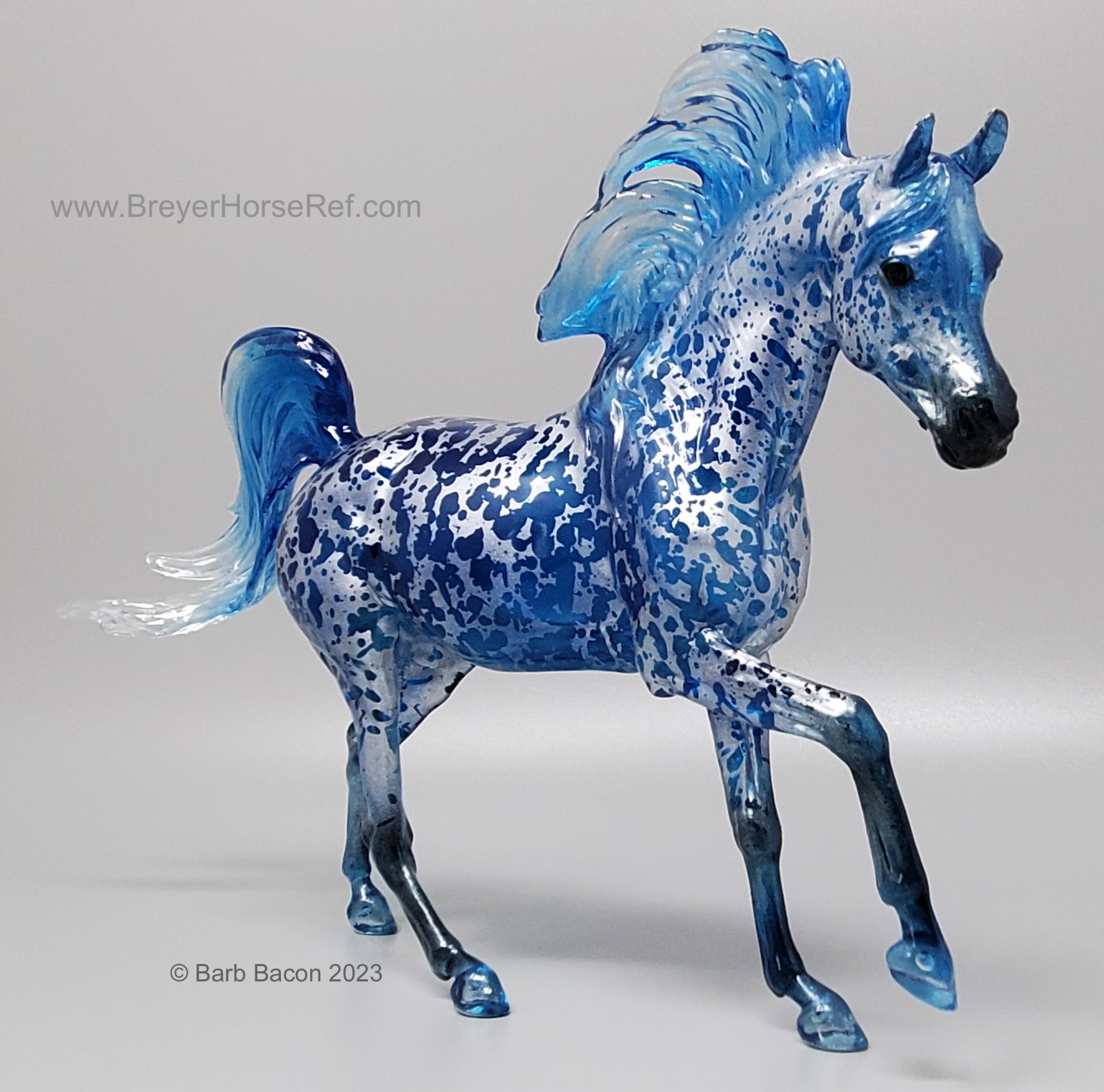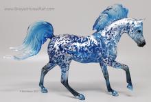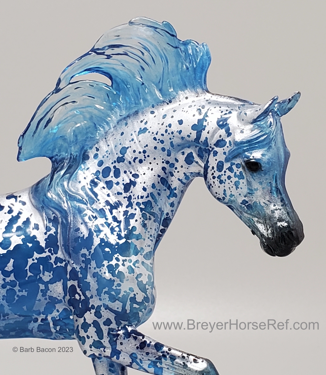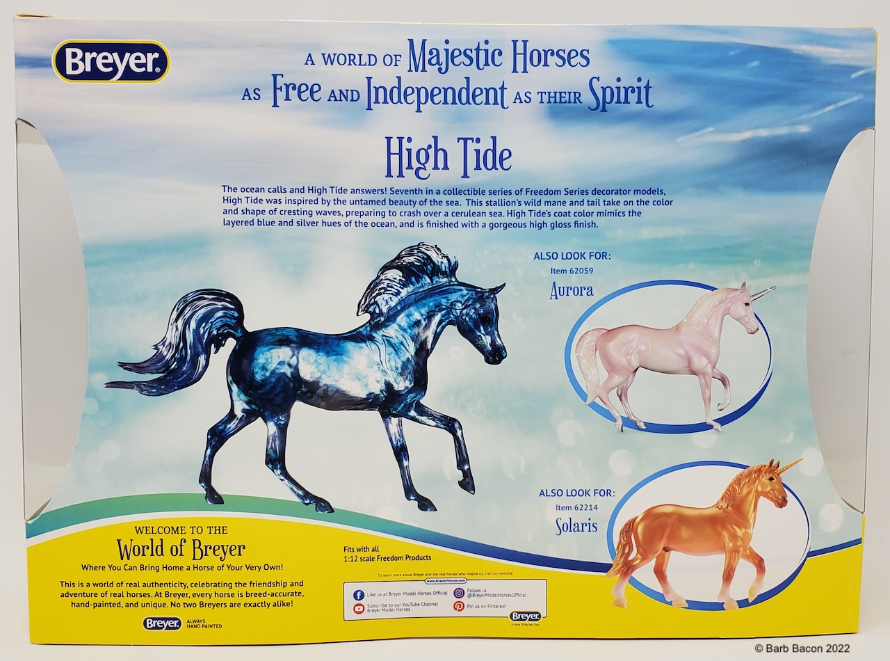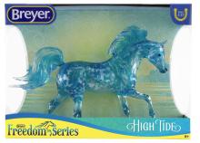"The ocean calls and High Tide answers! Inspired by the untamed beauty of the sea, this stallion’s wild mane and tail take on the color and shape of cresting waves that are preparing to crash over cerulean waters. High Tide’s coat color mimics the layered blue and silver hues of the ocean, and is finished with a gorgeous high gloss finish." www.breyerhorses.com.