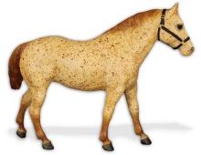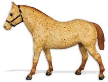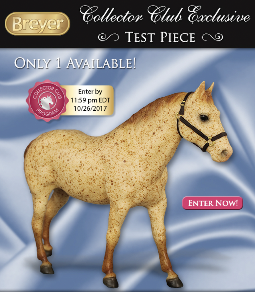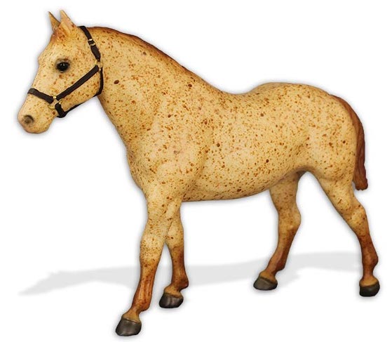 "Breyer test run models are initial decos painted up to see how a particular color might look on a particular sculpture. Or, they may be created to test out a painting technique or new colorway. Not all test run models are used, and they may vary over time as different painting techniques are developed and tested. Test run models are sold as is, with several photos and descriptions of any wear. We’ve decided not to attempt to touch up older test runs as we’ve found that this can alter their character and uniqueness. Each model has a fixed price and interested members enter a random draw for the ability to purchase the test piece. Red, as we've nicknamed him, is a test color Quarter Horse Gelding. He sports a vintage splatter red roan coat reminiscent of 1970's Breyer roans, with a pink muzzle and grey hooves. His halter is hand painted black with gold hardware. Red has been gracing our archive for nearly ten years and he's ready for a change of pace! He is mostly free from flaws. He has a small rub that is hard to see but that can be felt on the point of the right hip. He’s also got a couple of minor hoof edge rubs. Otherwise he’s in great shape and excited about discovering a new home! Red is priced at $850 and comes with a certificate of authenticity. Only 1 piece is available for purchase." www.breyerhorses.com.