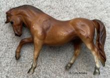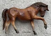 Color varies from a light chestnut to a darker color, with darker mane and tail, 4 or various stockings and a solid face. Originally sculpted by Maureen Love for Hagen-Renaker. Released late in 1975, so not pictured in the catalog.