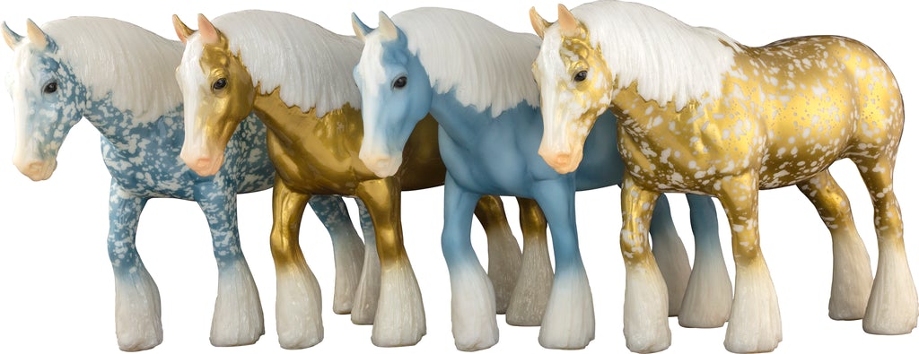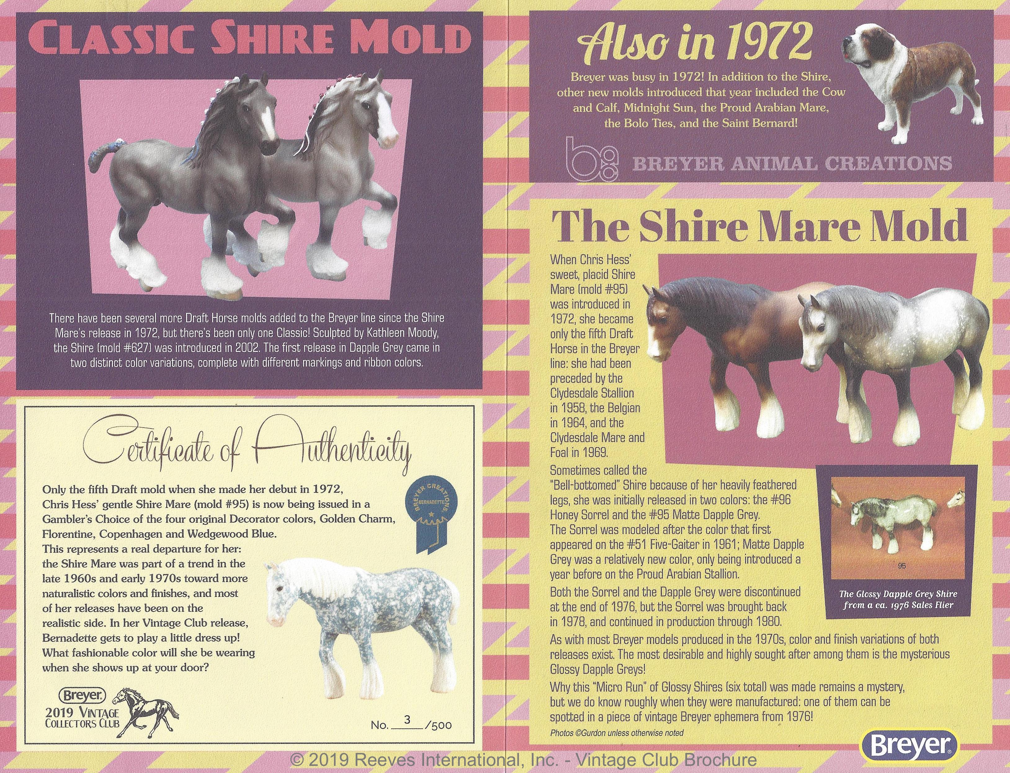 "Introducing Bernadette! Only the fifth Draft mold when she made her debut in 1972, Chris Hess’s gentle Shire Mare is now being issued in a Gambler’s Choice of the four original Decorator colors Golden Charm, Florentine, Copenhagen, and Wedgewood Blue. This represents a real departure for her: the Shire Mare was part of a trend in the late 1960s and early 1970s toward more naturalistic colors and finishes, and most of her releases have been on the realistic side. In her 2019 Vintage Club release, she gets to play a little dress up! And in a first for the Vintage Club, Bernadette comes in a full recreation of the elusive 1969 “touchability box!” Includes booklet and certificate of authenticity.” www.breyerhorses.com. 2019 Vintage Collectors Club Stamp on belly.