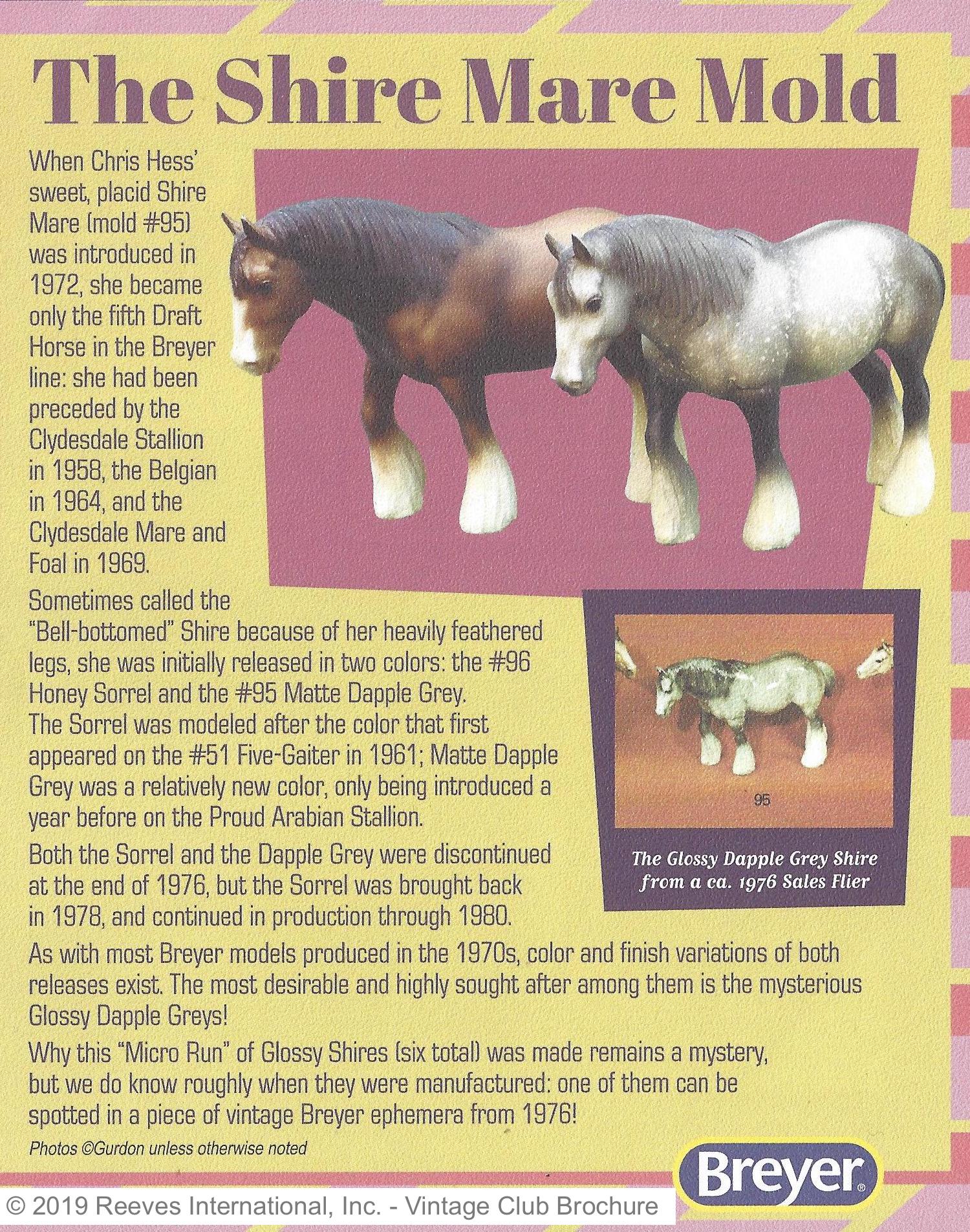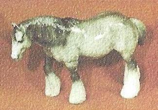 Dapple Grey with darker mane and tail, white feathers, dorsal stripe, light grey face with grey nose and ears, and few dapples on the head. Only six known to exist and some or all may be chalky with a white base coat and white painted feathers.