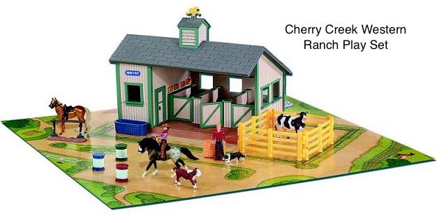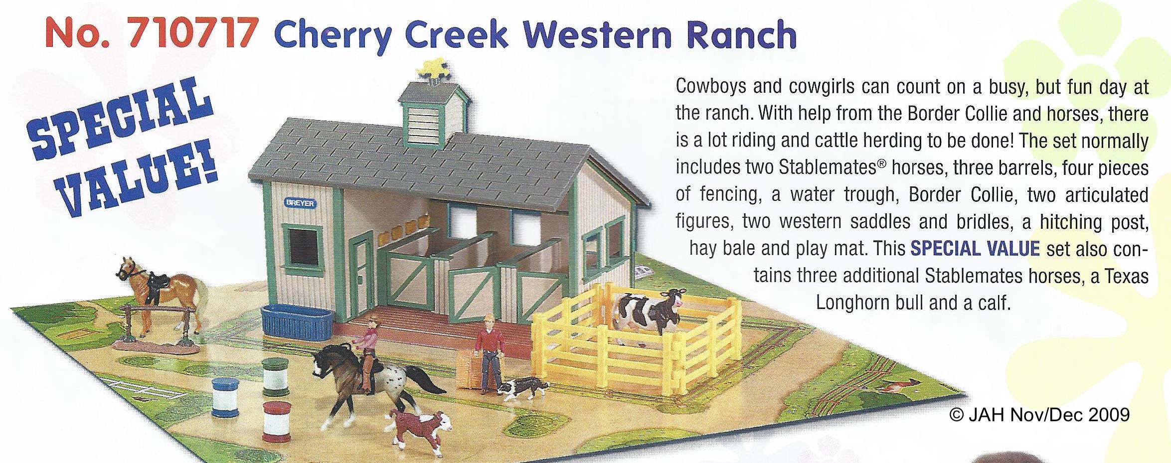 In 2009, this model was part of the Cherry Creek Western Ranch Set #710717. This set included the Cantering Warmblood, Standing Stock Horse, 3 barrels, 4 pieces of fencing, water trough, Border Collie, Cow, Calf, 2 dolls, 2 sets of western tack, hitching post, hay bale and play mat. The special edition from Mid States stores included 3 additional Stablemates (need info on which ones), a Longhorn Bull and Calf.