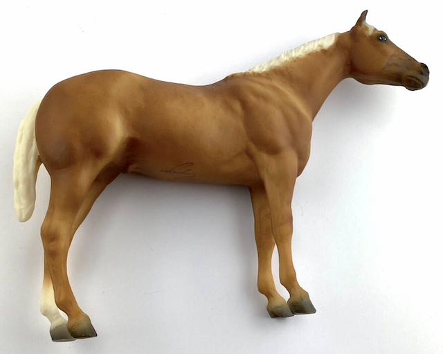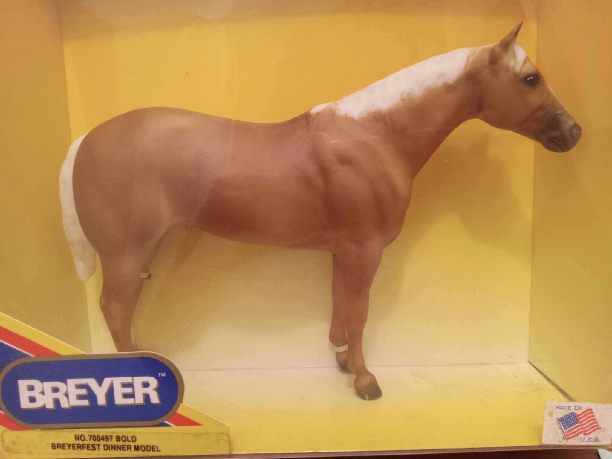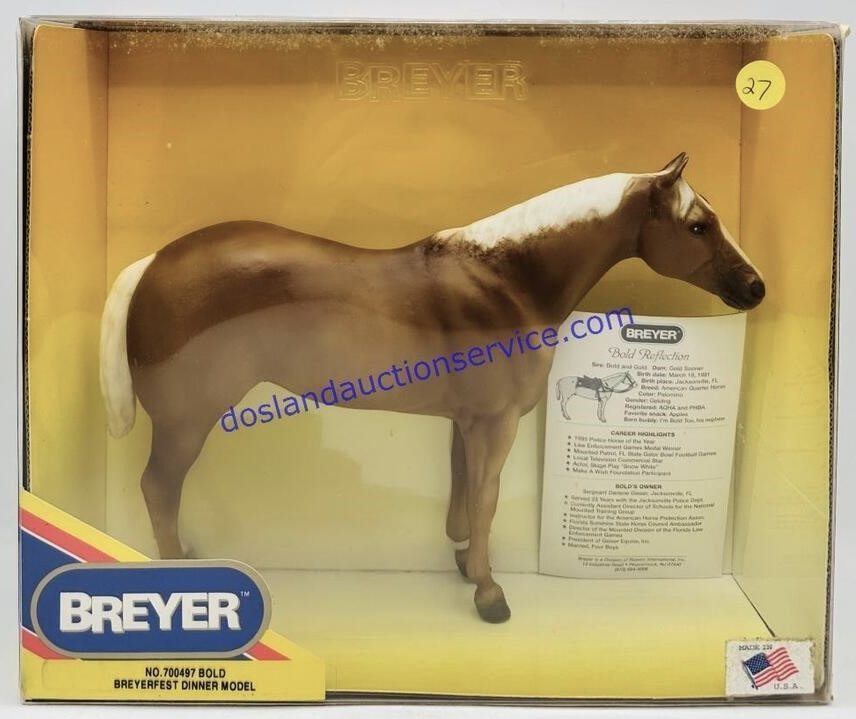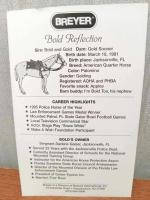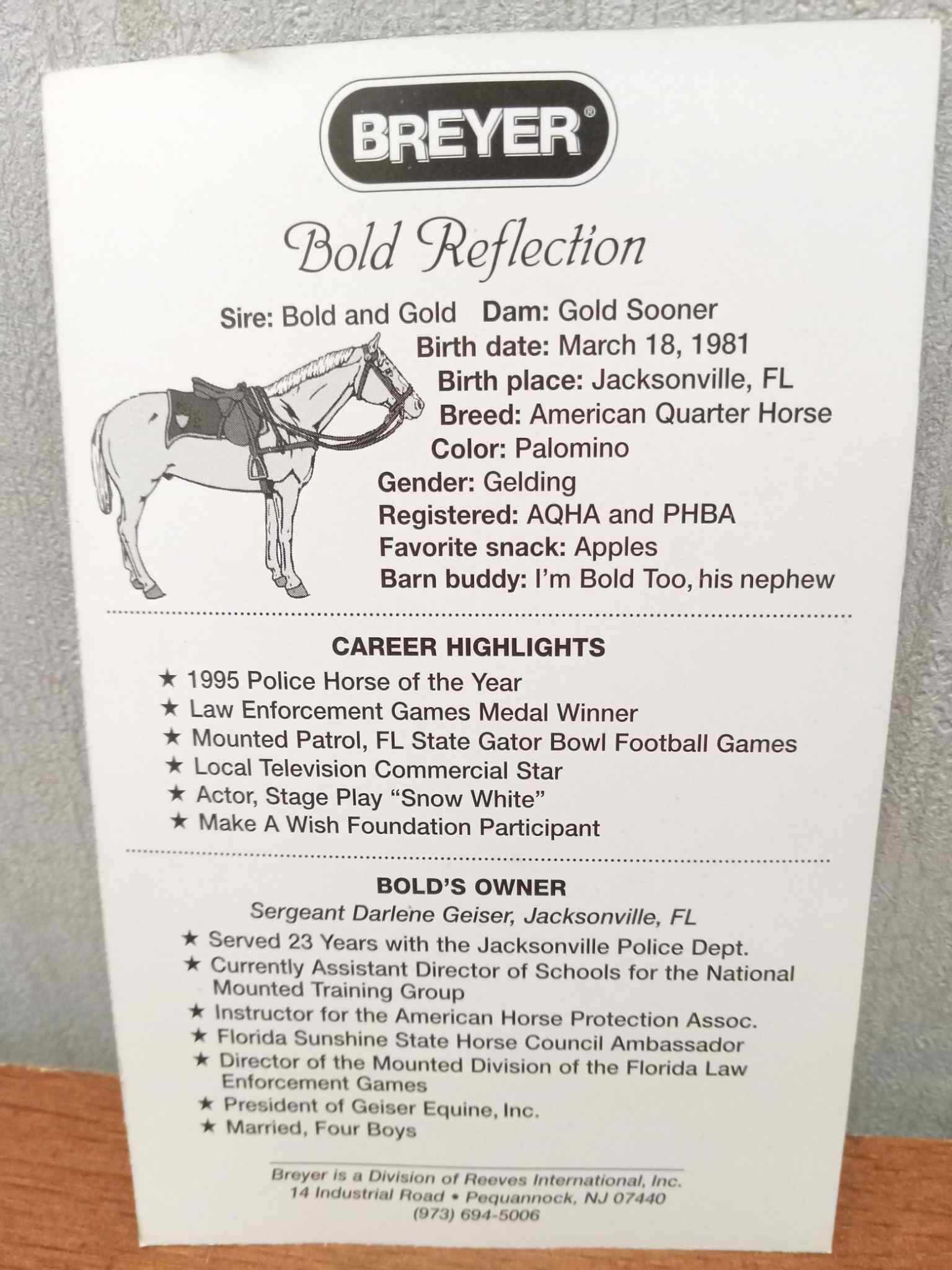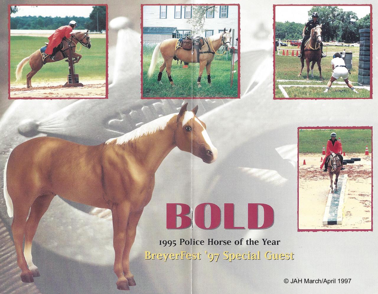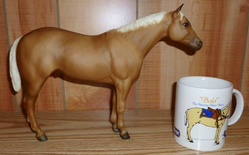 Palomino with blaze and tricolor eyes. Portrait of Police Horse of the Year 1995 Bold Reflection owned by Sergeant Darlene Geiser. Some models are signed by her. BreyerFest Celebration Horse. Came with a coffee mug that was designed by Sheryl Leisure.