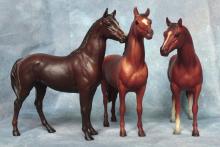 This set included Affirmed (chestnut Man O'War), Seattle Slew (dark chestnut Swaps) and Secretariat (red chestnut Terrang). This set was made for Hobby Center Toys in OH. 1000 sets made.
