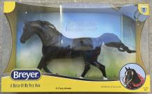 "Arabians are one of the most popular breeds, and this stunning black stallion’s ebony coat and white markings are breathtaking! Champion Arabian stallion KB Omega Fahim++++// has earned the Legion of Masters Excellence from the Arabian Horse Association (AHA) by winning 300 or more points in-hand and performance. Incredibly versatile, Omega earned his points in dressage, in-hand, endurance, sport horse show hack, and sport horse under saddle." www.breyerhorses.com. This run was modified as a Gelding.