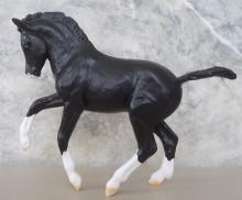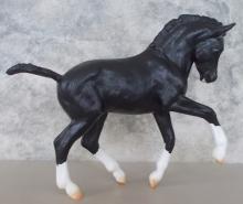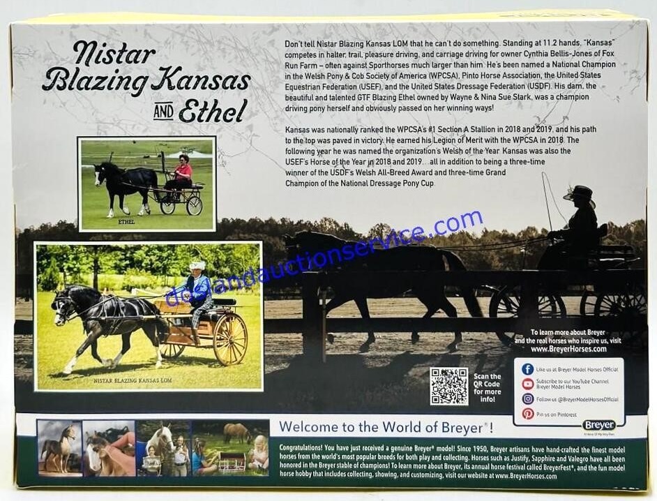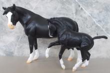 "Nistar Blazing Kansas LOM & GTF Blazing Ethel are a Welsh Pony mare and foal set that are sure to delight. Depicted in this set as a young foal, "Kansas" is now a stallion with accolades including being named the 2019 Welsh Pony & Cob Society of America's "Welsh of the Year." His dam, Ethel, also shares her foal's black-with-chrome coloring and was a champion driving pony in her own right." www.breyerhorses.com. On the 2025 Retired List.