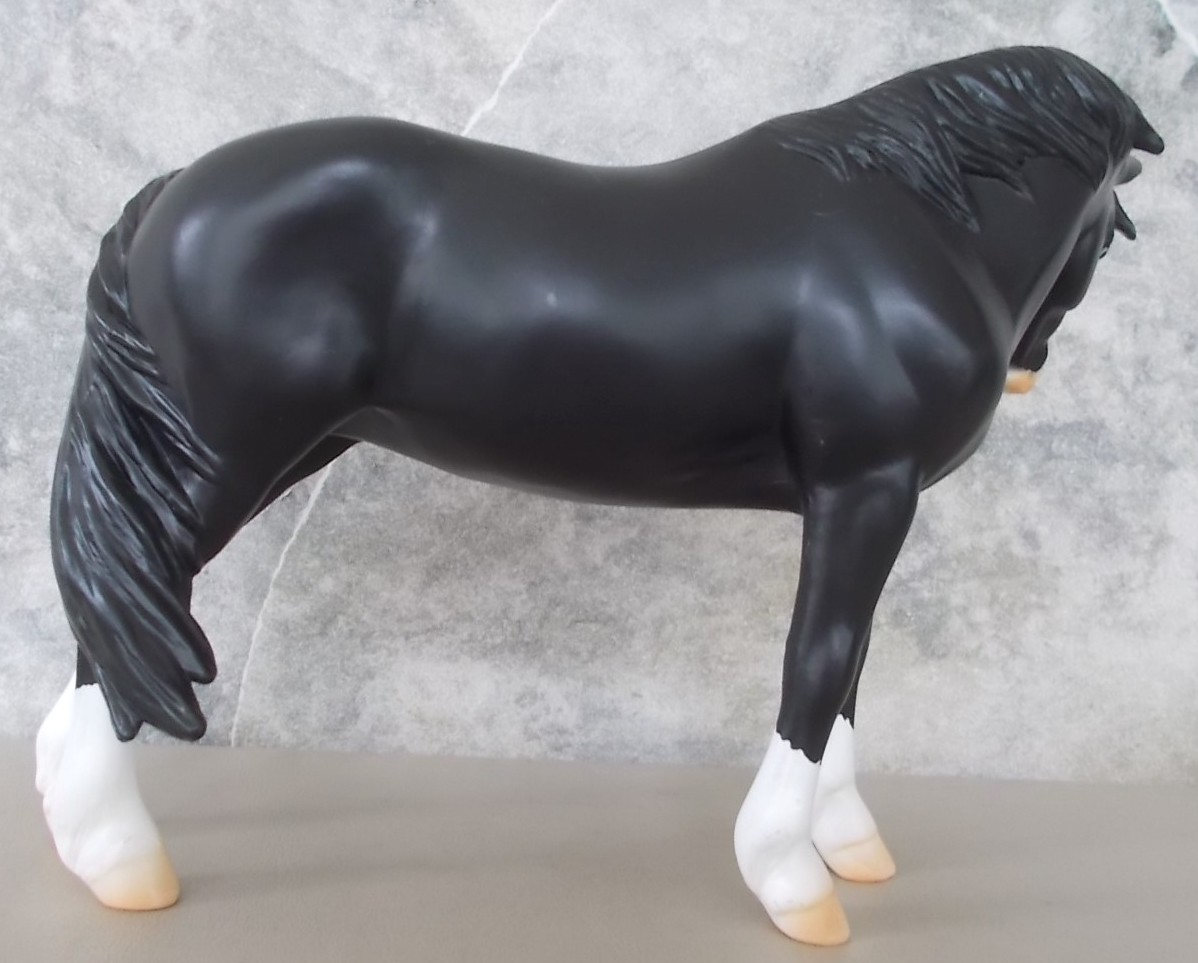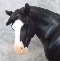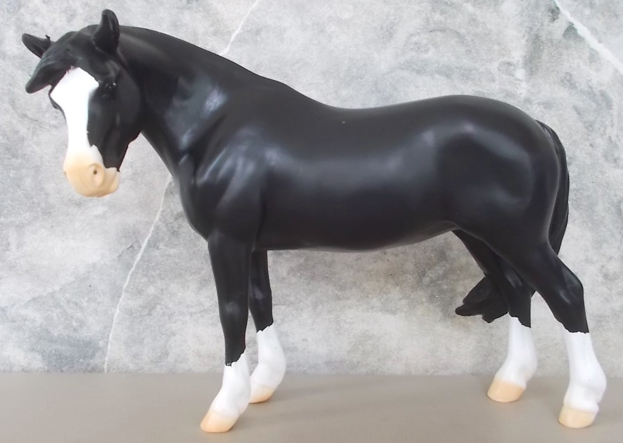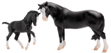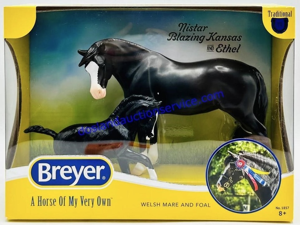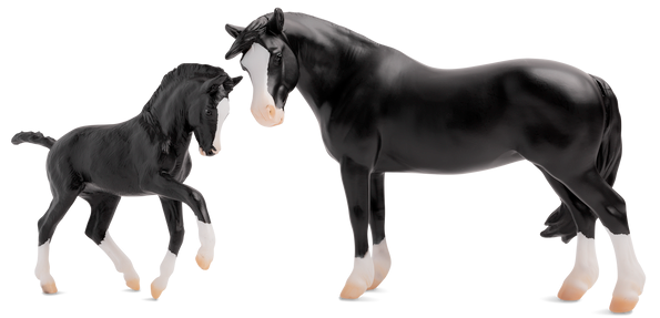 "Nistar Blazing Kansas LOM & GTF Blazing Ethel are a Welsh Pony mare and foal set that are sure to delight. Depicted in this set as a young foal, "Kansas" is now a stallion with accolades including being named the 2019 Welsh Pony & Cob Society of America's "Welsh of the Year." His dam, Ethel, also shares her foal's black-with-chrome coloring and was a champion driving pony in her own right." www.breyerhorses.com. On the 2025 Retired List.