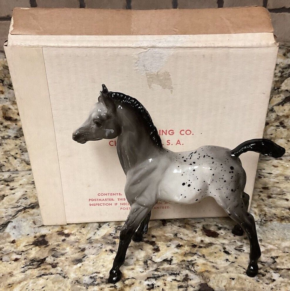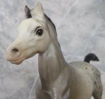 Grey Appaloosa with black splatter spots, black mane and tail, dark charcoal or black legs, and bald face with grey or pink nose and ears. Early models (estimated 1960-1961) had a 'big blanket' pattern where the white includes the belly and butt. There was a more common 'belly striped' variation found on glossy models (estimated 1961-1967) that had the white blanket wrapping around the belly with a grey butt and hindquarters. The 'small blanket' variation (estimated 1967-1970) was found on both matte and glossy models, and had a smaller blanket where the white is just on the rump and down the back legs. Spots varied in size and amount. The name 'Spot' was dropped by the 1969 catalog. Models were advertised in a matte finish in the later 1968 catalog.