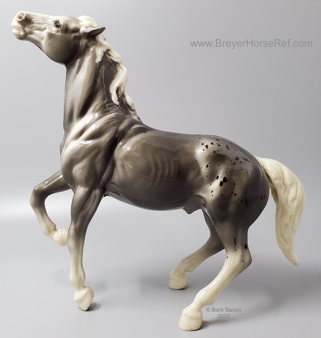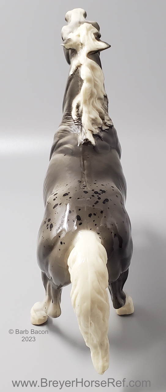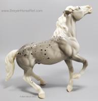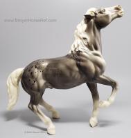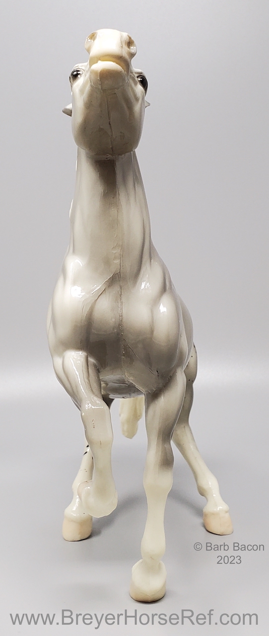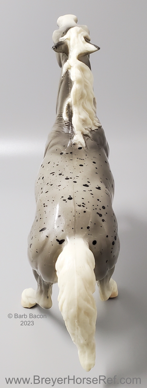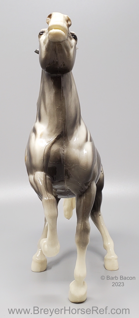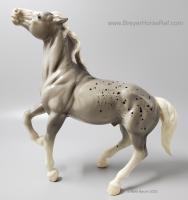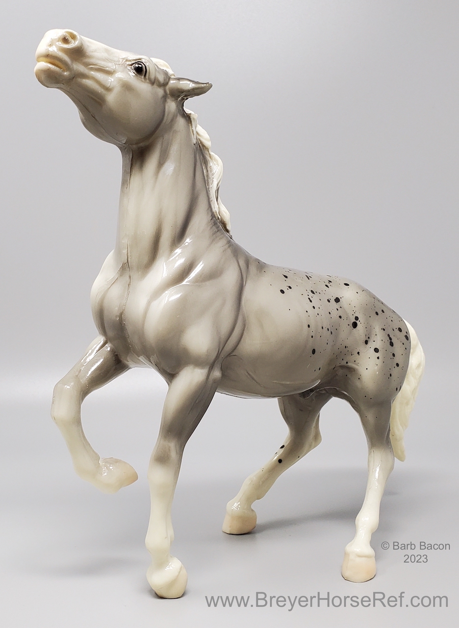 Glossy Grey Appaloosa with white mane and tail, pink hooves and bald face. Grey shading varies from light to dark grey, and spots can vary. The left front foot has been pared down to help with stability. From 1961-1968, this mold was called 'Diablo - The Mustang'.