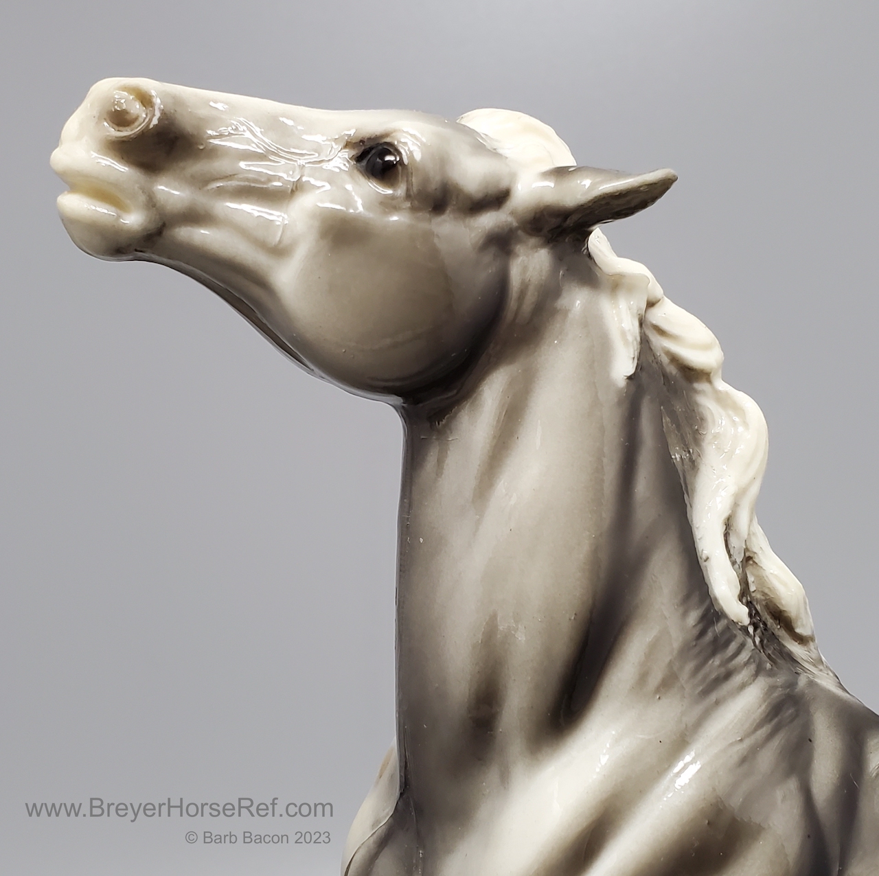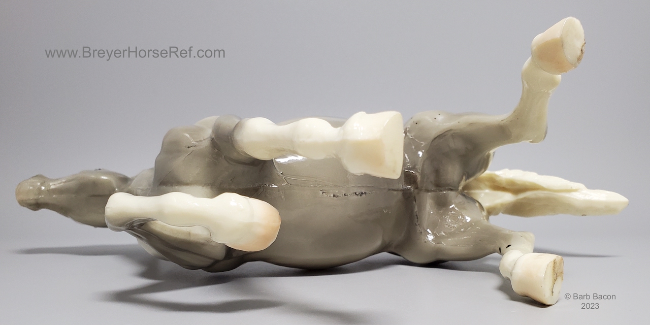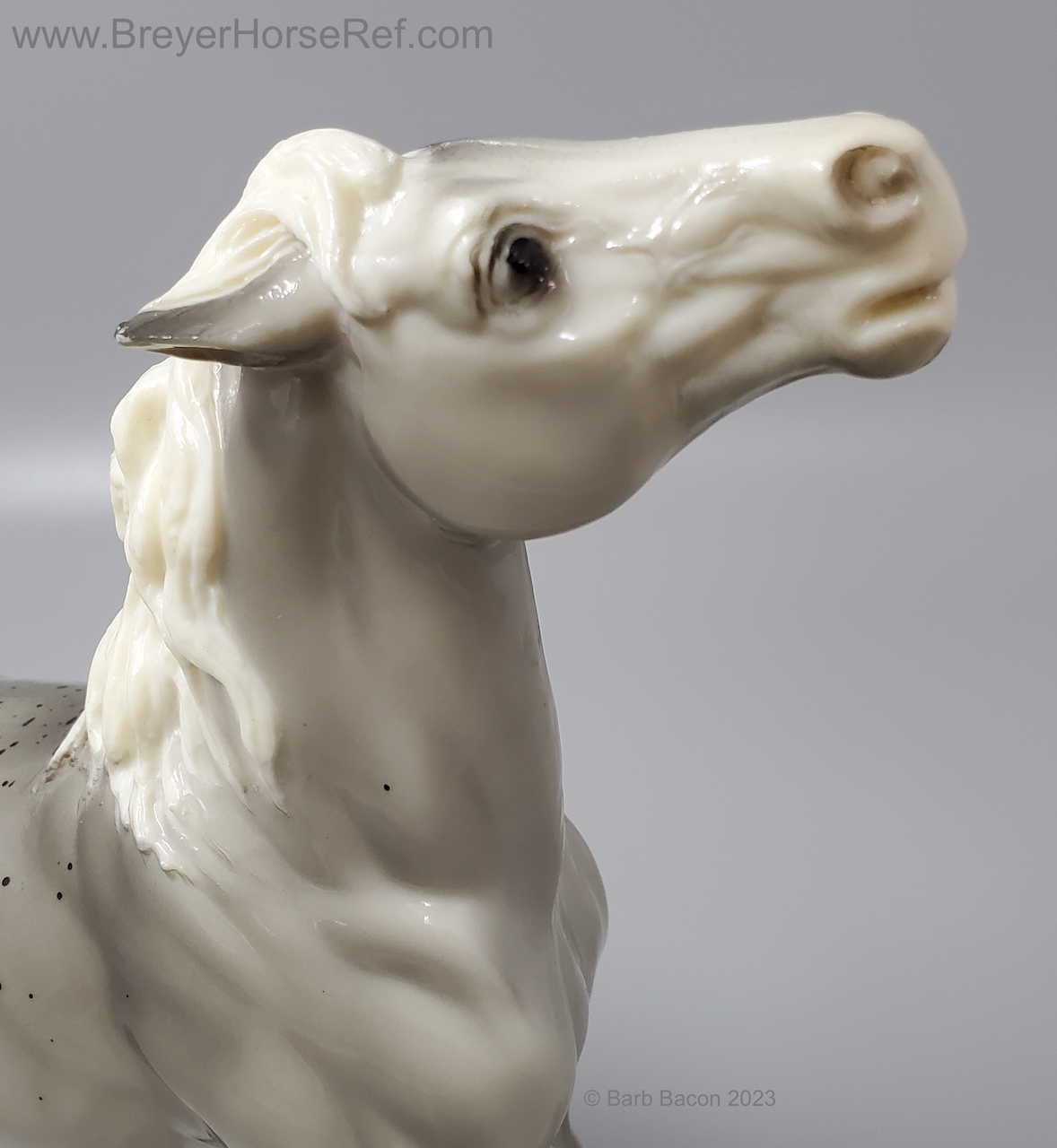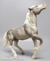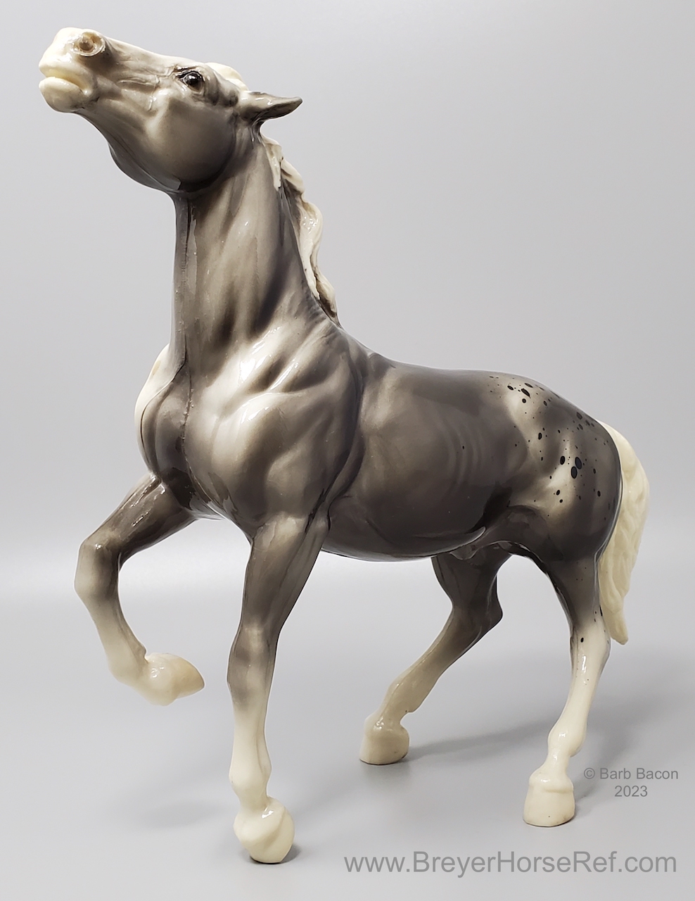Glossy Grey Appaloosa with white mane and tail, pink hooves and bald face. Grey shading varies from light to dark grey, and spots can vary. The left front foot has been pared down to help with stability. From 1961-1968, this mold was called 'Diablo - The Mustang'.