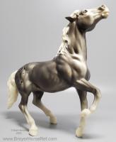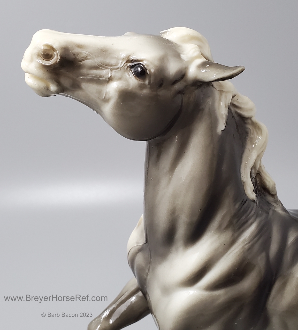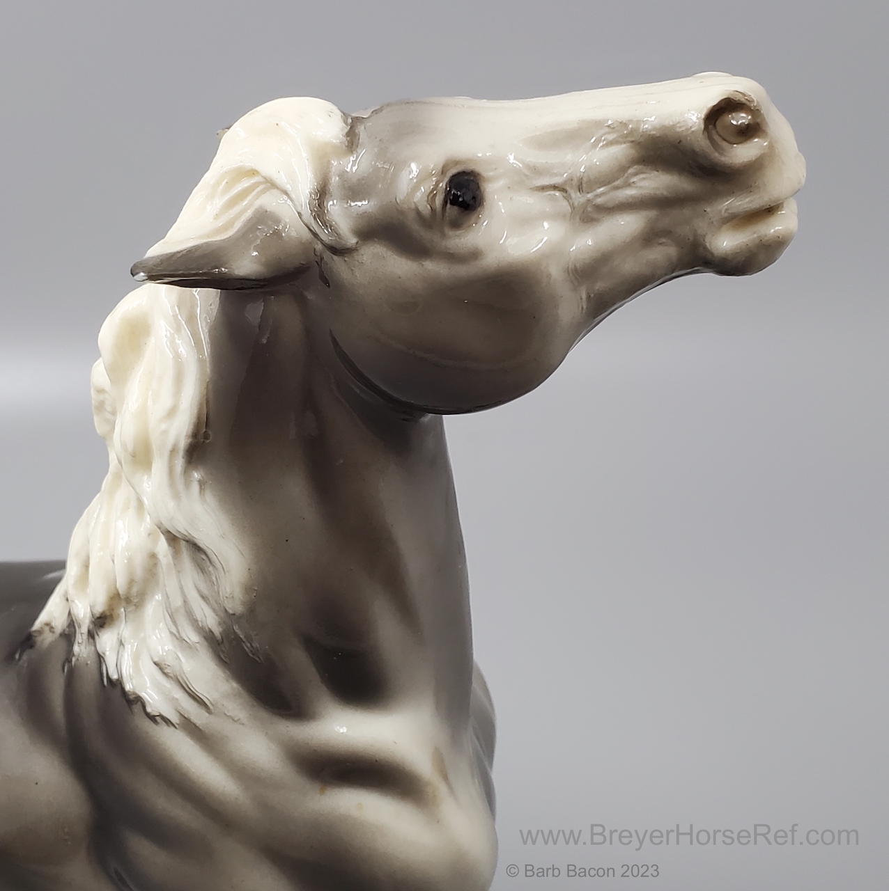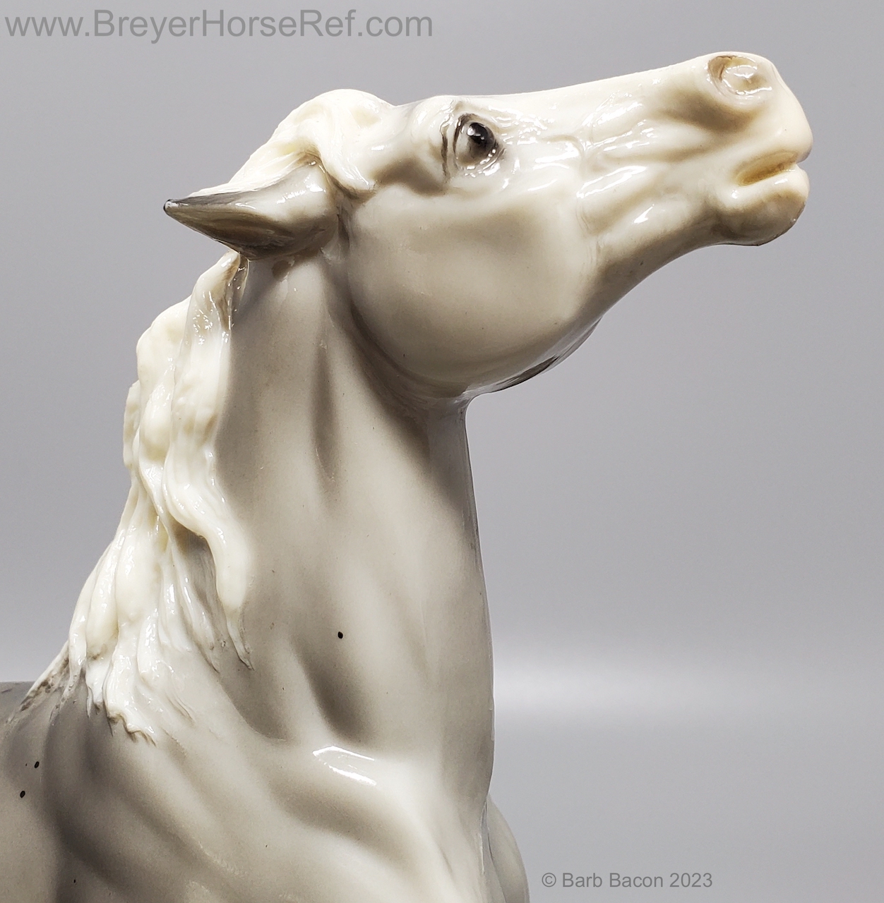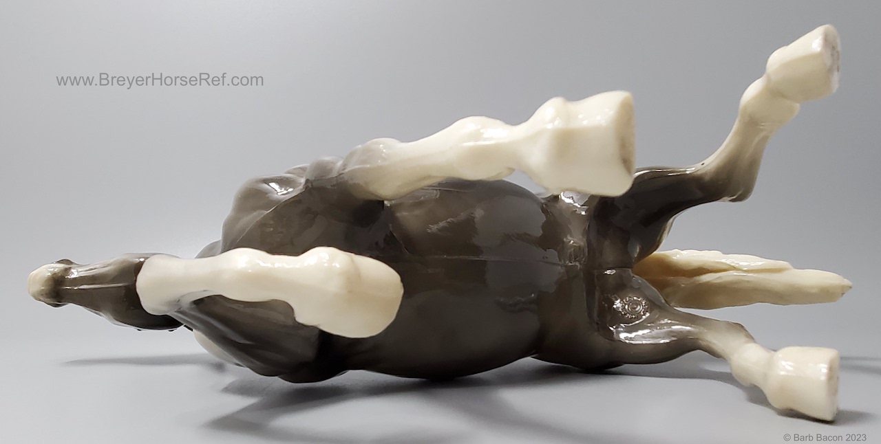 Glossy Grey Appaloosa with white mane and tail, pink hooves and bald face. Grey shading varies from light to dark grey, and spots can vary. The left front foot has been pared down to help with stability. From 1961-1968, this mold was called 'Diablo - The Mustang'.