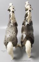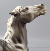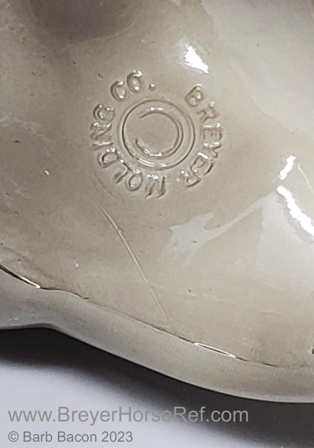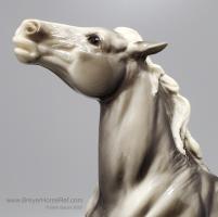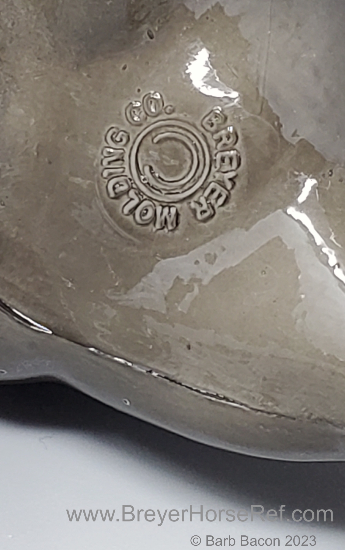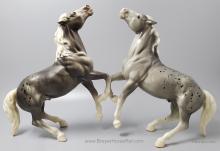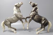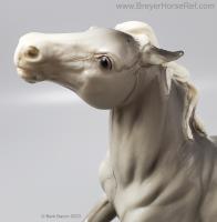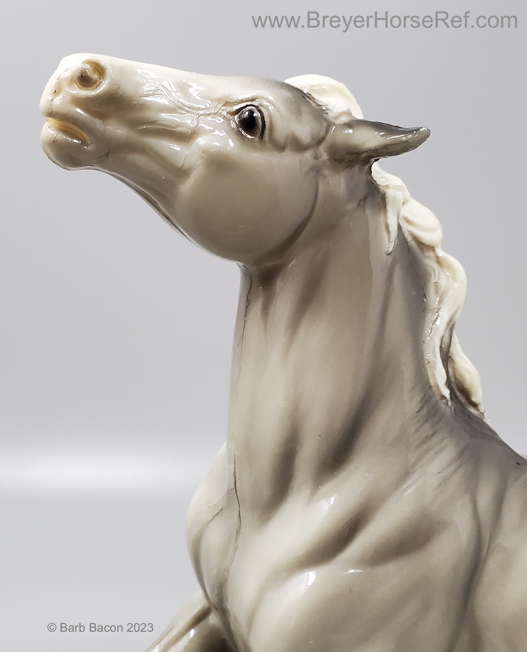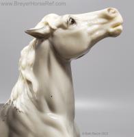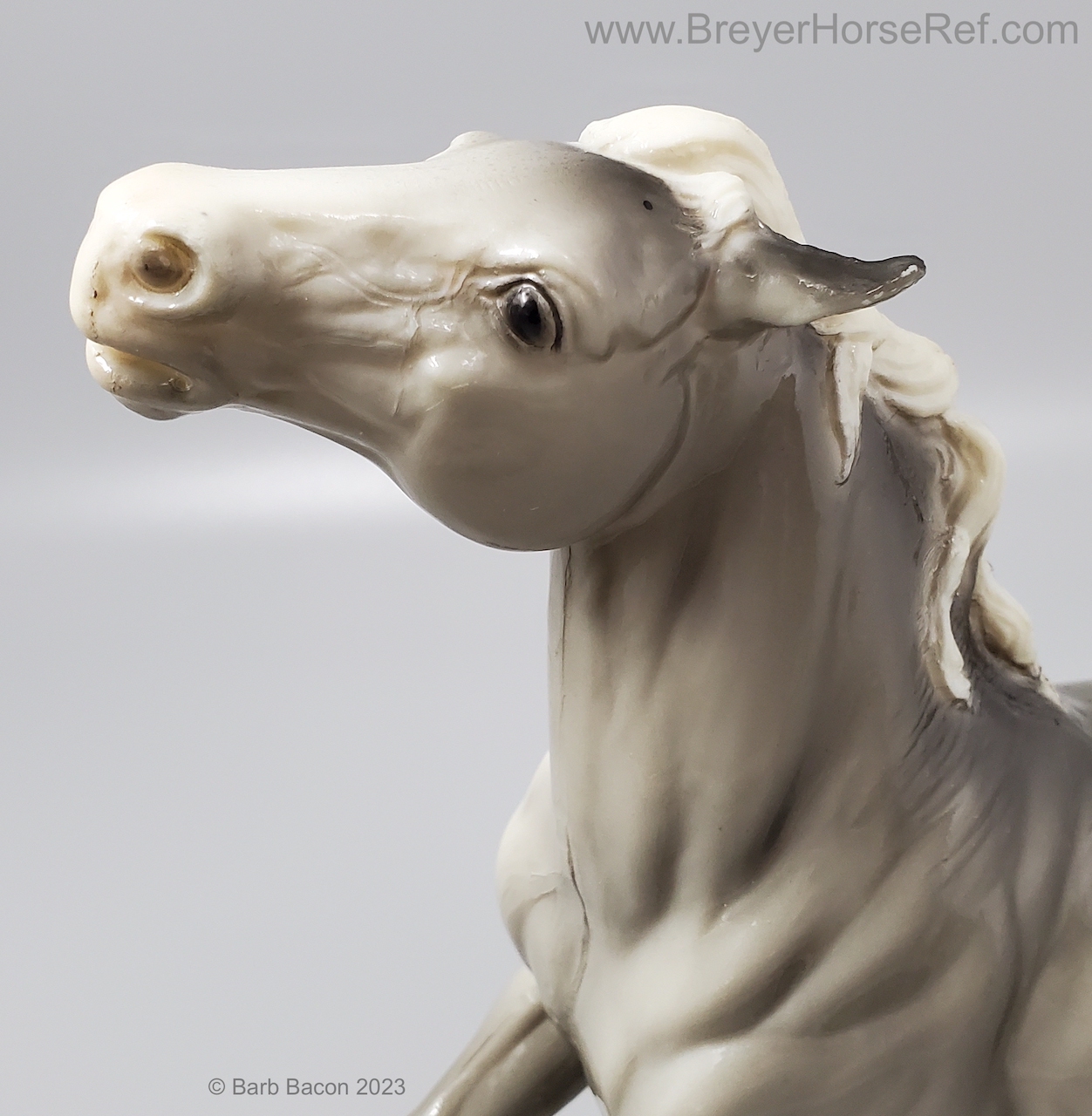 Glossy Grey Appaloosa with white mane and tail, pink hooves and bald face. Grey shading varies from light to dark grey, and spots can vary. The left front foot has been pared down to help with stability. From 1961-1968, this mold was called 'Diablo - The Mustang'.