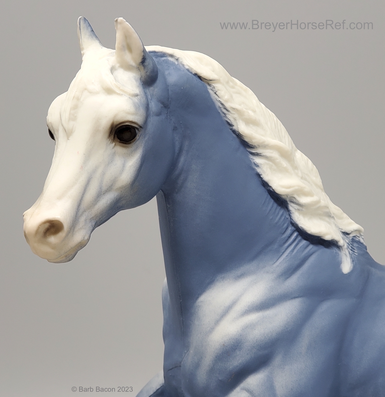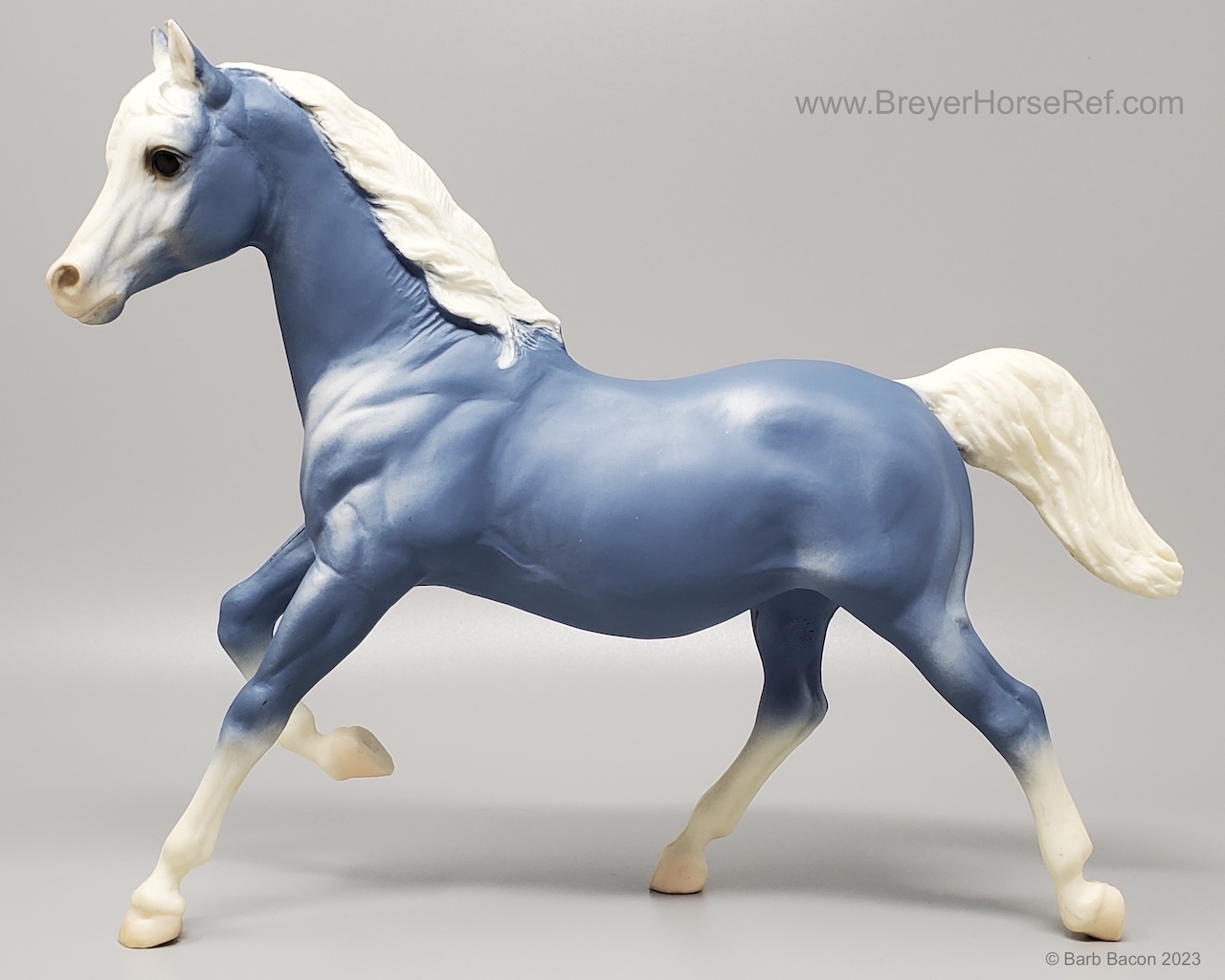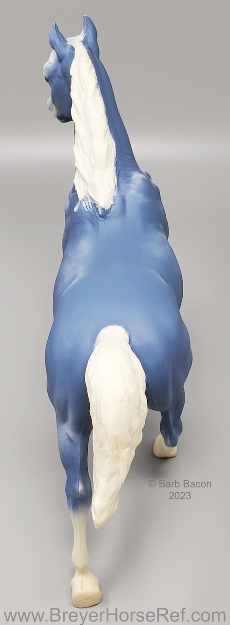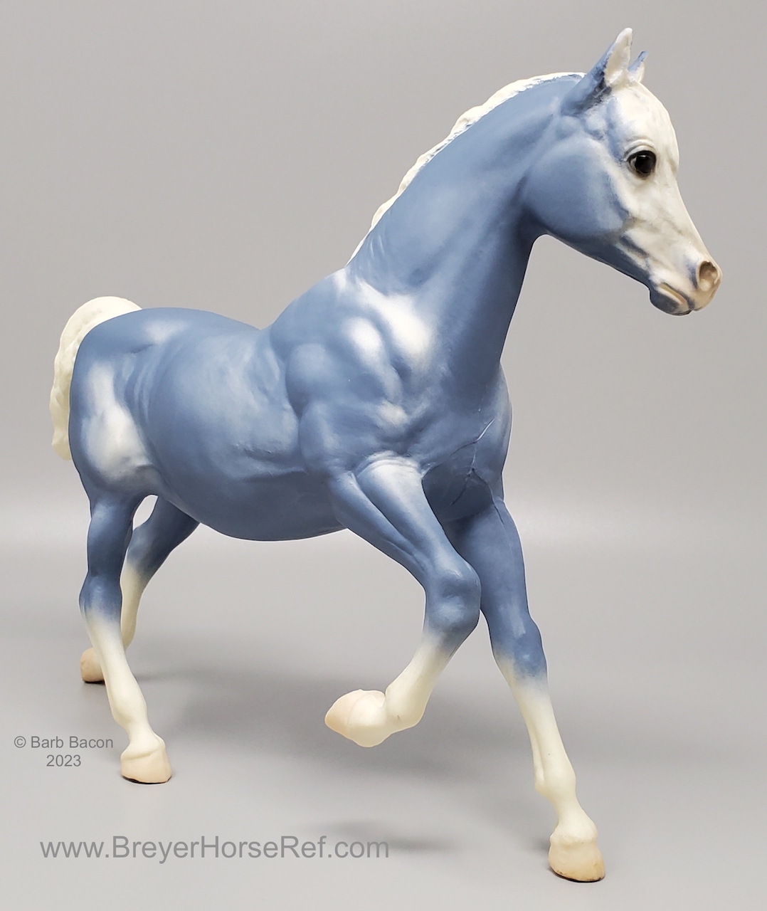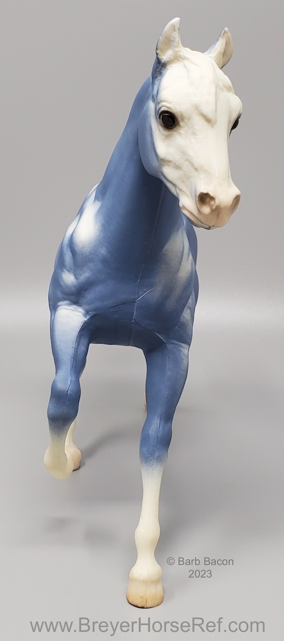 Wedgewood blue with white mane and tail, 4 socks with pink or white hooves, and bald face. This color was always released in a matte finish, and colors varied slightly from light to dark. Set #4351 included both the matching Running Mare and Foal.