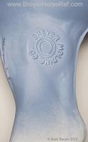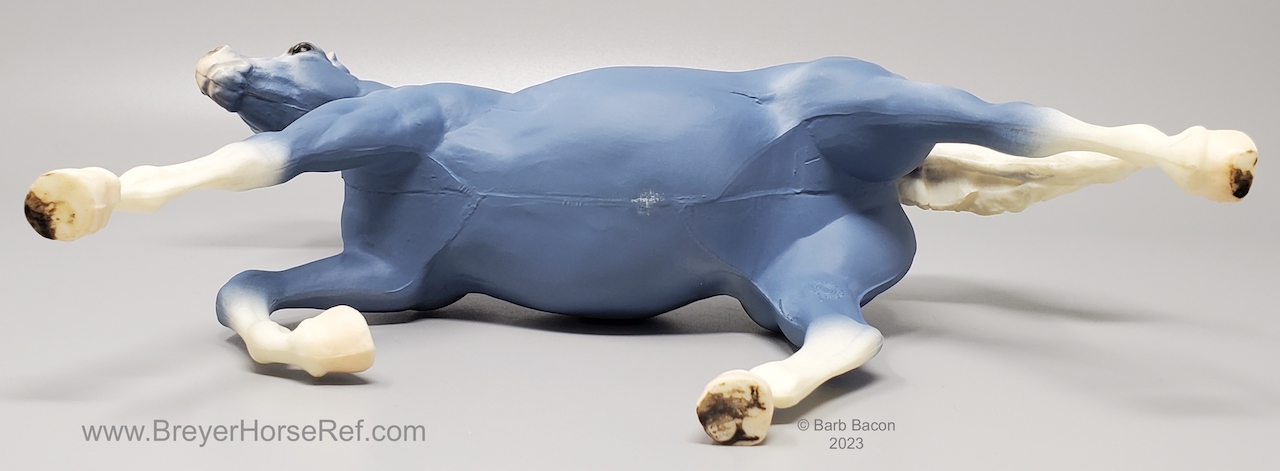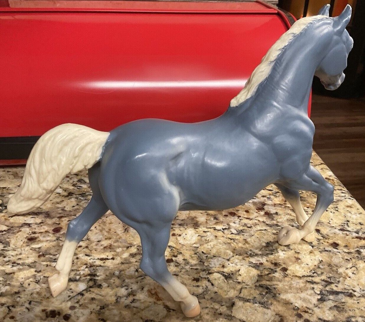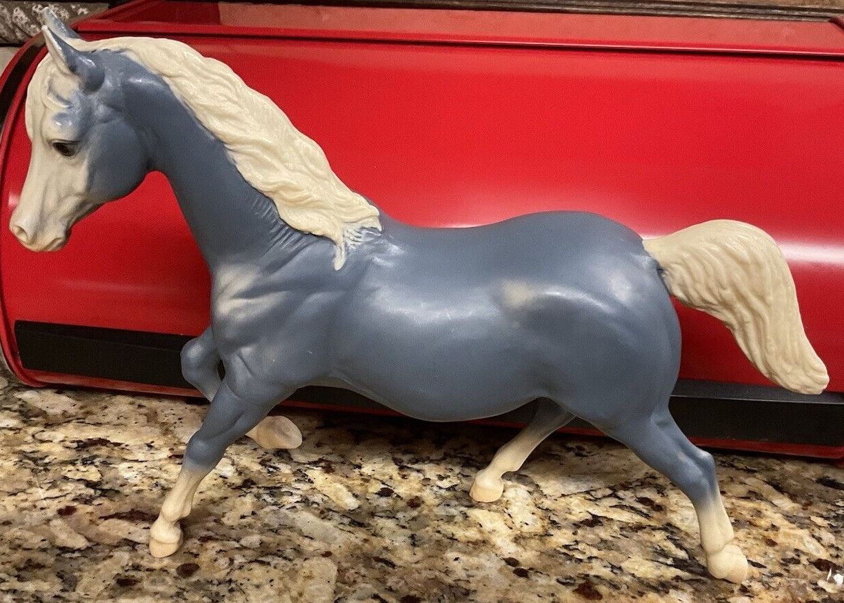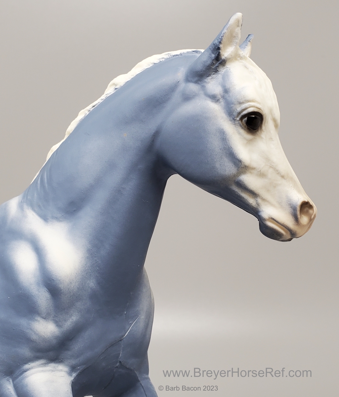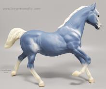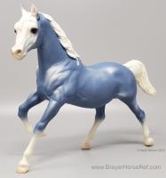 Wedgewood blue with white mane and tail, 4 socks with pink or white hooves, and bald face. This color was always released in a matte finish, and colors varied slightly from light to dark. Set #4351 included both the matching Running Mare and Foal.