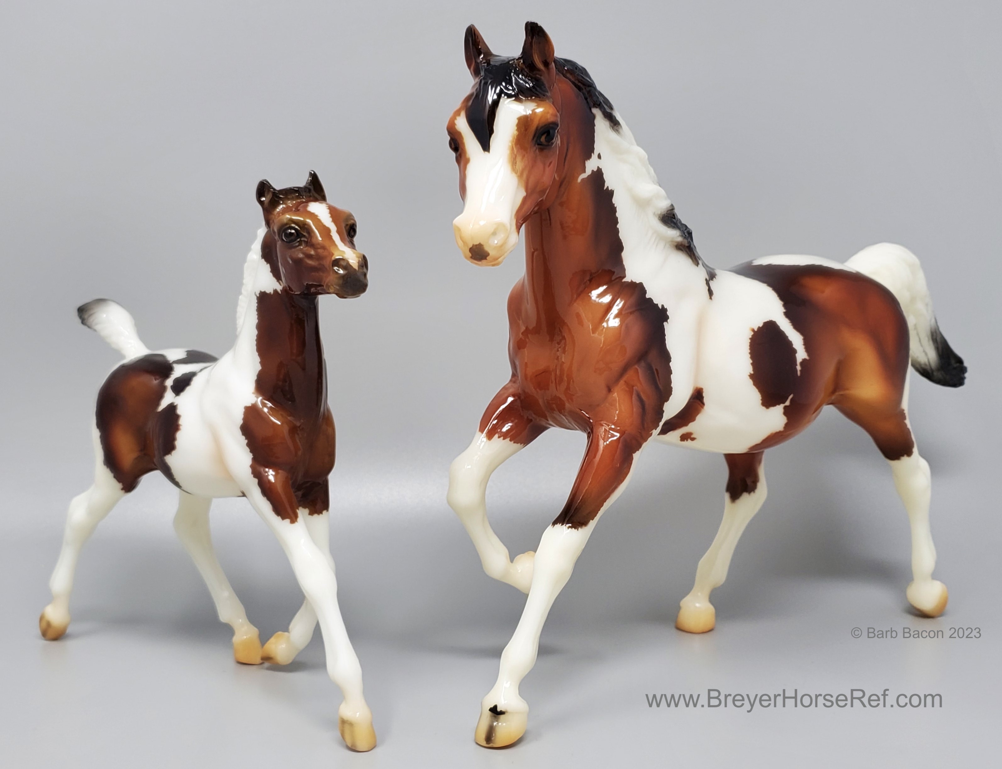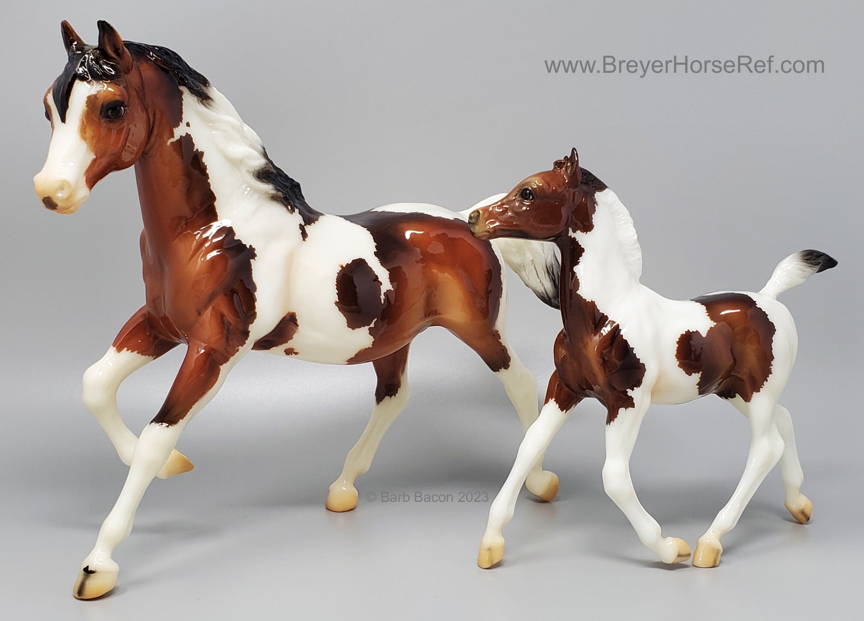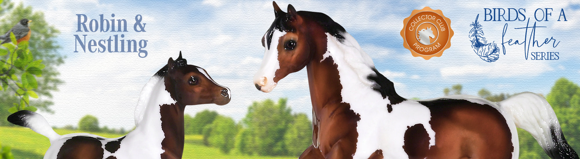 "The sixth release (and first duo) of the Birds of a Feather series are Robin and Nestling, a sweet pinto Half-Arabian mare and foal designed by Sommer Prosser. Robin features a red bay coat that is reminiscent of the feathers on the robin’s bright chest. Just like a baby bird is born with muted coloring that brightens as it ages, Robin’s colt, Nestling, has deeper brown-black tones in his eye-catching coat. They both have a high gloss finish, and Robin has the stamp “Robin and Nestling 2022” on her belly." www.breyerhorses.com.