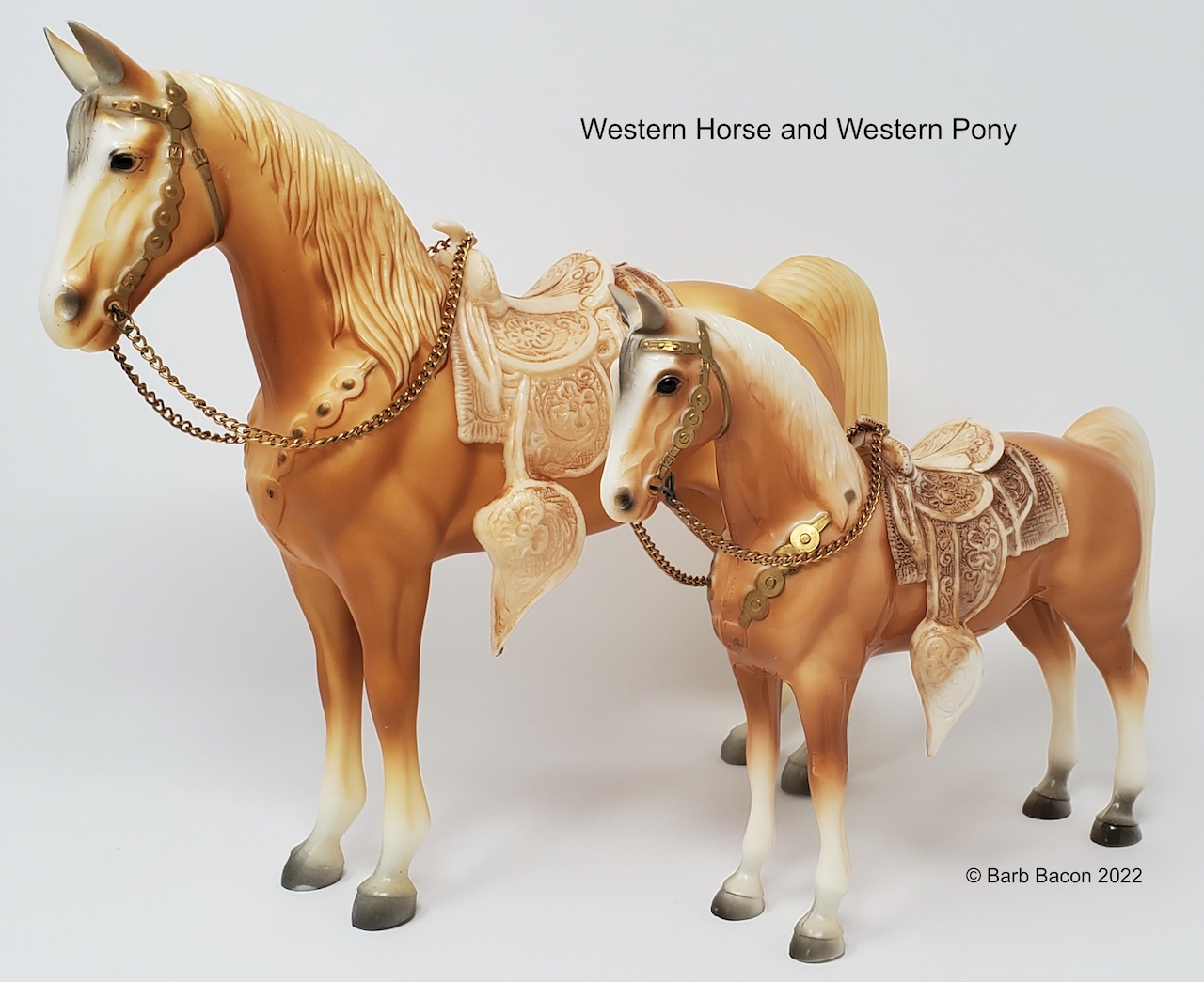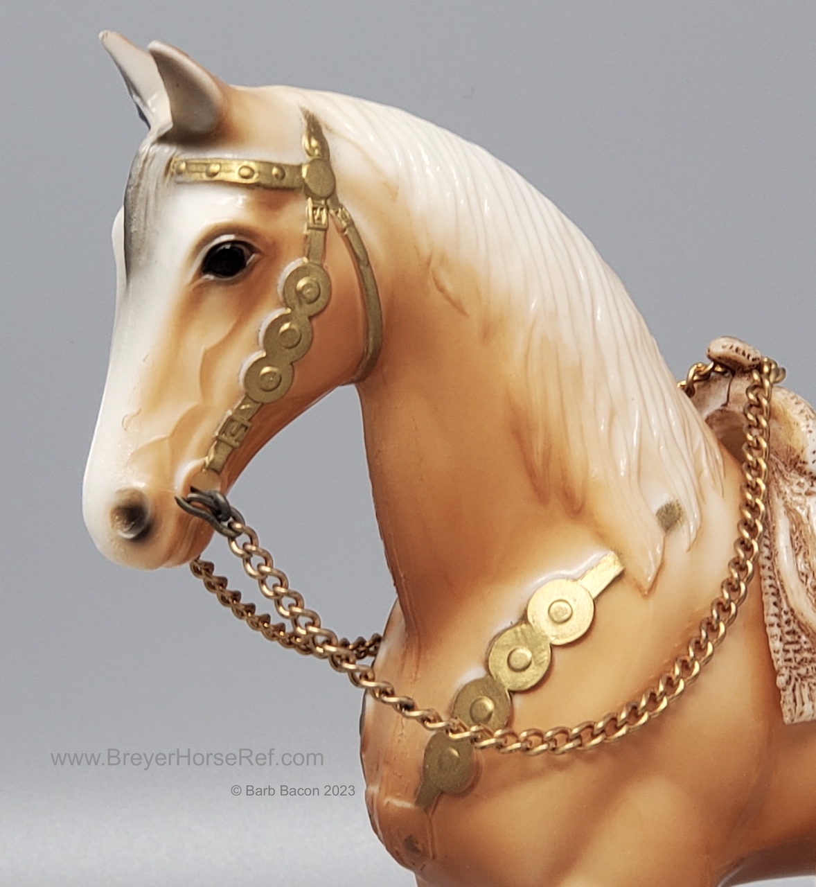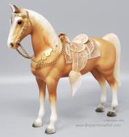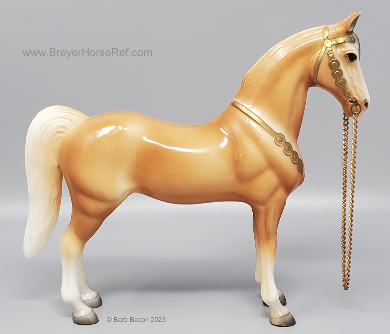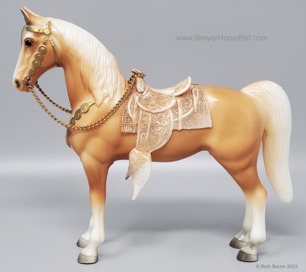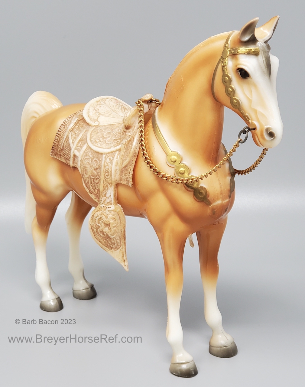 #43 Palomino Western Pony with four white stockings with grey hooves, palomino shaded mane and tail, bald face, and gold bridle and breast collar with brass chain reins. Palomino color varied from a light tan to a dark orange color. The hard plastic slip-on saddle was first advertised in the 1968 catalog.