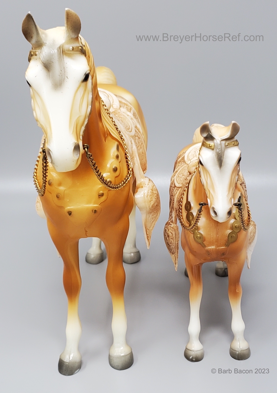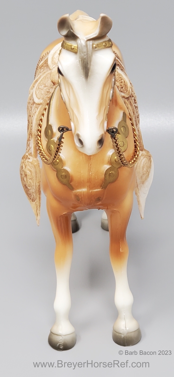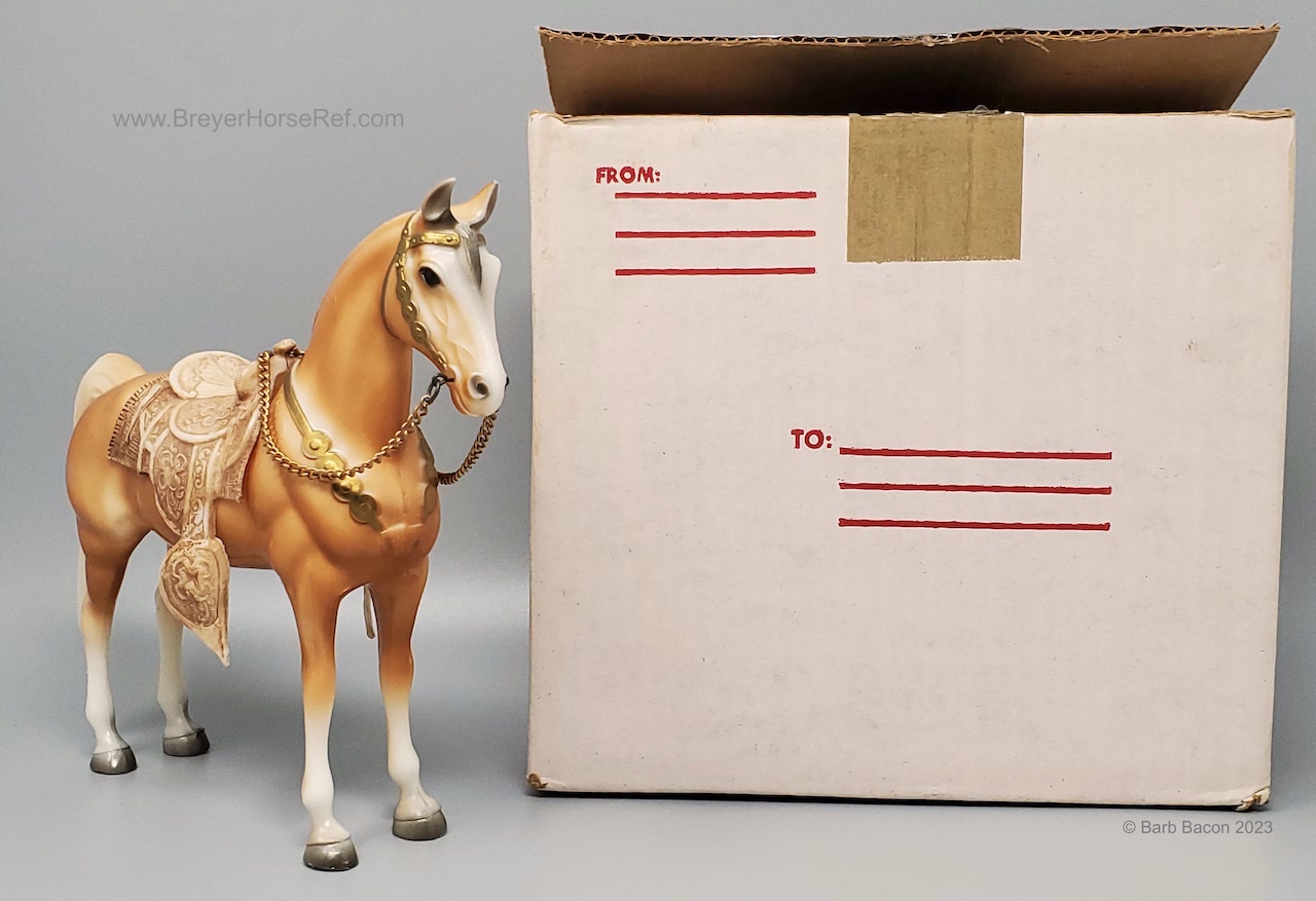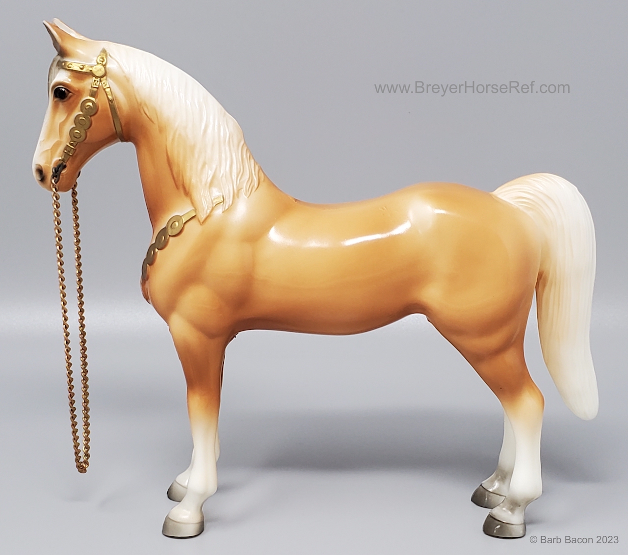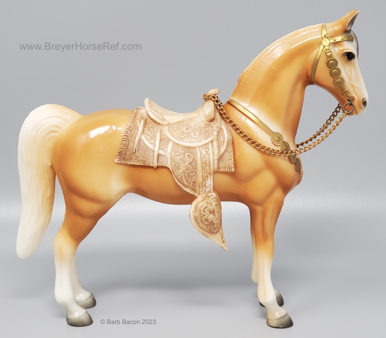 #43 Palomino Western Pony with four white stockings with grey hooves, palomino shaded mane and tail, bald face, and gold bridle and breast collar with brass chain reins. Palomino color varied from a light tan to a dark orange color. The hard plastic slip-on saddle was first advertised in the 1968 catalog.