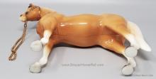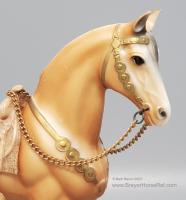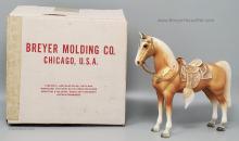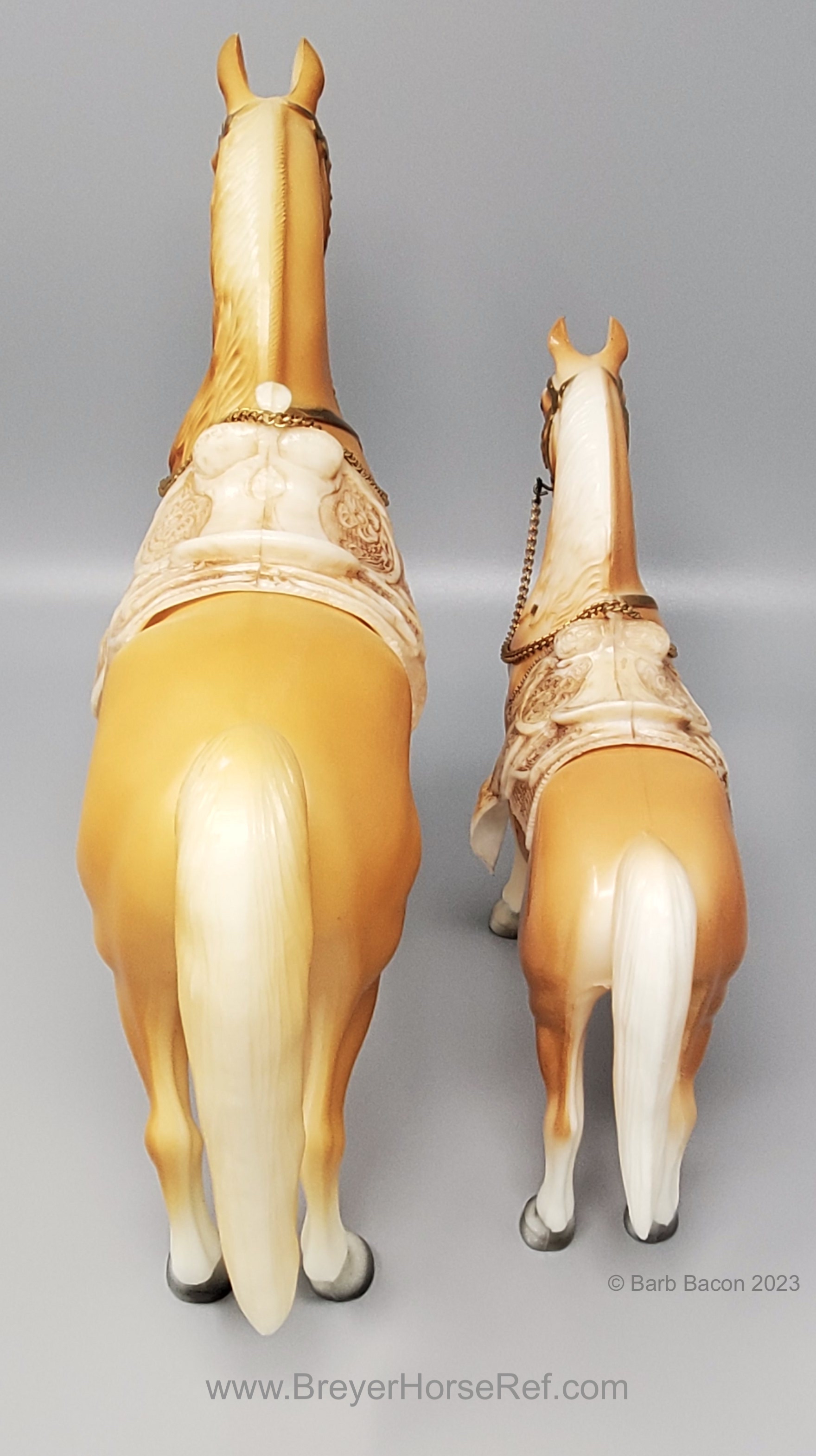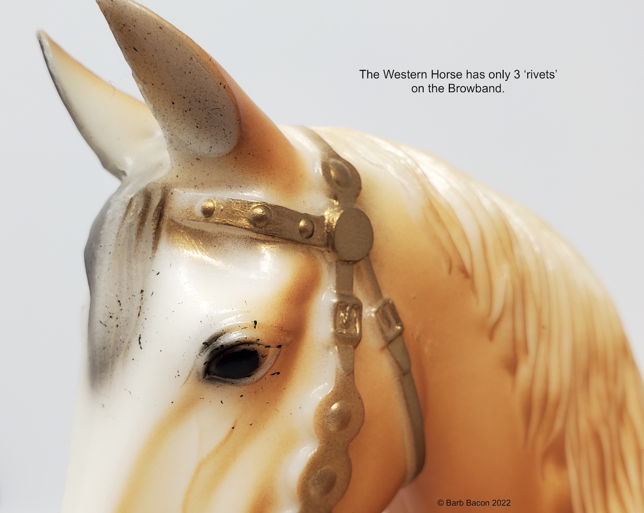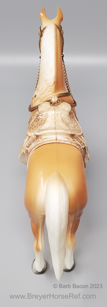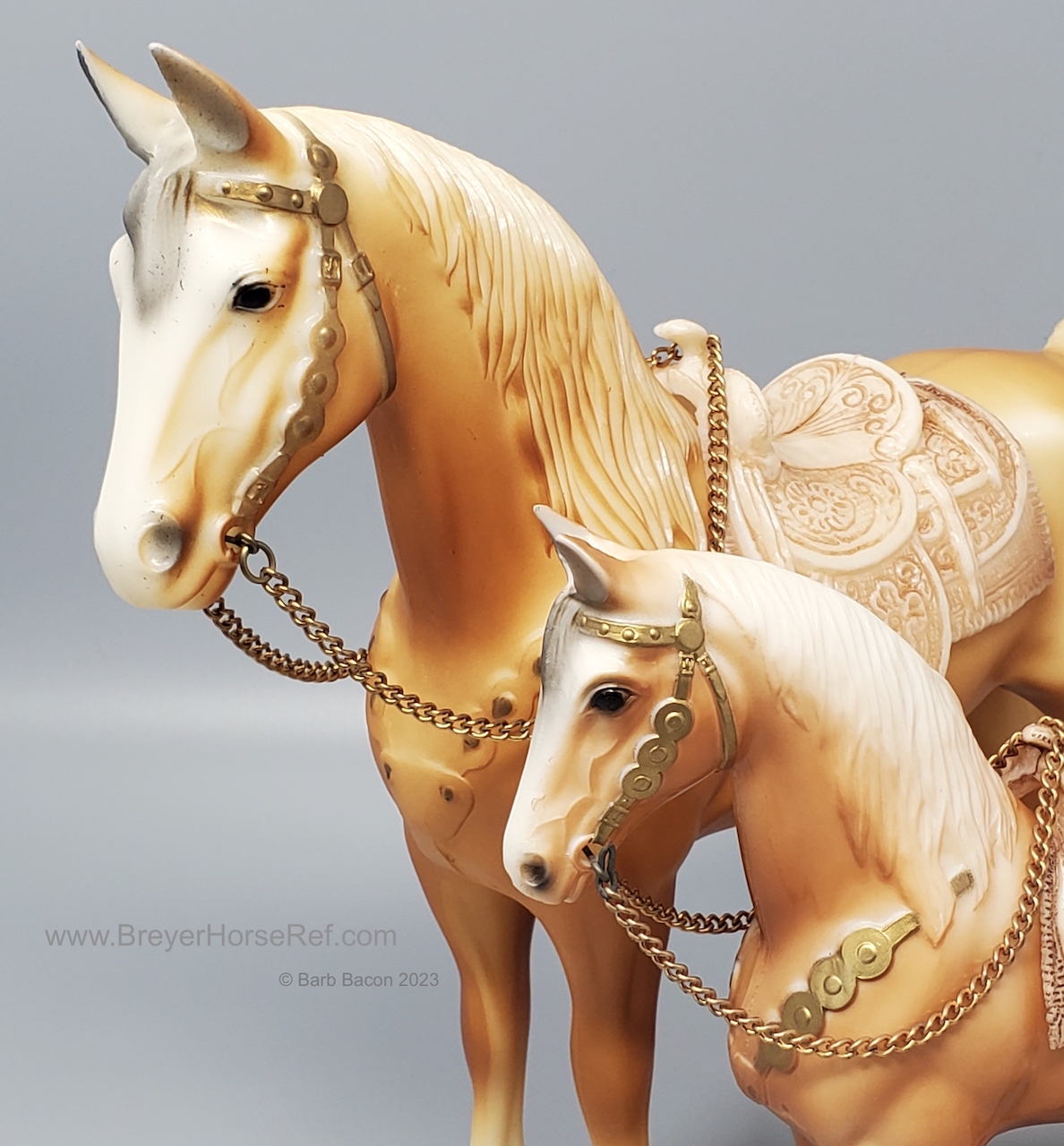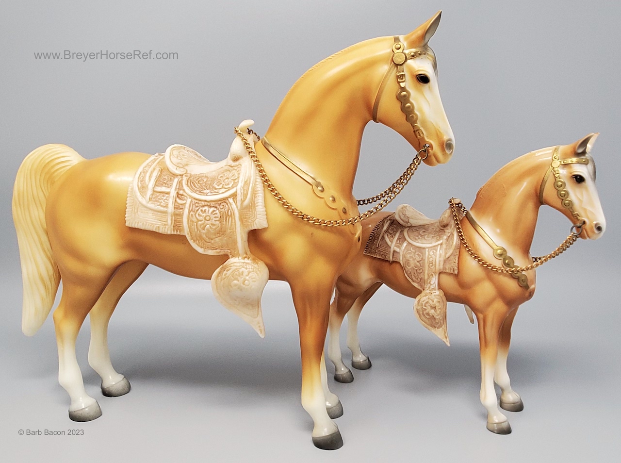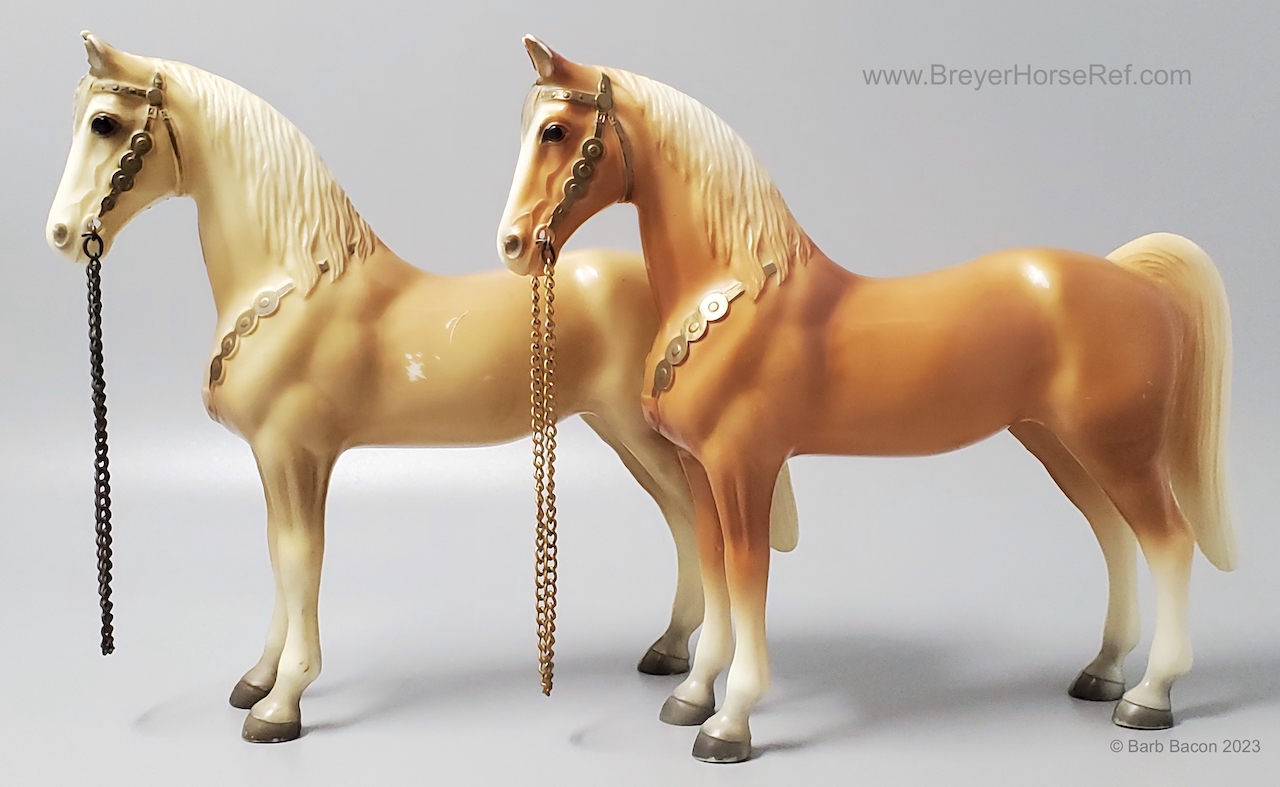 #43 Palomino Western Pony with four white stockings with grey hooves, palomino shaded mane and tail, bald face, and gold bridle and breast collar with brass chain reins. Palomino color varied from a light tan to a dark orange color. The hard plastic slip-on saddle was first advertised in the 1968 catalog.
