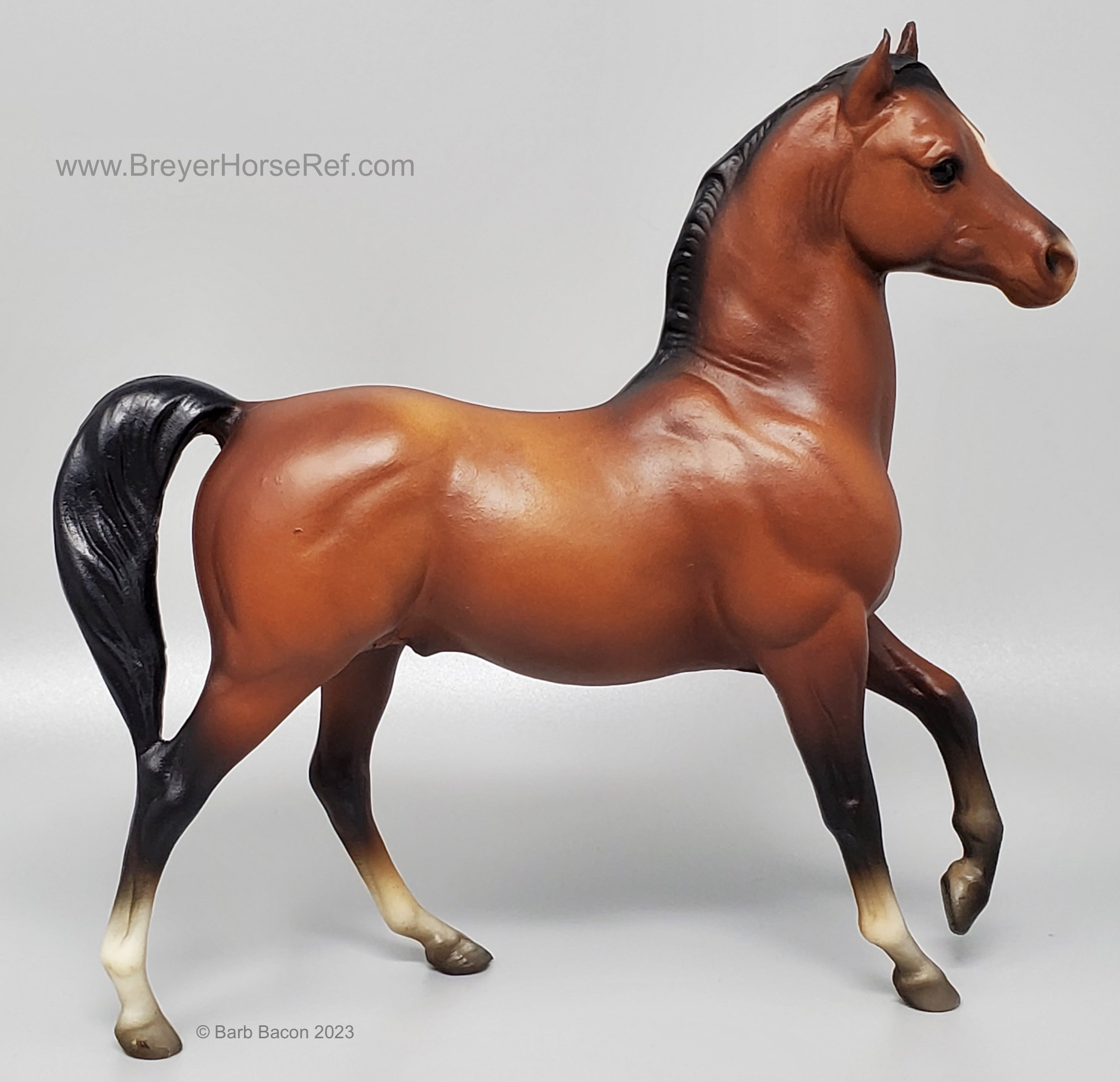 Bay with black points, stockings on back legs and right front leg, grey hooves, and a star. Some models came with or without a snip. Set included a Bay Classic Arabian Stallion, a Rose Alabaster Classic Arabian Mare and a Bay Classic Arabian Foal. Sears Exclusive.