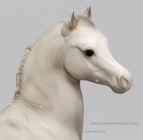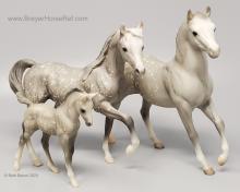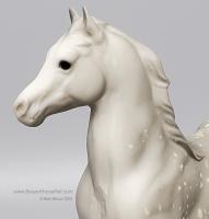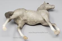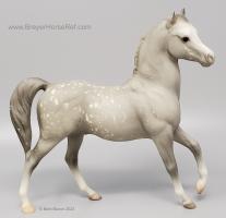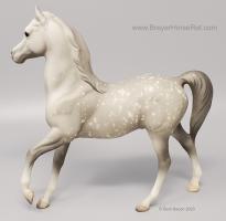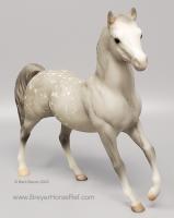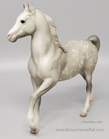 Dapple Grey with 4 stockings, pink hooves and a bald face. In a matching dapple grey set with the Classic Arabian Mare, Stallion and Foal. #413455 is the set number.