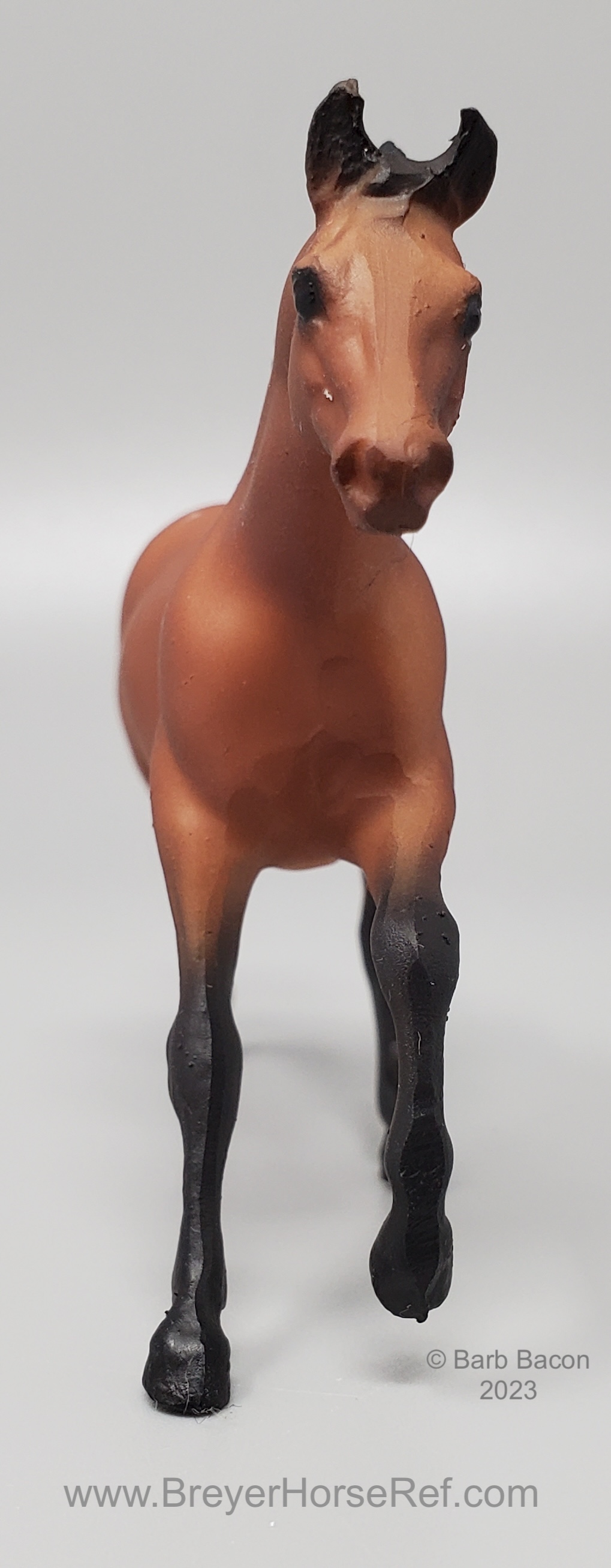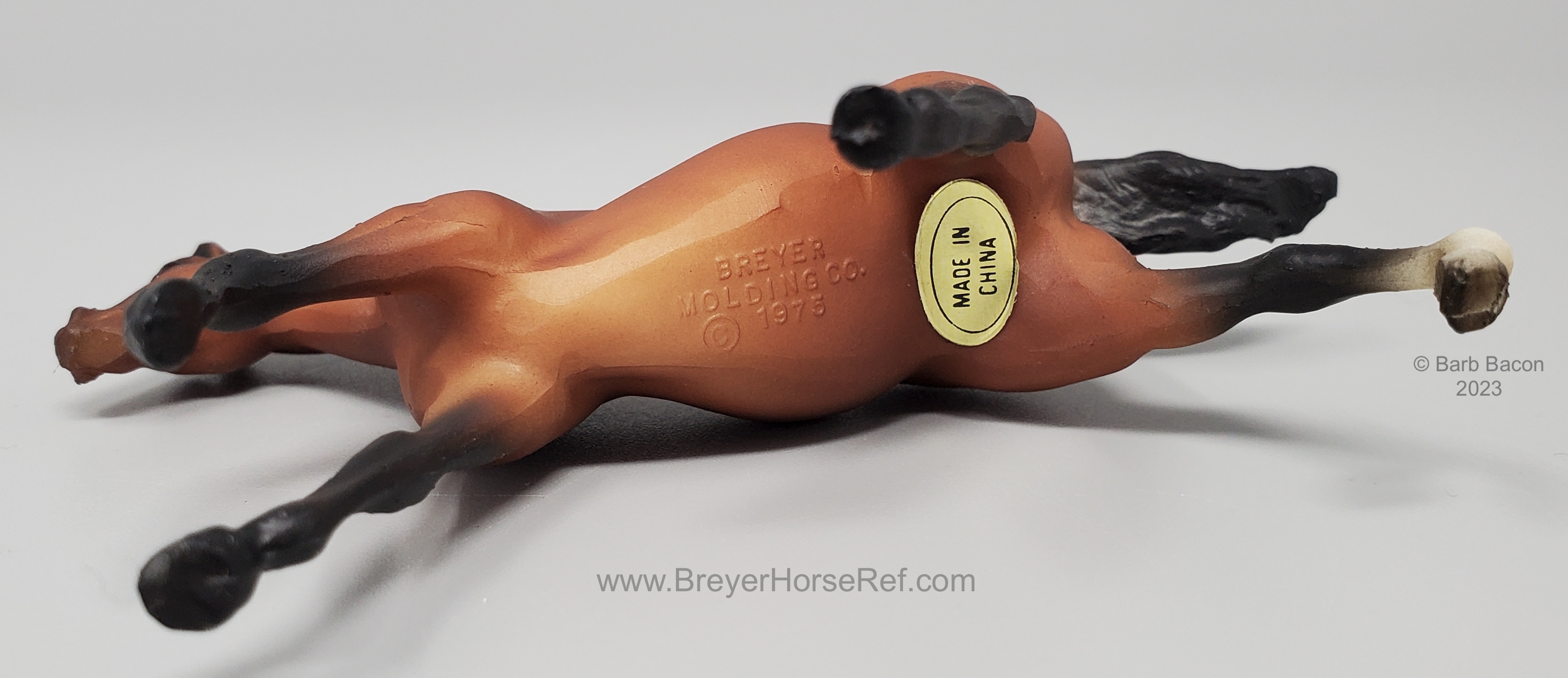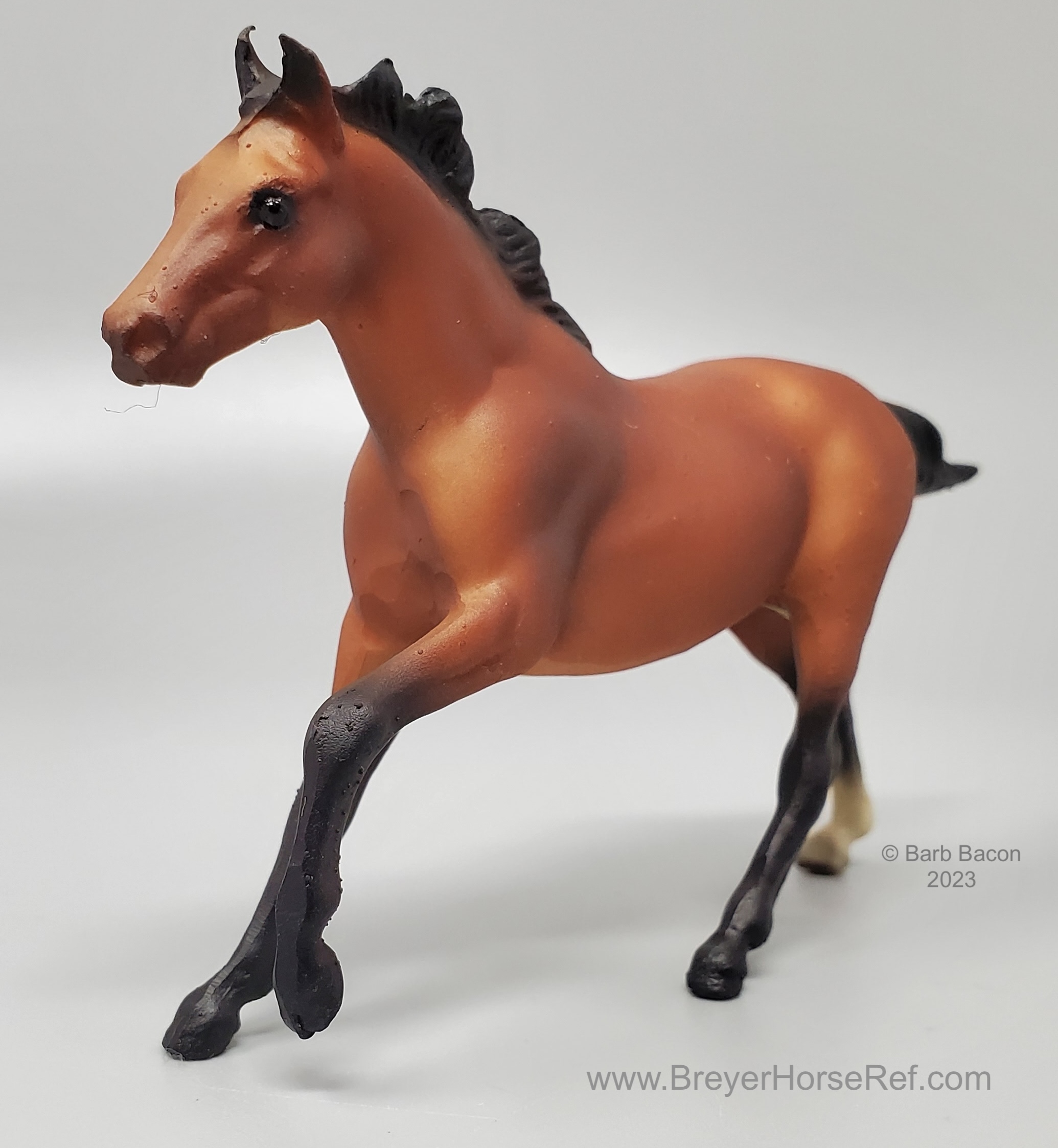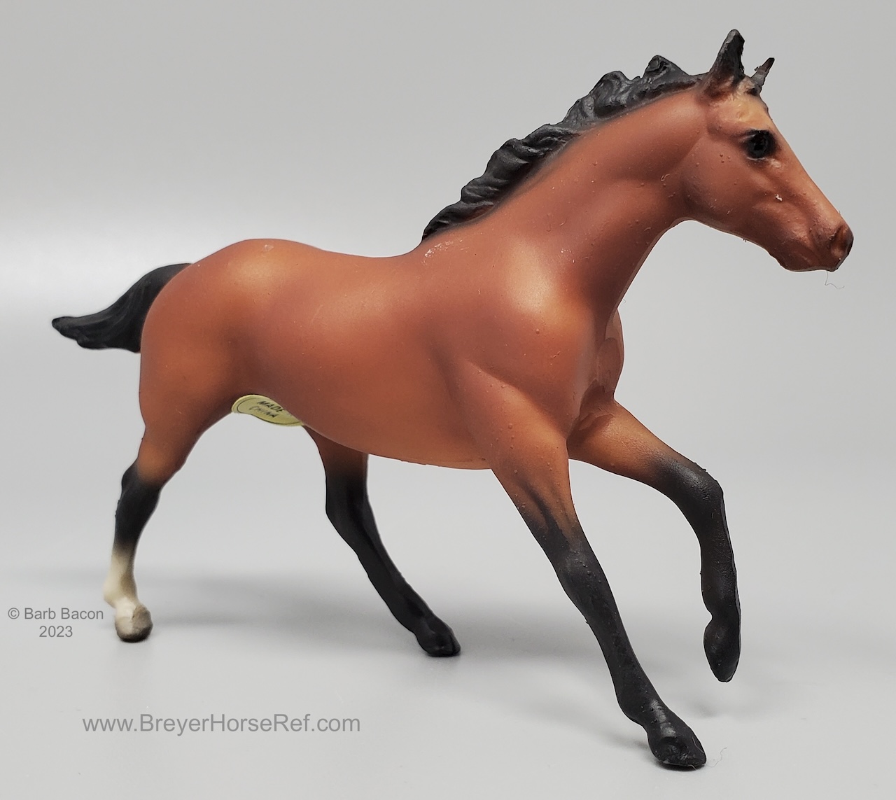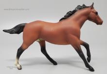 Sandy golden bay with black points and a right hind sock. In 1996, JC Penney released this set as the 12 Piece Stablemate Set #711096 (JCP #671-2608). This set included a blue roan Arabian Mare, rose grey Arabian Stallion, bay blanket appaloosa Citation, black pinto Draft Horse, red dun Morgan Mare, alabaster with striped mane Morgan Stallion, red dun Native Dancer, sooty buckskin Quarter Horse Stallion, dapple grey Saddlebred, sandy bay Seabiscuit, black leopard appaloosa Silky Sullivan and a bay Swaps.