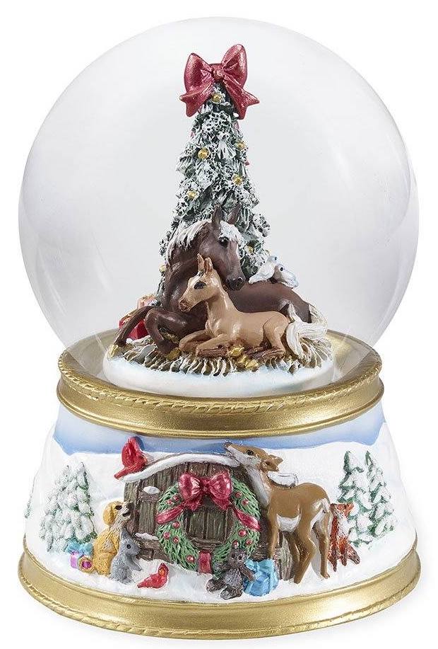 "The wonder of the holidays meets the joy of a new life in this touching Musical Snow Globe. A mare is nestled sweetly with her new foal at the foot of a snow-covered Christmas tree. The globe’s decorative base features a cheerful group of animal friends waiting in the wintery landscape to greet the new foal! Wind it up to hear it play 'Away in a Manger'." www.breyerhorses.com. 16th in the Musical Snow Globe Series.