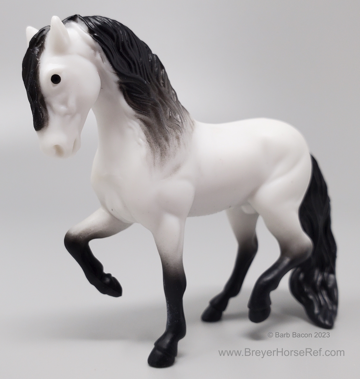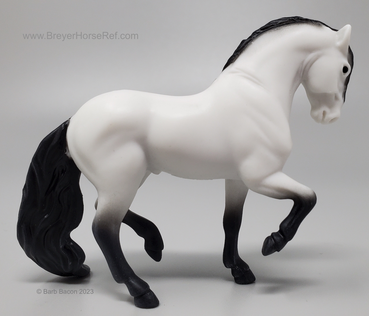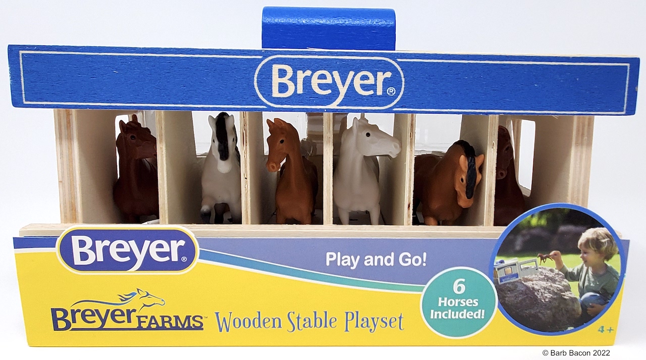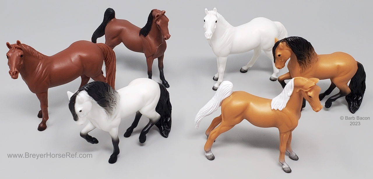 Included 2 Saddlebreds (Palomino and Bay), 2 Andalusians (Grey and Buckskin), and 2 Standing Stock Horses (White and Chestnut), and a Stable. The Andalusian models in this run tend to be less detailed, sometimes smaller, and have the Breyer Logo with Reeves Intl. Copyright stamp instead of the original linear Breyer Reeves stamp.