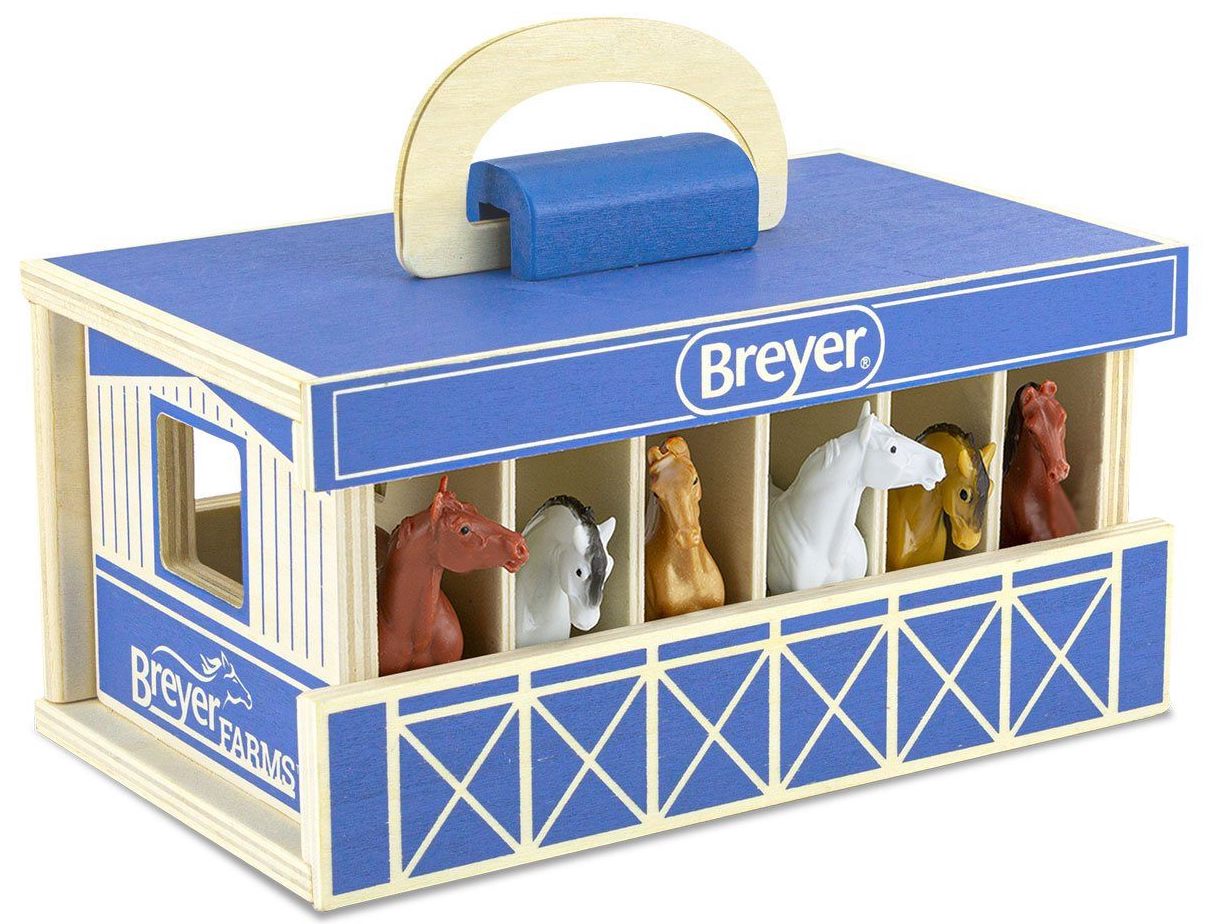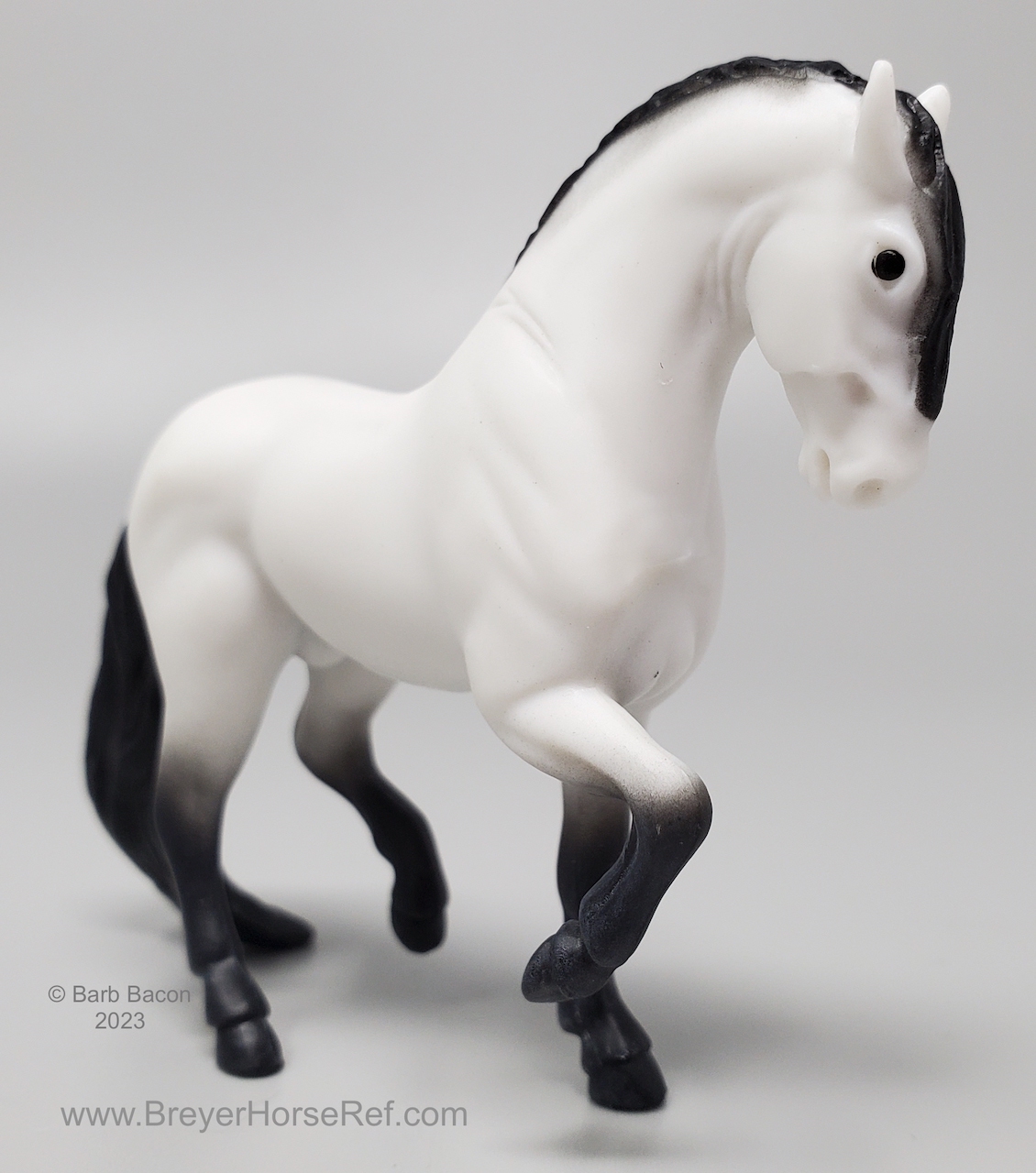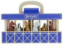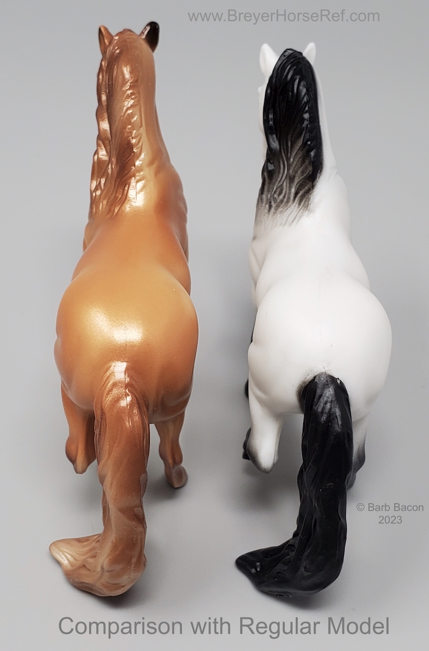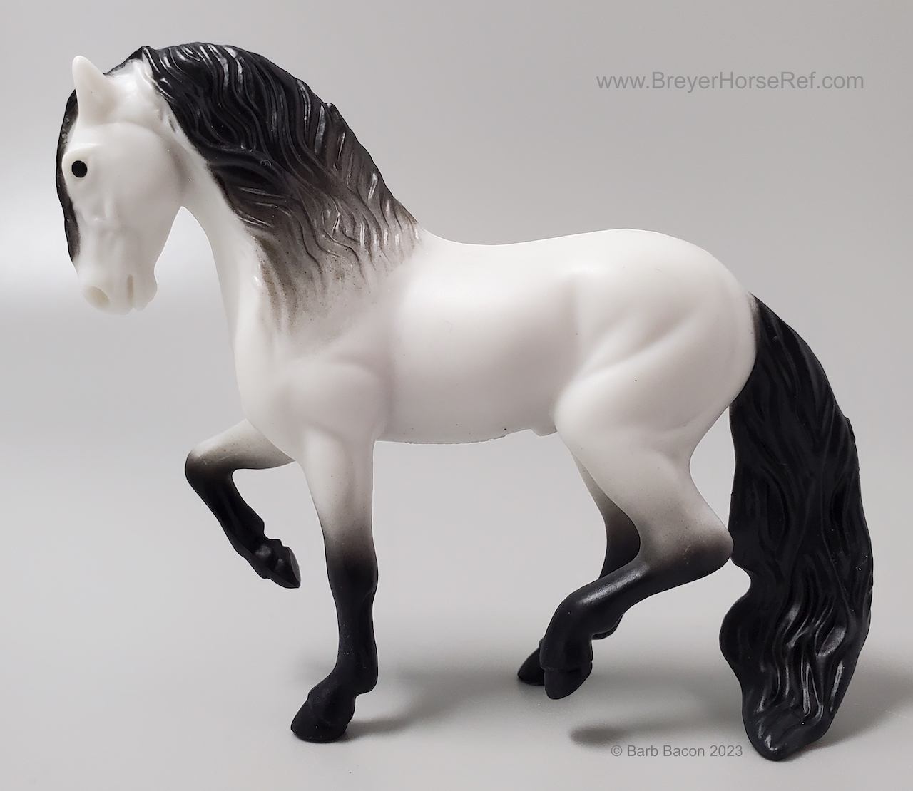 Included 2 Saddlebreds (Palomino and Bay), 2 Andalusians (Grey and Buckskin), and 2 Standing Stock Horses (White and Chestnut), and a Stable. The Andalusian models in this run tend to be less detailed, sometimes smaller, and have the Breyer Logo with Reeves Intl. Copyright stamp instead of the original linear Breyer Reeves stamp.