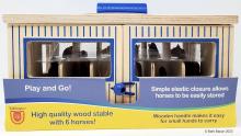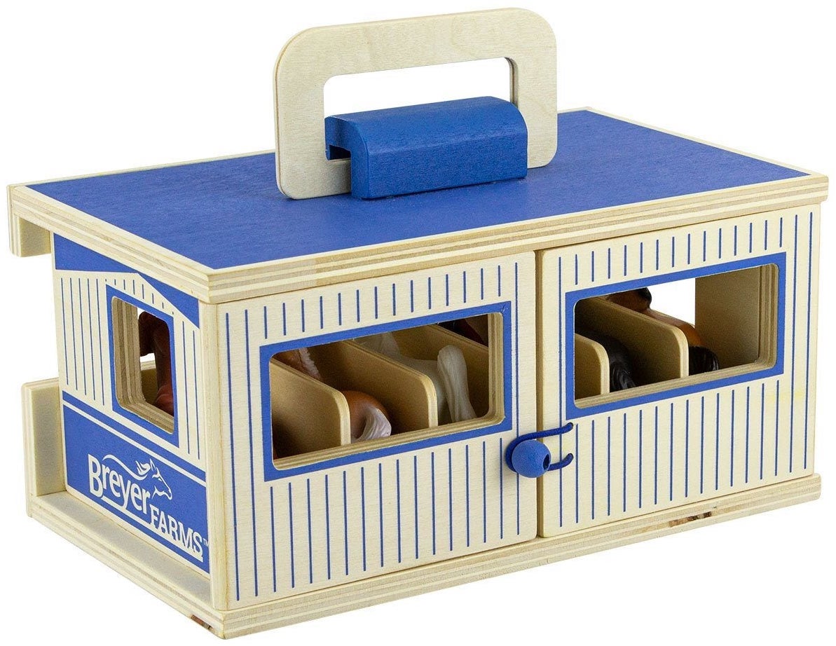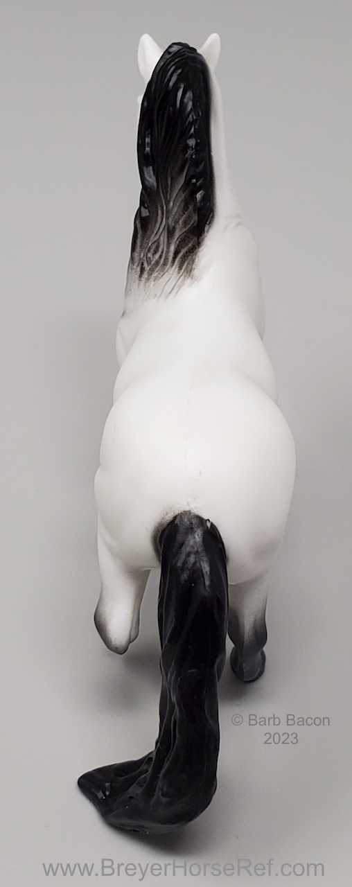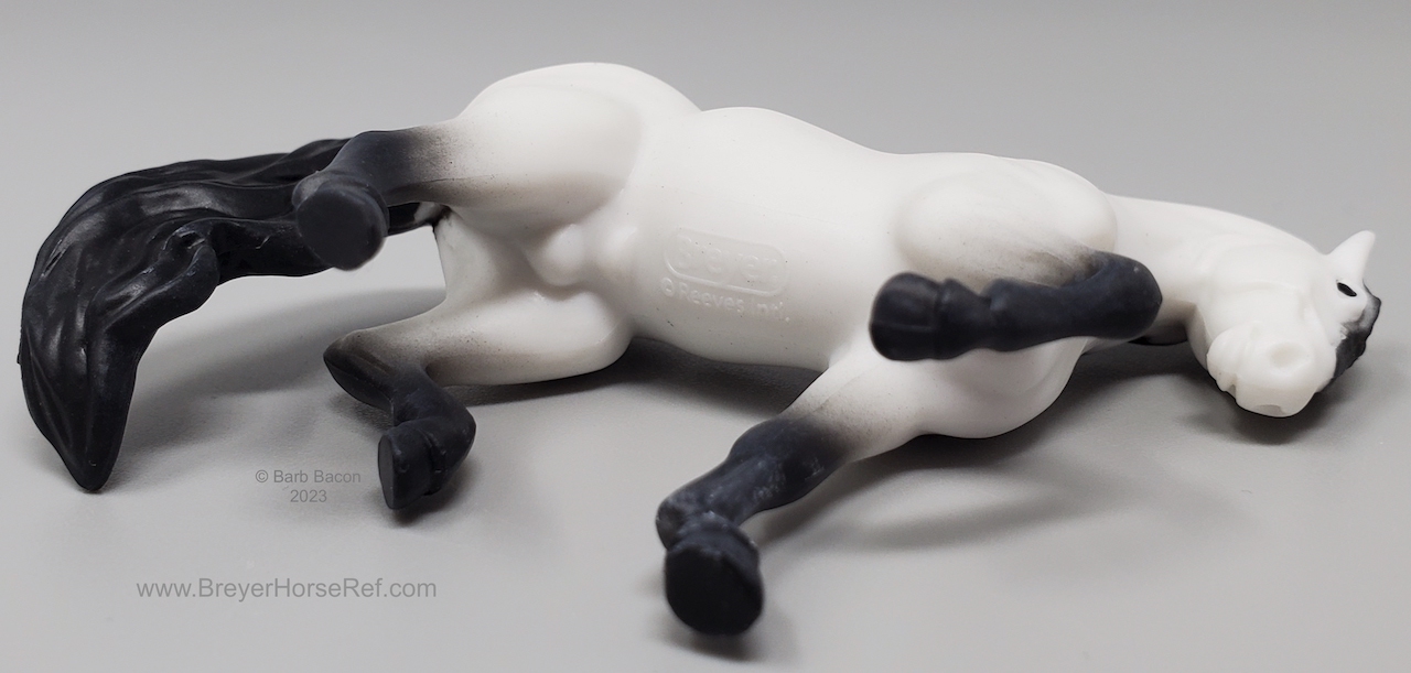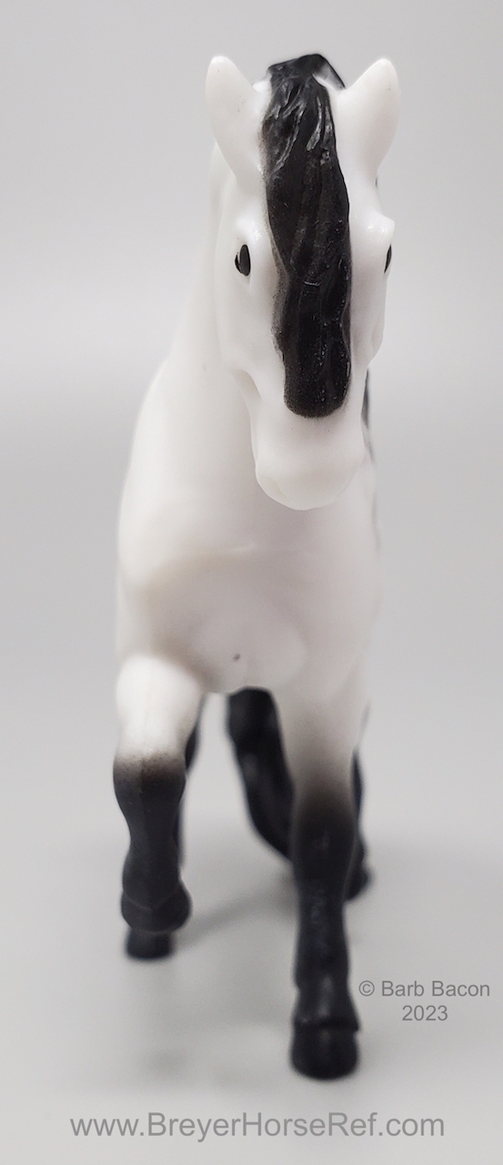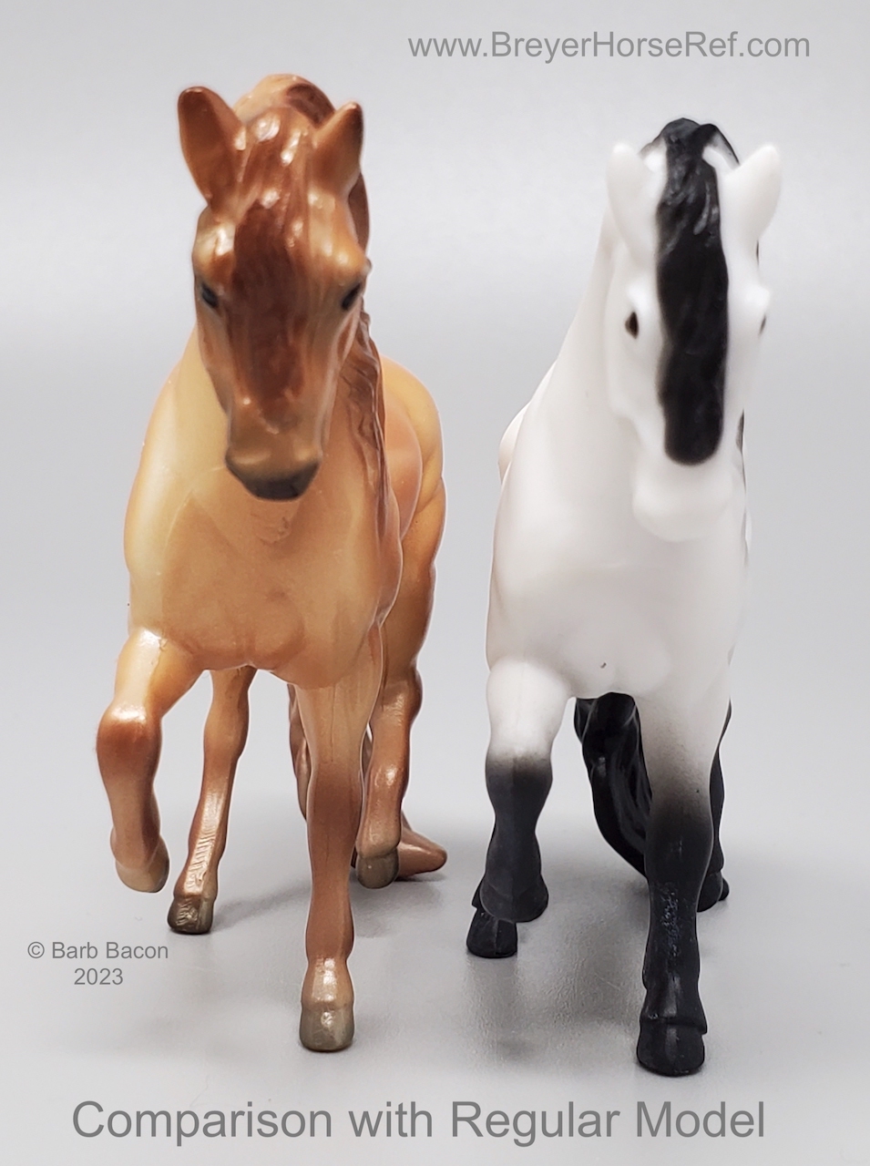 Included 2 Saddlebreds (Palomino and Bay), 2 Andalusians (Grey and Buckskin), and 2 Standing Stock Horses (White and Chestnut), and a Stable. The Andalusian models in this run tend to be less detailed, sometimes smaller, and have the Breyer Logo with Reeves Intl. Copyright stamp instead of the original linear Breyer Reeves stamp.