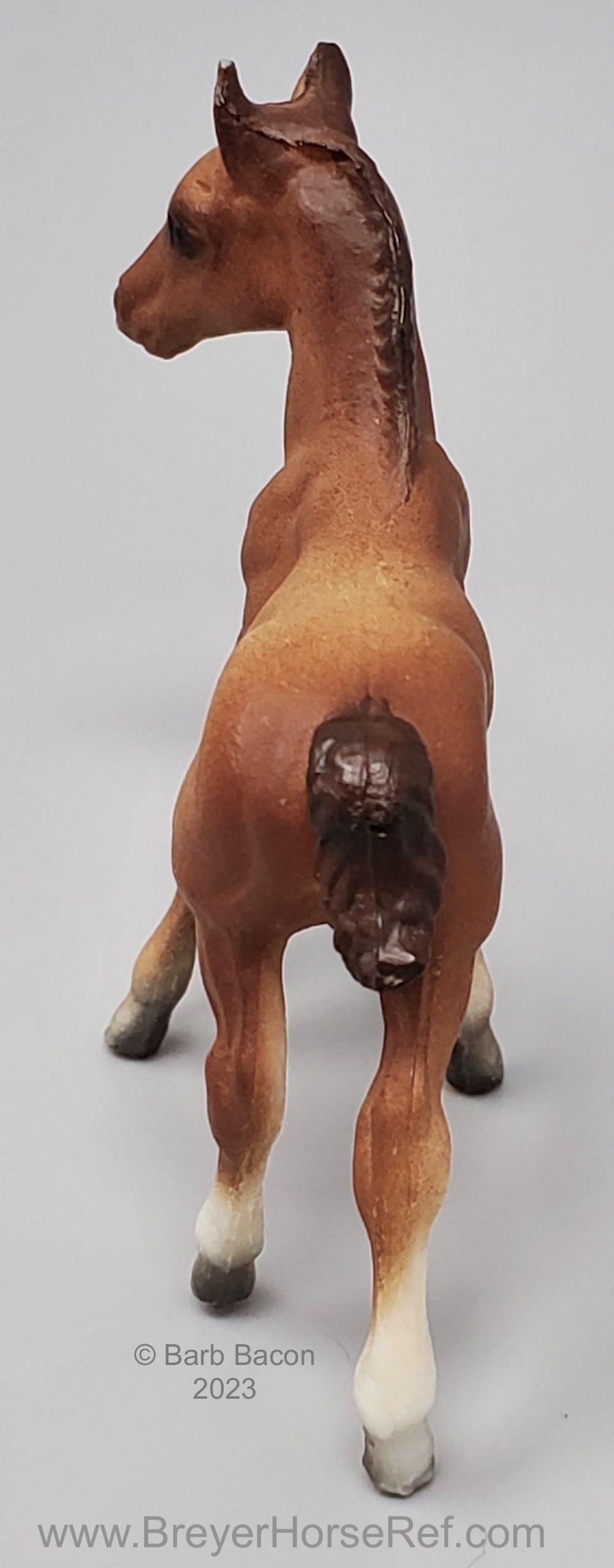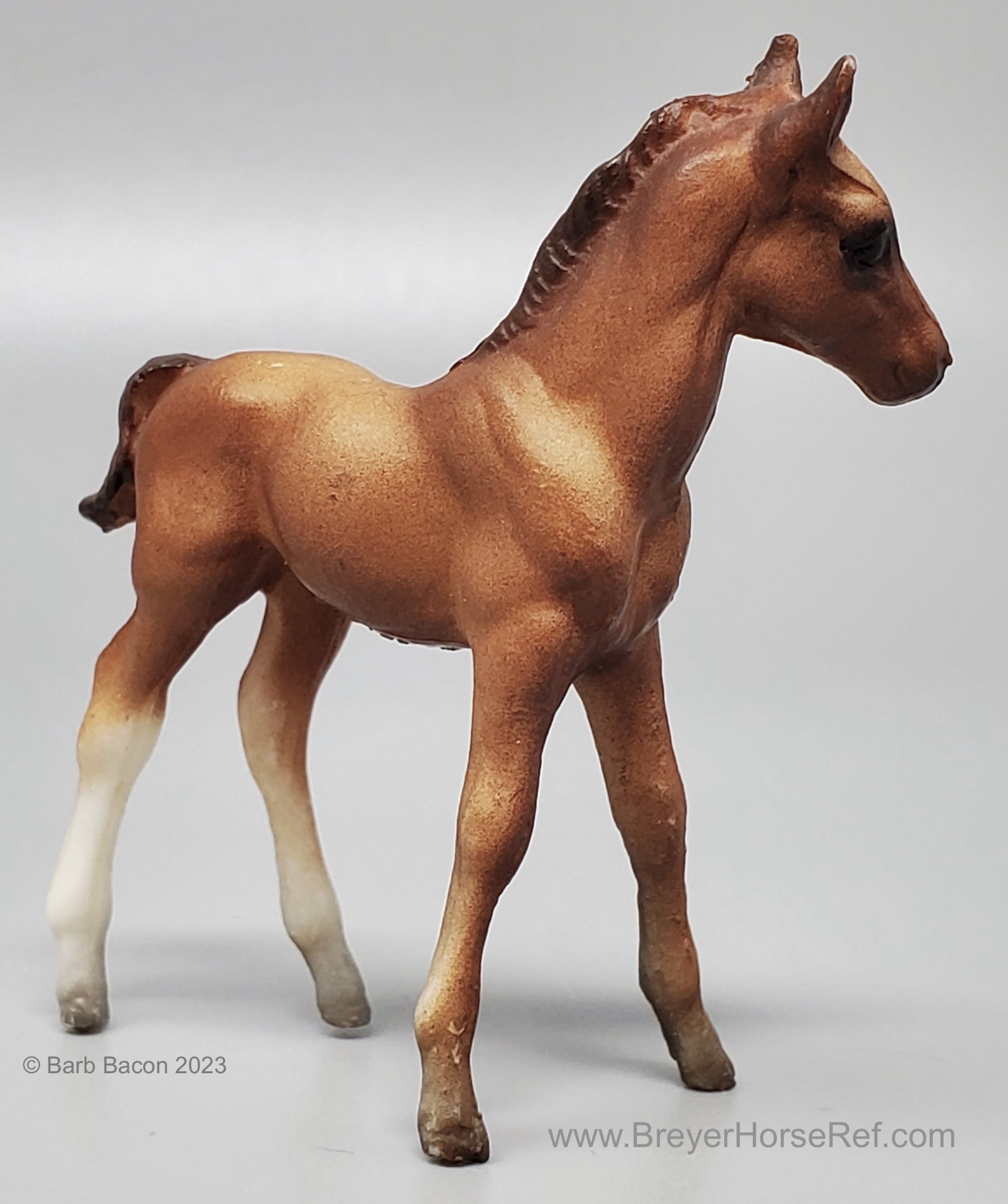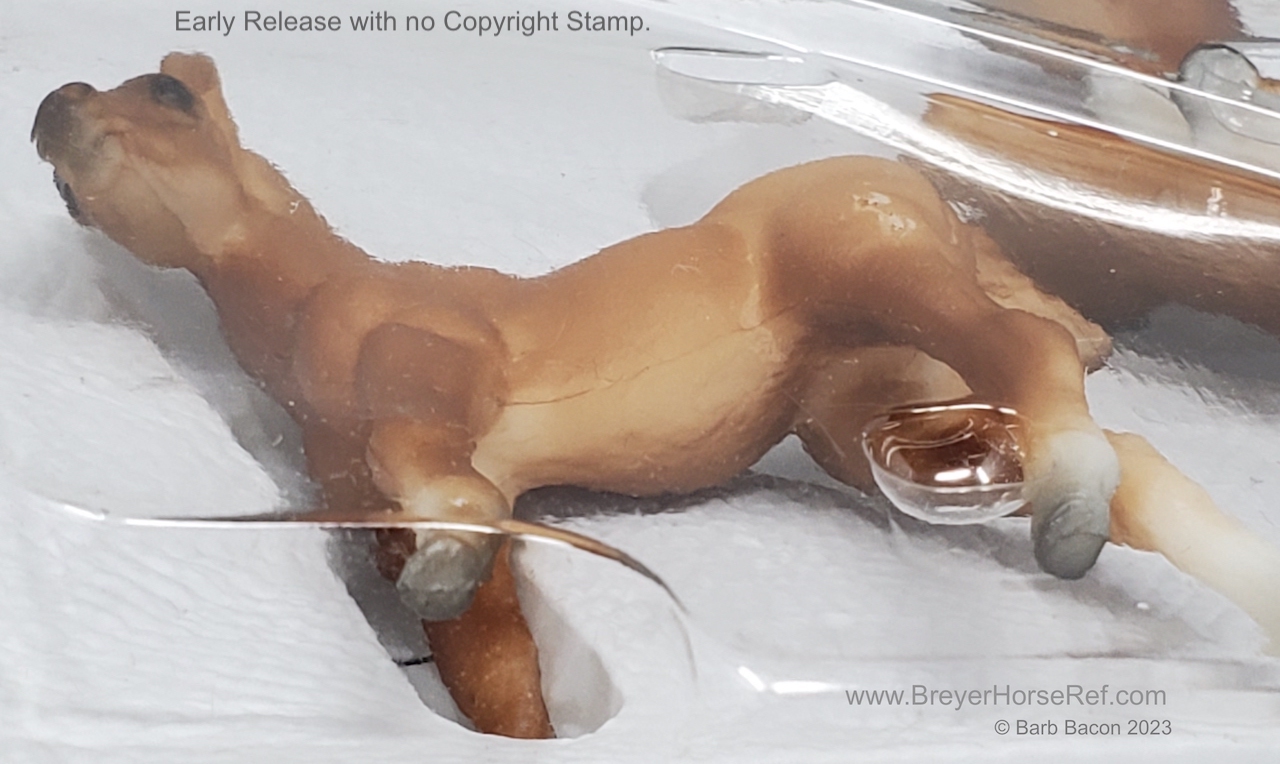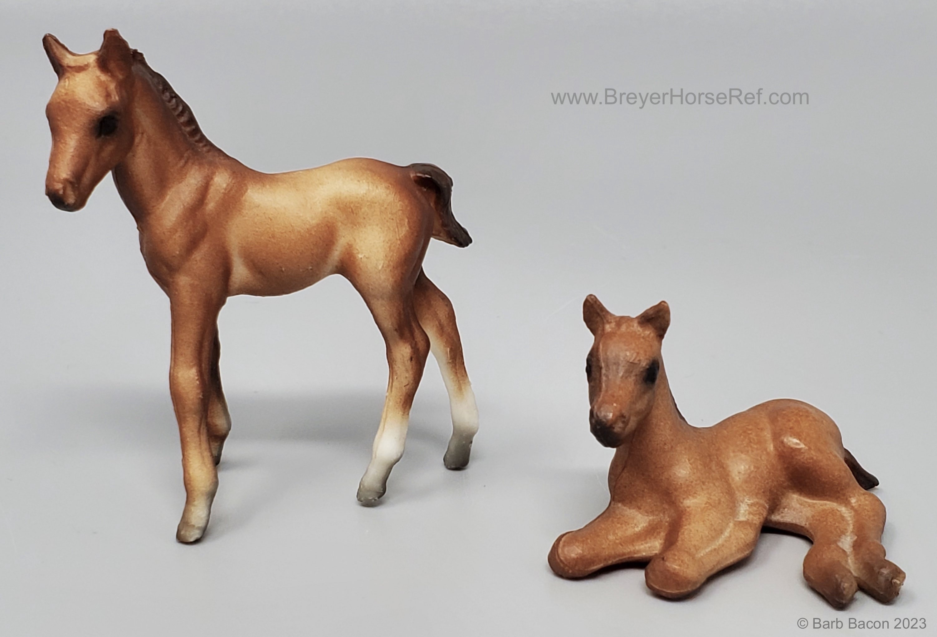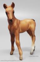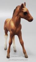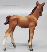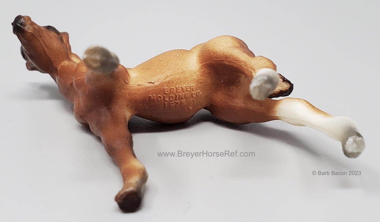 Chestnut color can range from a light reddish dun to a medium chestnut. The mane and tail are slightly darker than the body. Dark variations of this model can be easily confused with the light bay color. Has 2 or 4 stockings with grey hooves and a solid face. Included the Thoroughbred Standing and Lying Foals. Models are stamped with Copyright Breyer Molding Co 1975; however, early releases did not have a stamp. These models were made from the heavier Cellulose Acetate plastic.