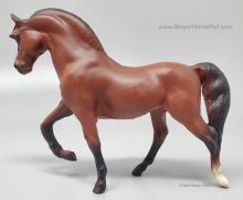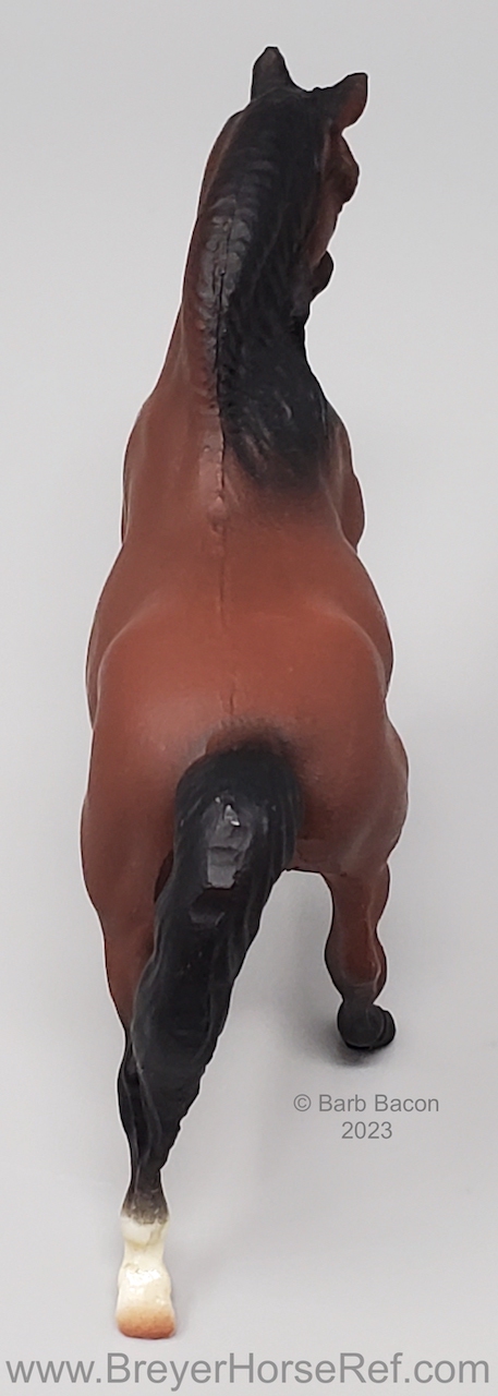 Red Bay with black points and back left sock with pink hoof. This was the first Saddle Club Collection #5650, produced 1994-1995, and included a dapple grey Arabian Mare, alabaster Draft Horse, red bay Morgan Stallion, red chestnut Seabiscuit, and a black Thoroughbred Mare. This set was discontinued in 1995, and a new set with the same name and number was released later in 1995. See record #5650B for the second collection released 1995-1997. The first collection is the only set pictured in the catalogs from 1994-1997.