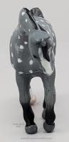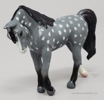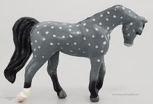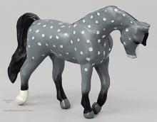 Dapple Grey with black points and white painted areas. This model was released in the Series I Arabian Set #3960, Winners Choice Micro Horses by Creata International. Per Artist Candace Liddy, the packaging was completed in 1996, however the models were not available until 1997. Breyer bought this mold in 2004.