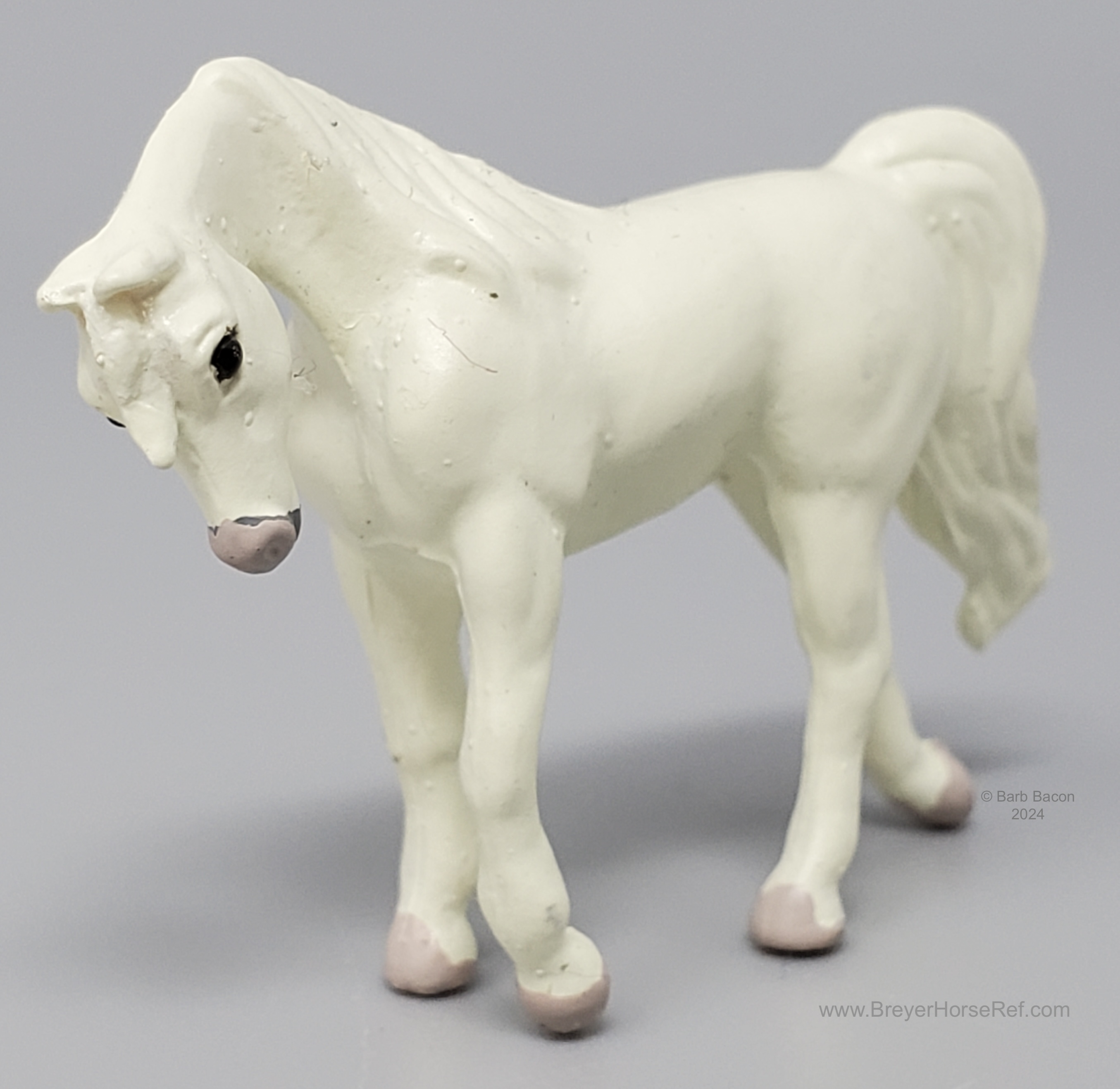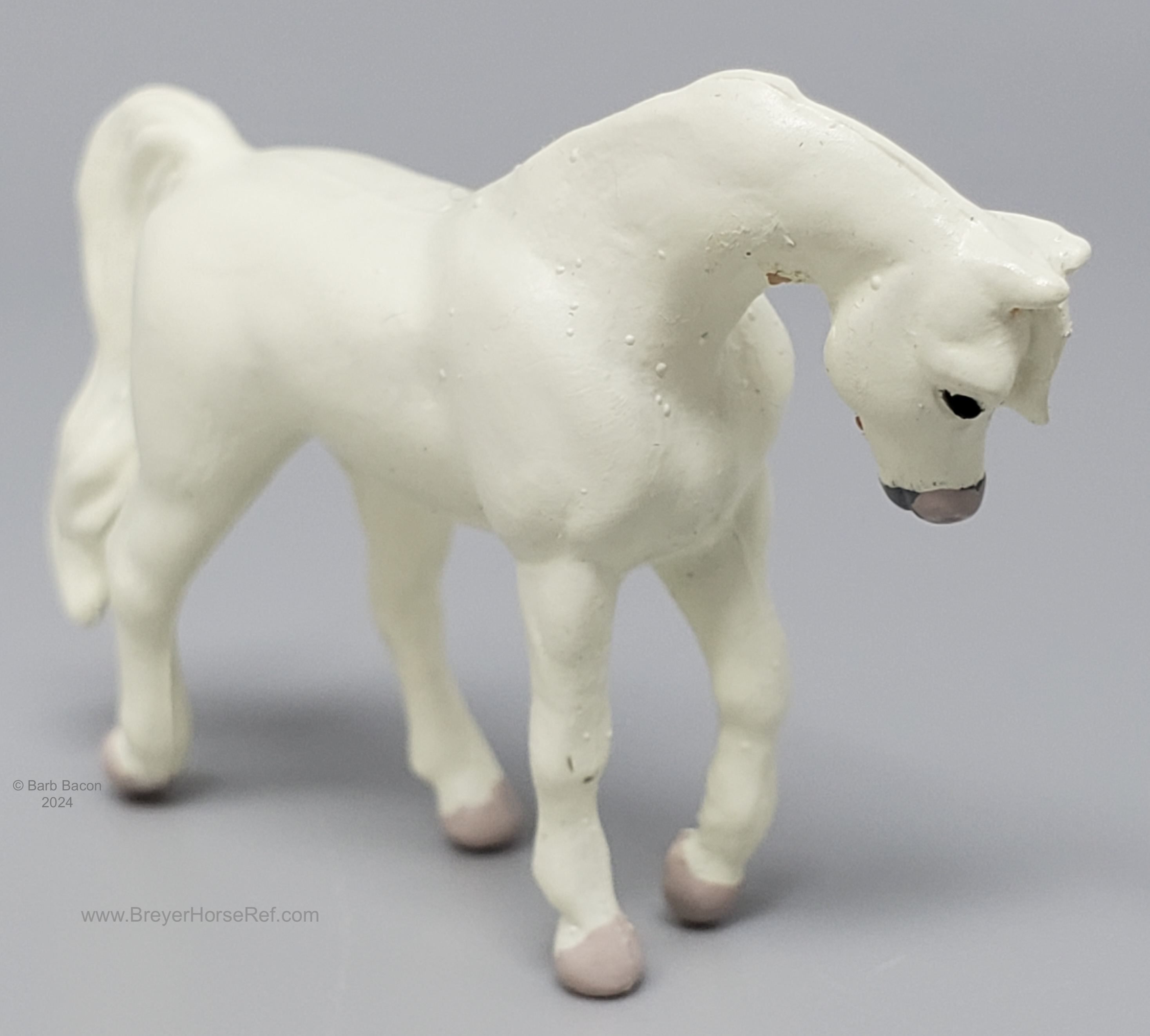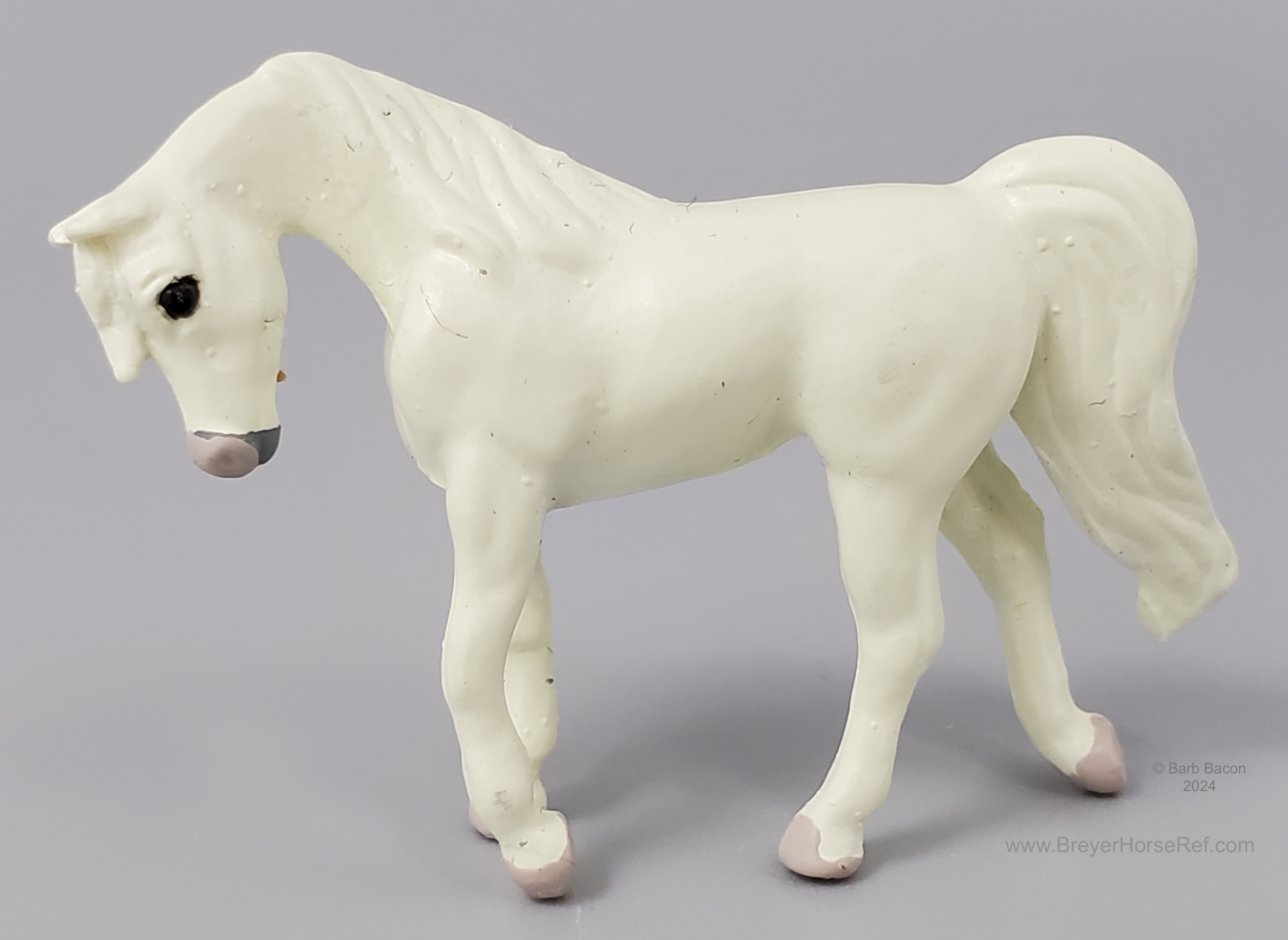 Alabaster with tan painted hooves and nose. This model was released in the Series I Arabian Set #3960, Winners Choice Micro Horses by Creata International. Per Artist Candace Liddy, the packaging was completed in 1996, however the models were not available until 1997. Breyer bought this mold in 2004.