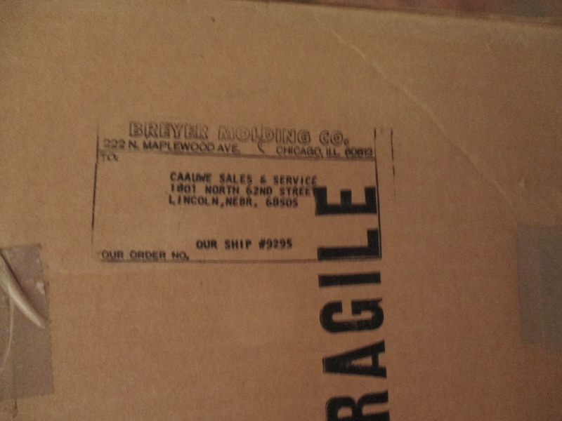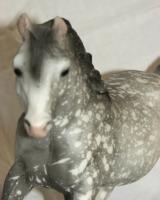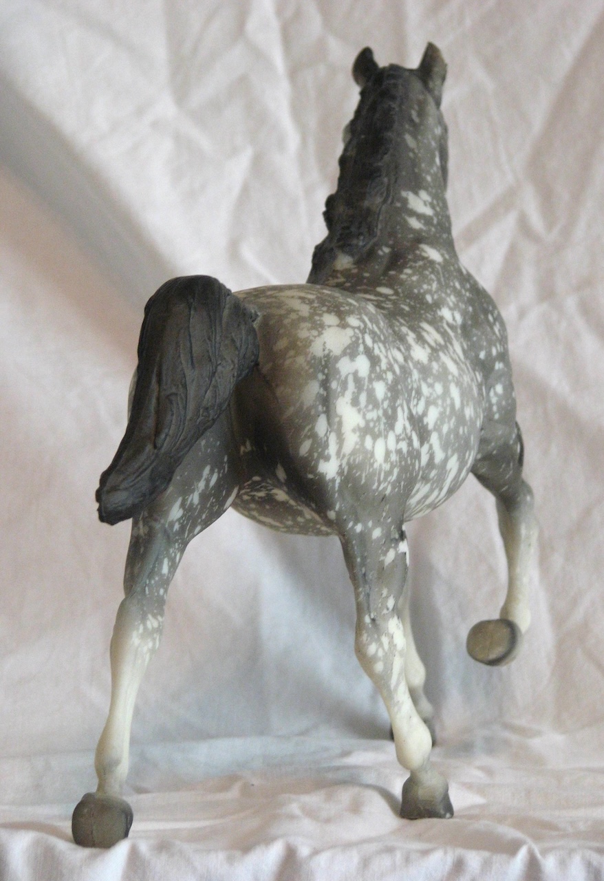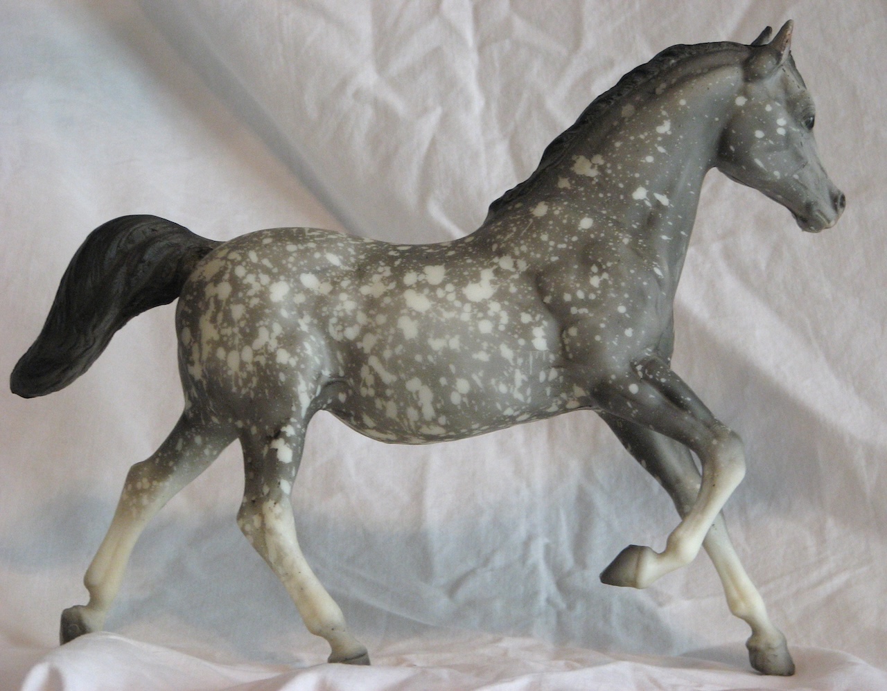 Matte dapple grey with darker mane and tail, 4 stockings with grey hooves, dappling on head and neck, and a bald face. Estimated 200 models distributed by Don Caauwe (pronounced 'Cow-ee'), of Caauwe's Sales and Service out of Lincoln, NE. Models are similar to the regular run, but typically have dapples on the neck and head, and have a matte finish. Was released in a set with a matching Running Foal.