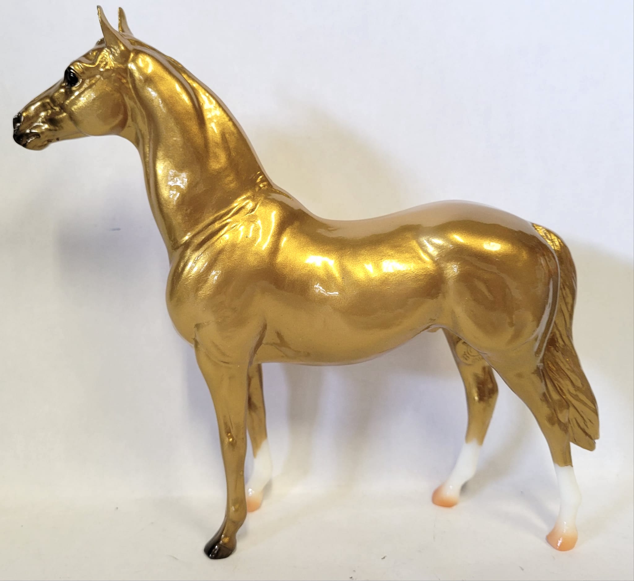 While most club members will receive the glossy chestnut version of Secretariat on Maureen Love Calvert’s Man o’ War (mold #602), 50 lucky collectors will celebrate his Golden anniversary with a rare glossy Gold Charm variation." www.breyerhorses.com.