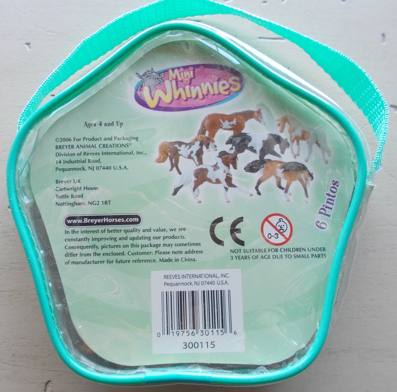 Mini Whinnies Pintos #300115 from 2006-2007, included the Cantering Morgan, Running Walk TWH, Standing QH, Trotting Morgan, Walking Arabian and the Pulling Draft. Released later in 2006, so not pictured in the catalog. This same set was released by Target as #720201.