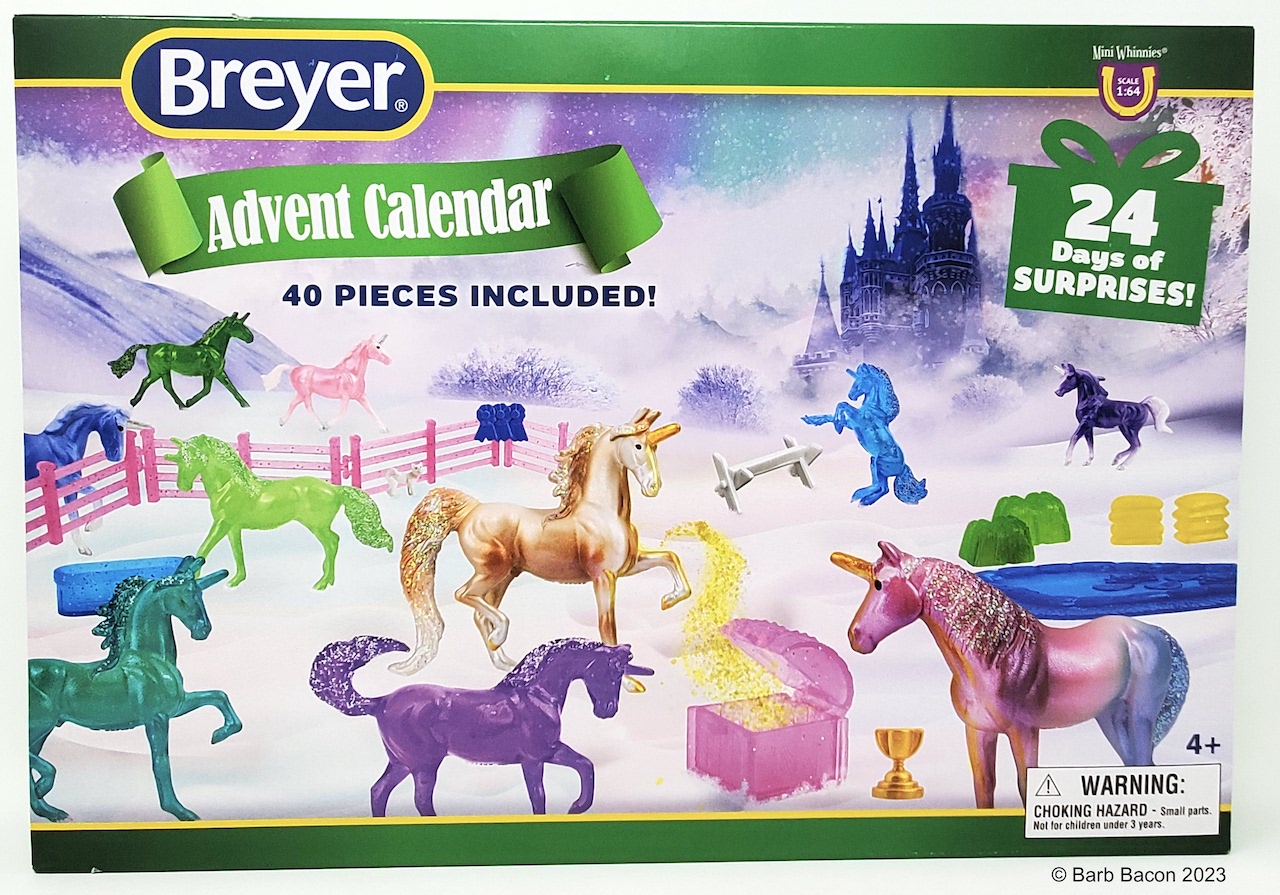 "Counting down the days until the excitement of Christmas has never been so much fun, or this magical! Each day, open one of the numbered doors of the Unicorn Magic Advent Calendar to reveal a new Mini Whinnies surprise. Hidden behind the doors are a total of 15 colorful Mini Whinnies unicorns, many exciting accessories, and even a special animal friend." www.breyerhorses.com.
