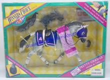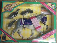 "Dancers Ghost: Light Dapple Grey Thoroughbred Stallion in trotting pose. Came with navy blue saddle blanket with pink edging and his name in pink. He wore that with a black rubber racing saddle. Dark brown rubber racing snaffle bridle and rubber, navy with pink edged, racing blinkers. He also had a wreath of rubber pink and red roses. His mane and forelock were braided and his tail wrapped and he wore four white with red and pink striped racing bandages. His extra mane, tail and forelock were loose and shaded dark grey. His name was a blending of his color, ghost like, and all the TB racehorses with Northern Dancer in their blood and Dancer in their name." Quoted by Candace Liddy, Sculptor and Artist. Mass Market Release.