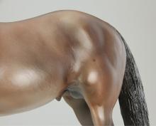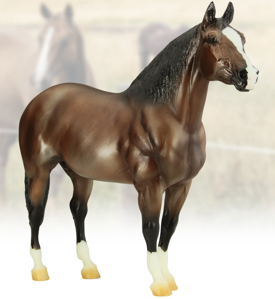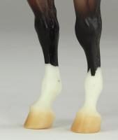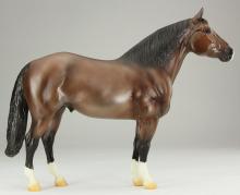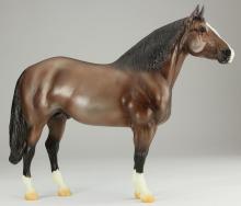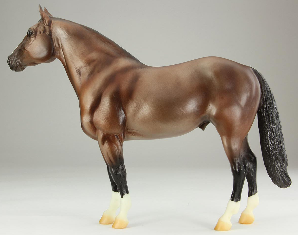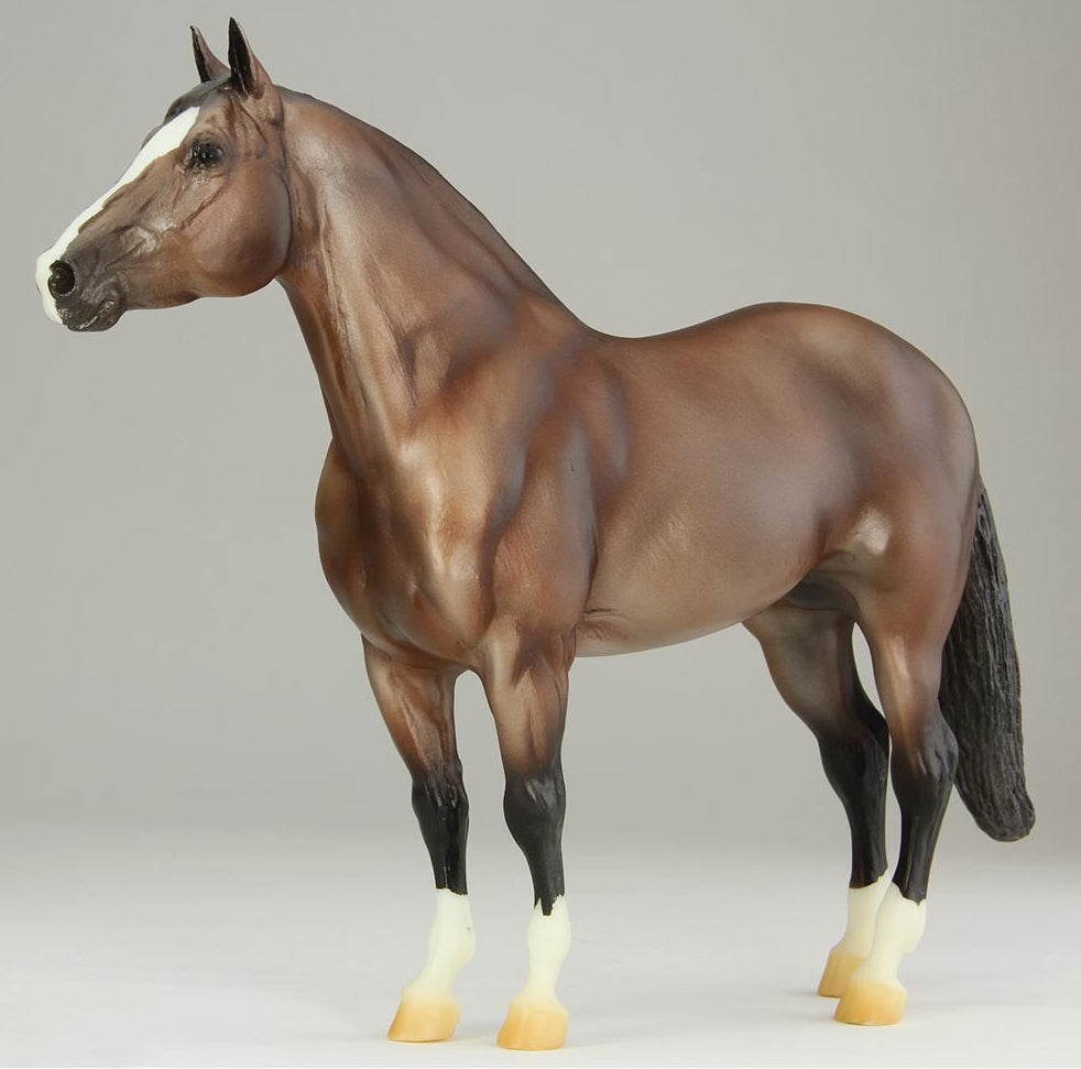 Adios (mold #50) is one of Breyer’s longest-running fan favorite sculptures! First introduced in 1969, his kind expression has been delighting horse lovers for over half a century. This particular piece likely dates to the late 2000s and is painted as a striking metallic brown bay with a blaze and four socks. He has been painted on whiteware marked with a U.S.A. stamp. As a true test run model, this piece does have some small flaws from use and handling. These include a tiny pinpoint mark on the right-side hip, a small shiny mark on the left side hip, and one small black mark each on the muzzle and inside left front sock. There is also a dash of silver paint under one hoof, but this is not visible when the model is standing. This piece of Breyer history is priced at $1,200 and comes with a certificate of authenticity." www.breyerhorses.com. Unknown date painted, but listed in 2023.