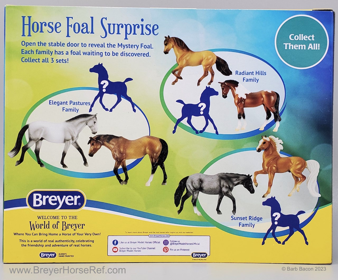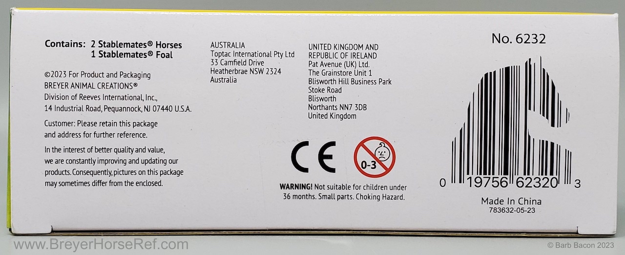 In 2023-2025, this model was part of the Stablemates Horse Foal Surprise #6232 - Radiant Hills Family. This set included a dun Paso Fino, a bay pinto Standing Thoroughbred and a chestnut pinto Scrambling Foal. Assortment #B-SM-10047 for the Surprise Families. Listed in the 2024 Winter Catalog as item #B-SM-10045. On the 2025 Retired List.