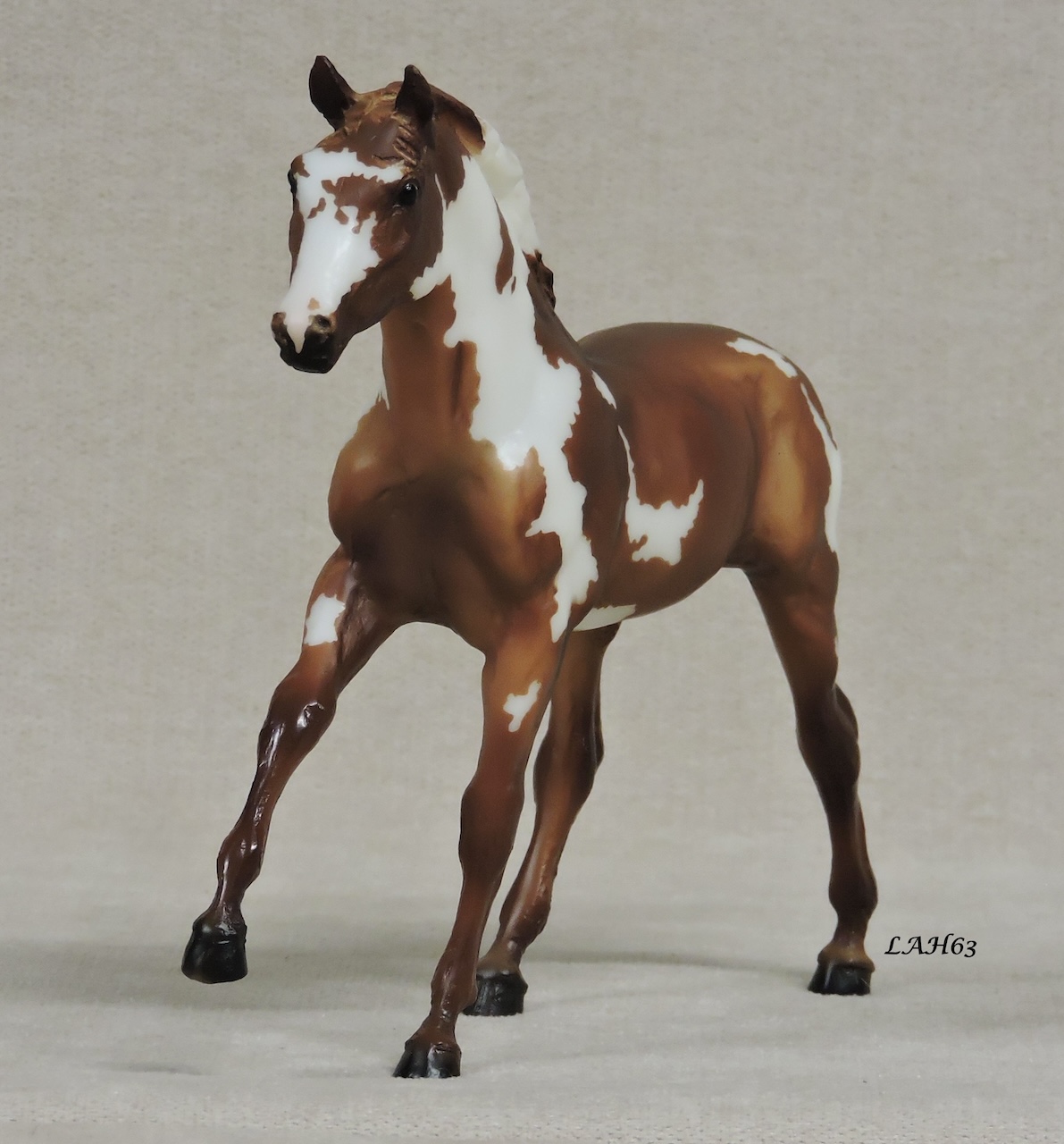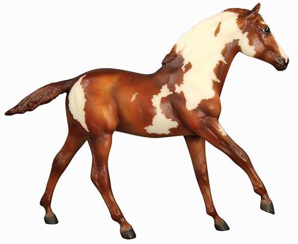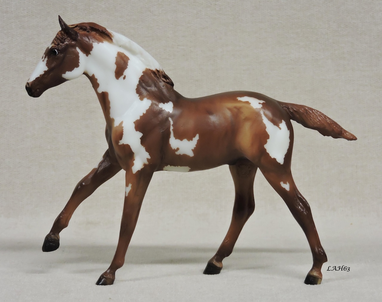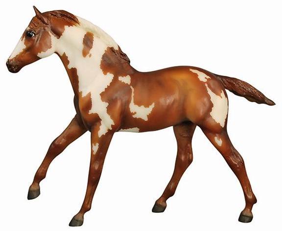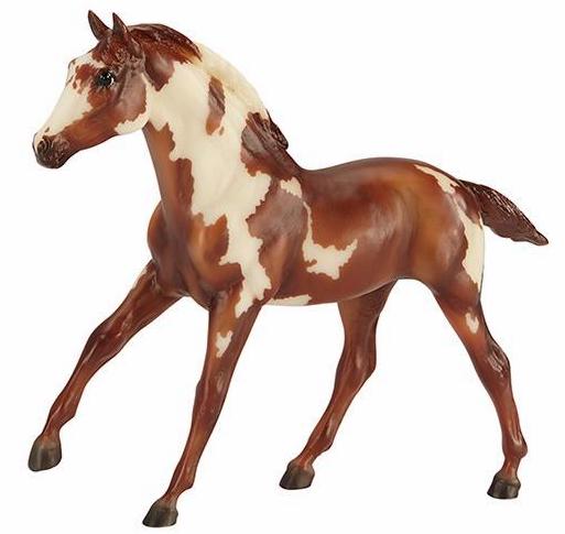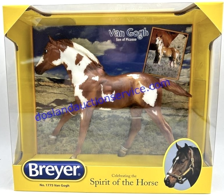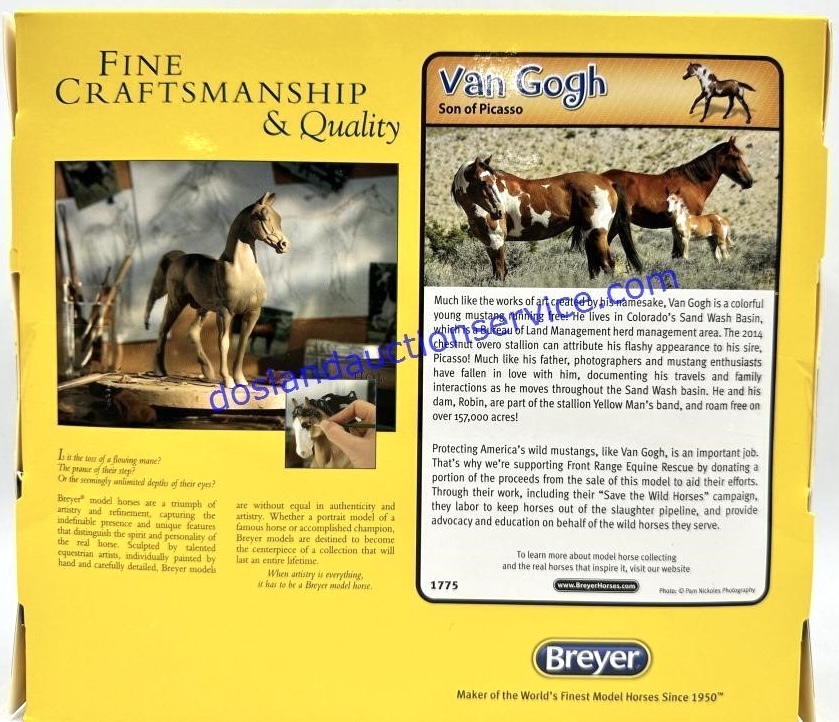 "Van Gogh is a colorful young mustang running free! He lives in Colorado's Sand Wash Basin, which is a Bureau of Land Management (BLM) herd management area. This 2014 chestnut overo attributes his flashy appearance to his sire, Picasso. Much like his father, photographers and mustang enthusiasts have fallen in love with him, documenting his travels and family interactions as he moves throughout the Sand Wash Basin. Van Gogh and his dam, Robin, are part of the stallion Yellow Man's band, and roam free over 157,000 acres." www.breyerhorses.com.