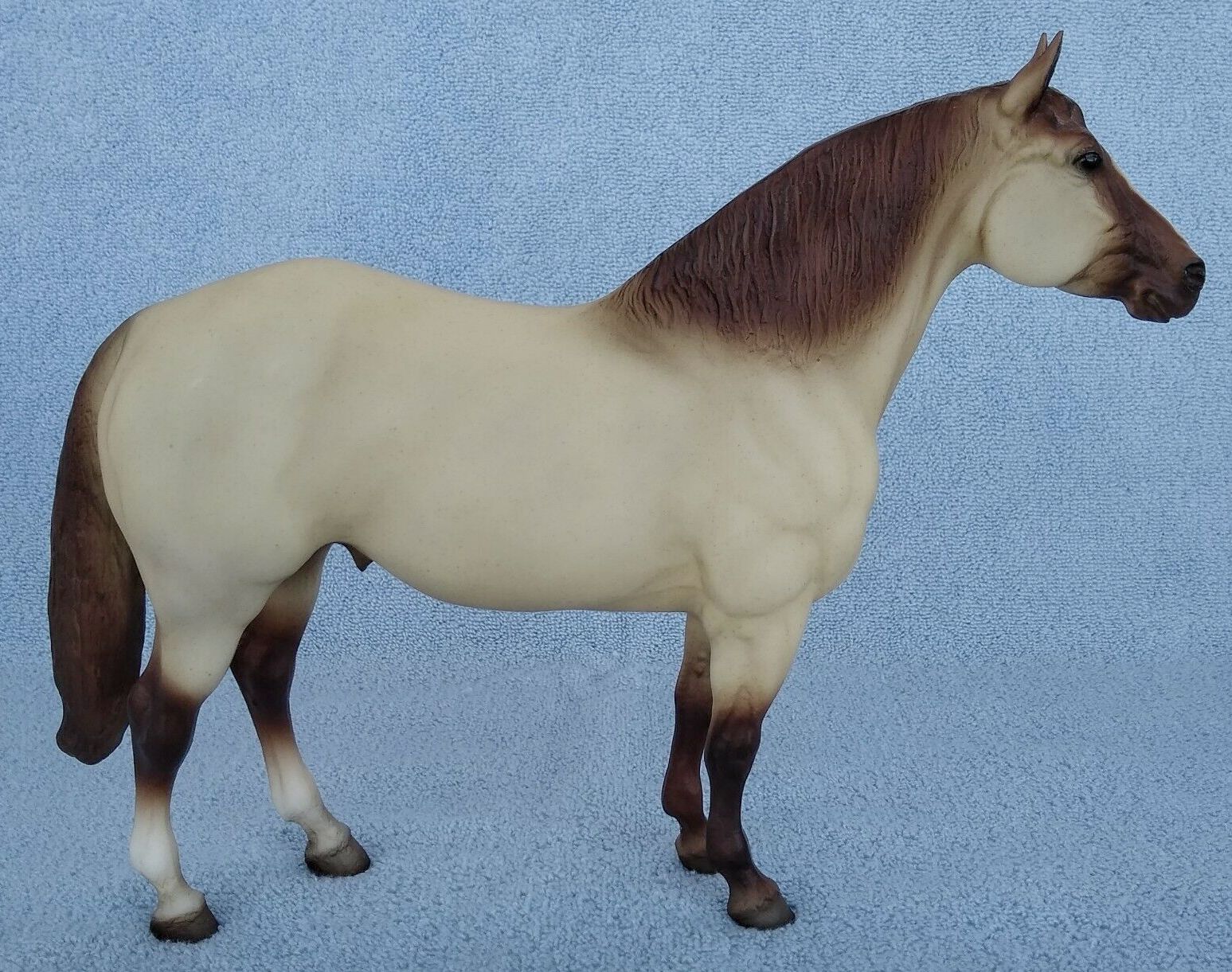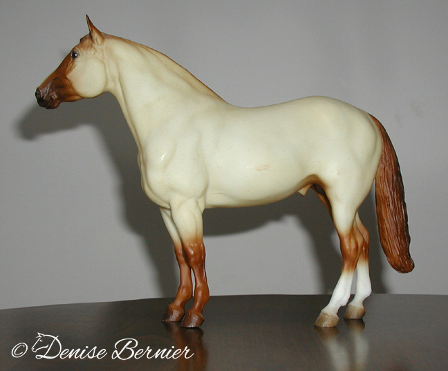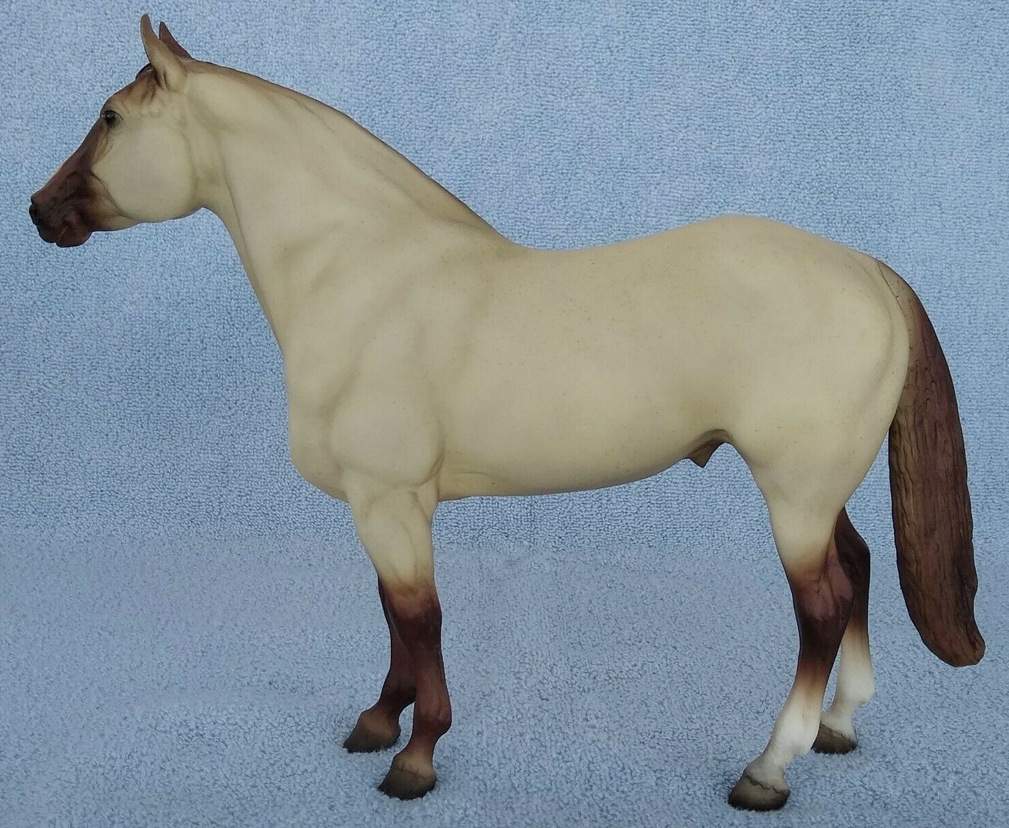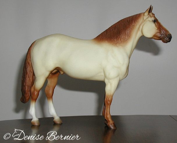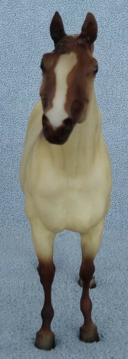 Dun with red to brown chestnut points and speckling, blaze and socks on the back legs. Added 'Roans' to color category to help with searching.