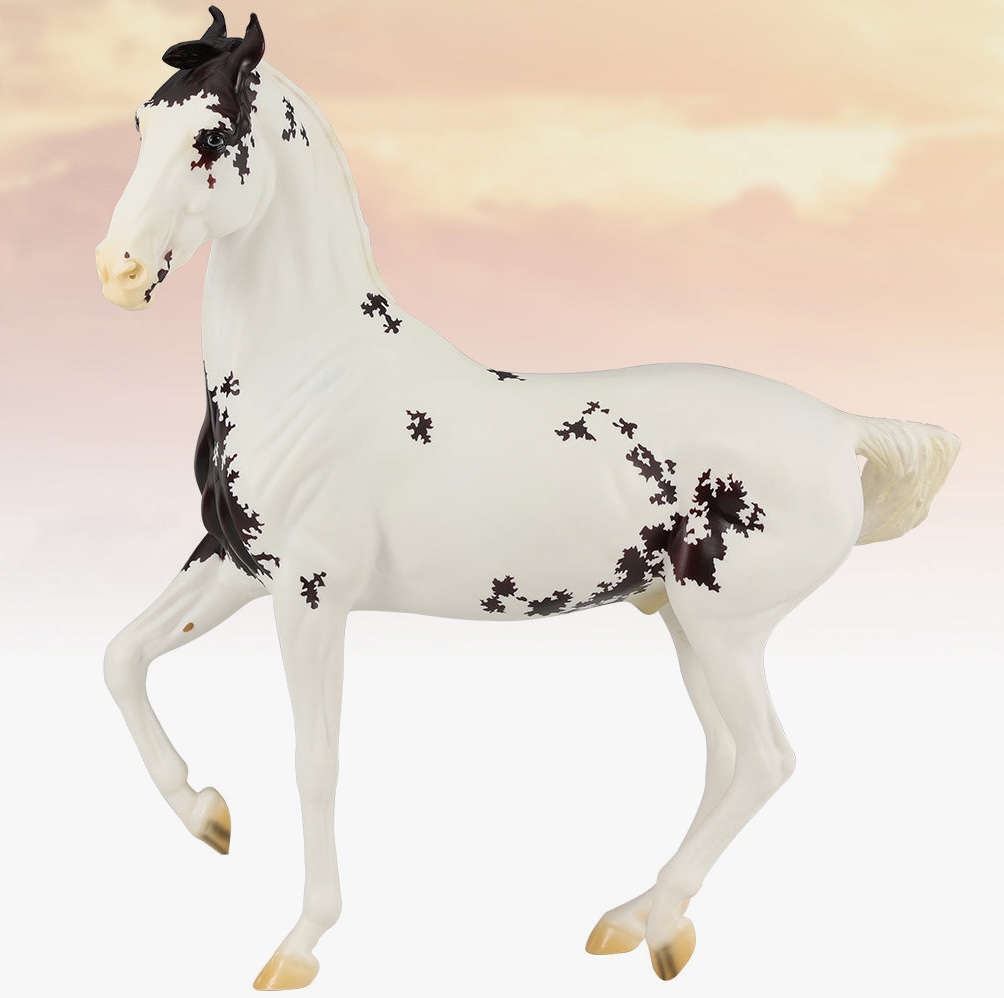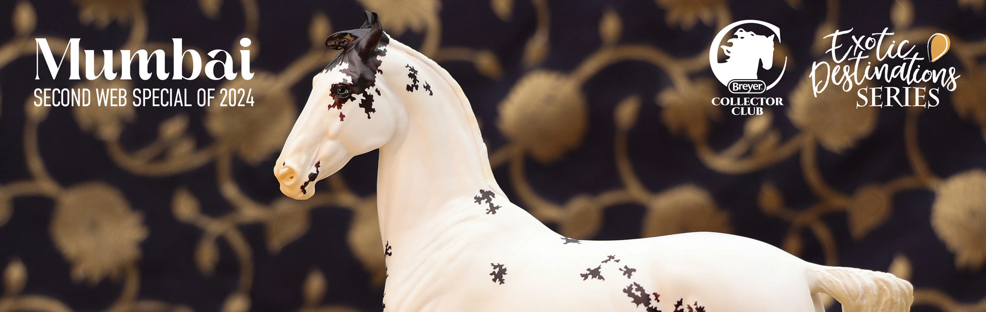 "Mumbai - The Second Release in the 2024 Exotic Destinations Series. Prepare to be taken to some of the most beautiful destinations around the world – in equine form! Artist Sommer Prosser has dreamed up a new series highlighting both the beauty of our world and the horses that inhabit it. An ancient city with a long and storied history, Mumbai was once considered one of the most exciting and unique destinations in the world. Today the port city is filled with ornate temples, universities, nature parks, and is home to the Bollywood film industry. Breyer’s Exotic Destinations Series brings you Mumbai, a fine Marwari horse. Native to India, this breed is known for their curved ears and outstanding endurance. Today the Marwari horse can often be found dressed in colorful decorated blankets and they participate in many celebrations. Colorful horses, including pintos and flashy markings like large blazes and white socks, are prized within the breed.