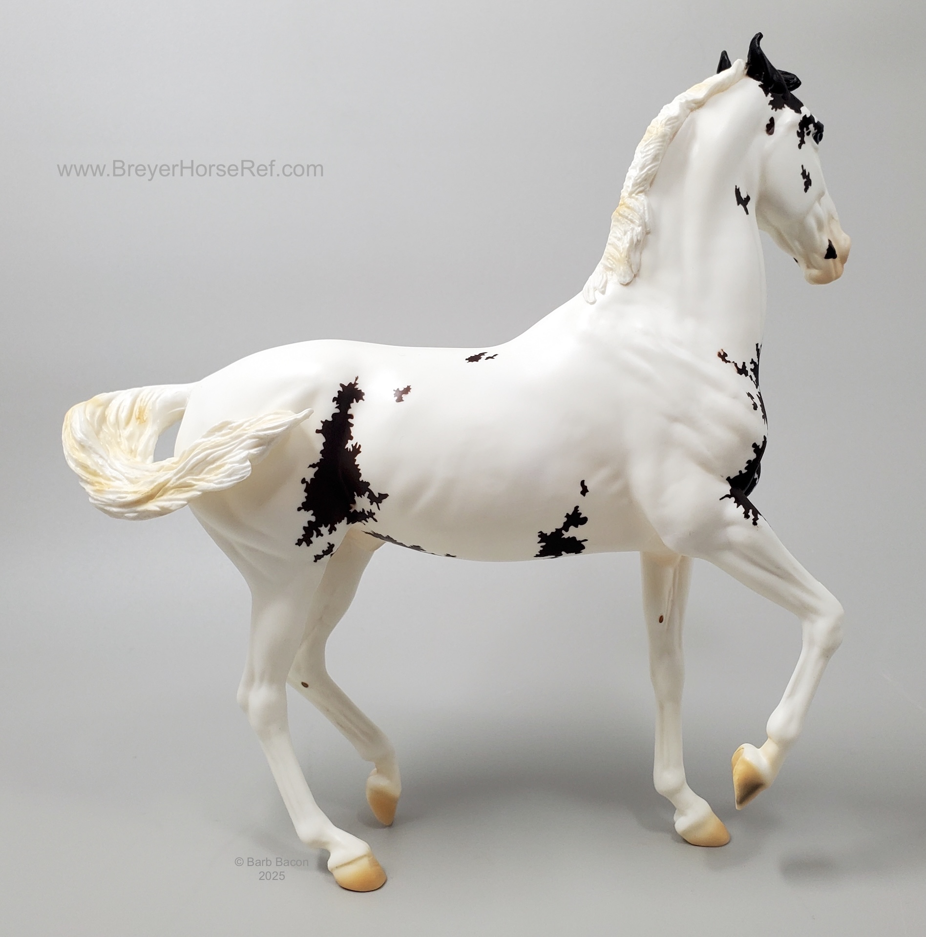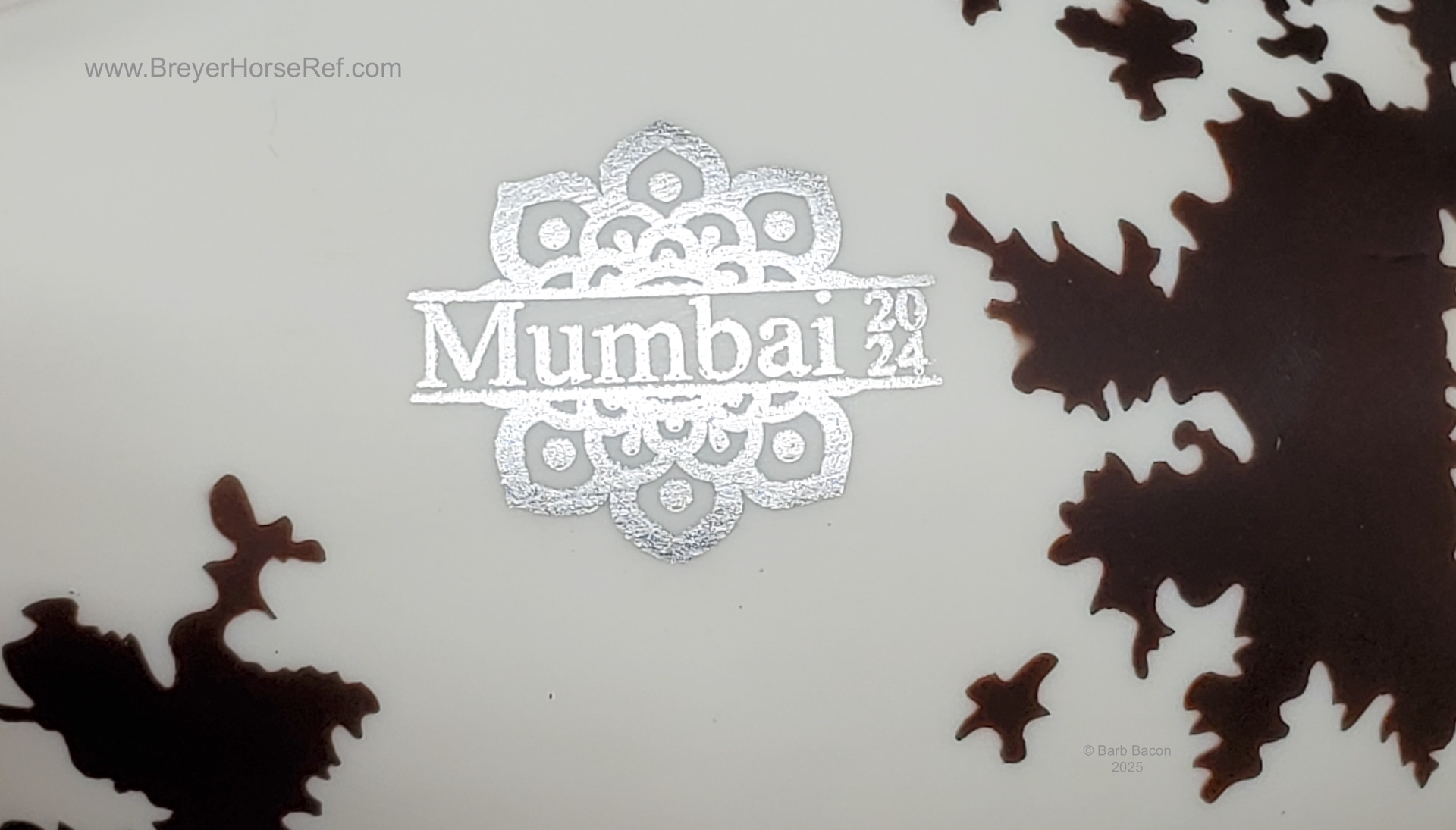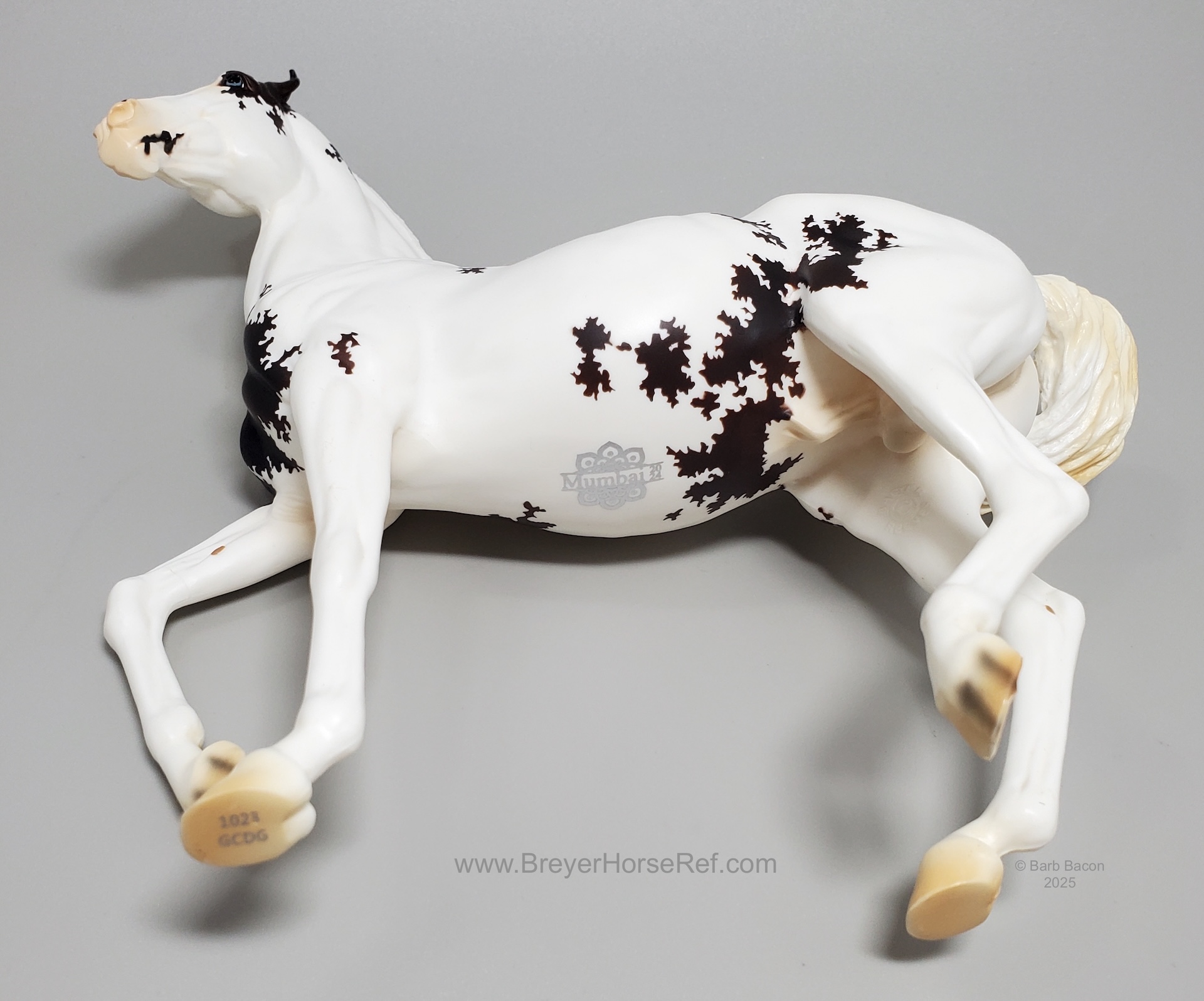 This flashy bay sabino stallion features "Mumbai 2024" on his belly in silver. Price: $195.00 Limited Edition: 600 pieces" www.breyerhorses.com.