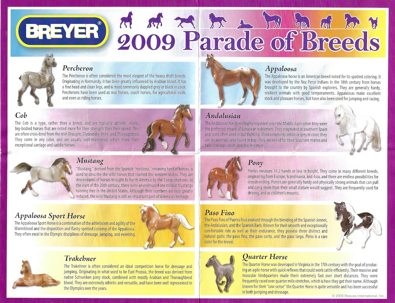 In 2009, this set was released through JC Penney as the 10 piece Parade of Breeds VI Set #410512 (JCP #671-1035) and included a poster of the models. The set included a light grey Andalusian, dapple grey Belgian, charcoal grey Cantering Foal, palomino appaloosa Cantering Warmblood, bay Friesian, chestnut Highland Pony, palomino Lying Foal, bay roan Mustang, black pinto Paso Fino and a chestnut appaloosa Standing Stock Horse.