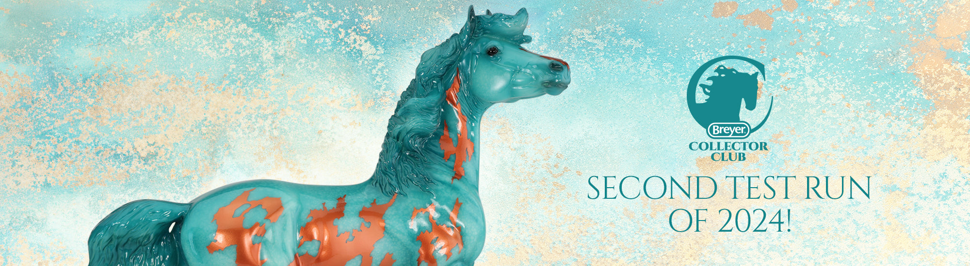 "In 2019 we released Bisbee, a limited-edition decorator model inspired by Bisbee turquoise from Arizona. Found in the Lavender Pit copper mine, this turquoise is prized for its unique copper veining which is represented by copper-toned pinto markings on this unique mare. When developing this model, we tested both a matte and glossy finish – ultimately the final model was released with a matte finish and the glossy test piece has remained in the Breyer Archive since then. It’s now time for her to find a new home with a Breyer Collector Club member! This piece is priced at $1,000 and comes with a certificate of authenticity." www.breyerhorses.com. Second test run released to the Collector Club for 2024.